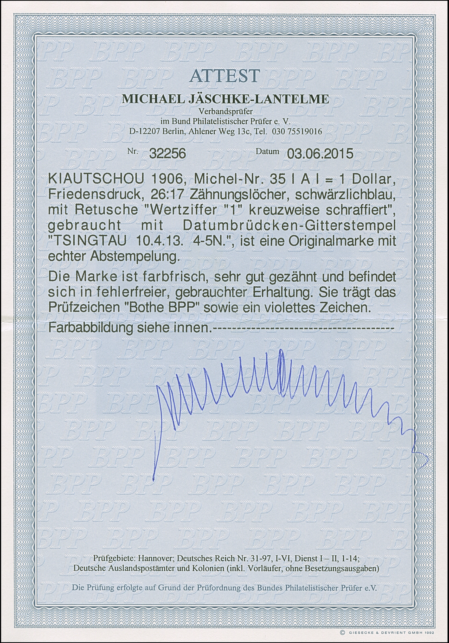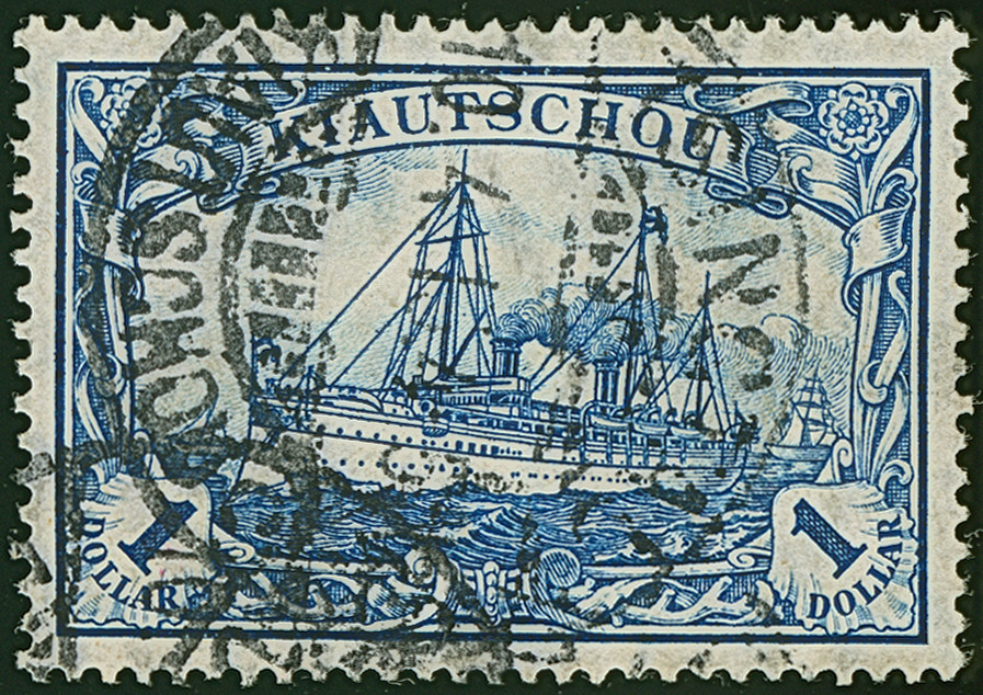 1905, Kaiseryacht 1 $. schwärzlichblau, 26:17 Zähnungslöcher, mit Retusche “Wertziffer 1 kreuzweise schraffiert”, farbfrisch und sehr gut gezähnt, sauber mit Stempel “TSINGTAU 10.4. 13” entwertet, tadellos, u.a. sign. Bothe BPP sowie Fotoattest Jäschke-L. BPP (2015)