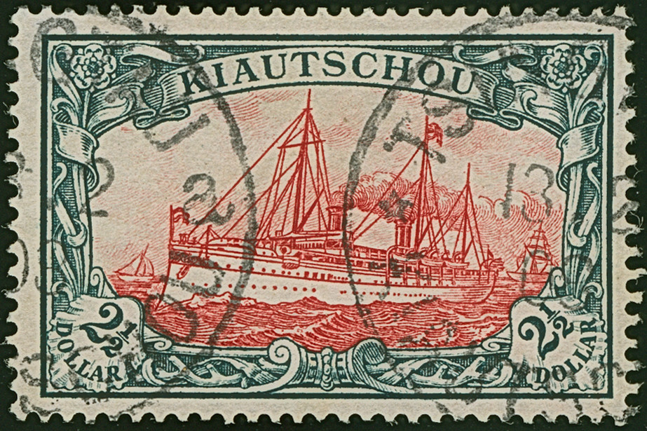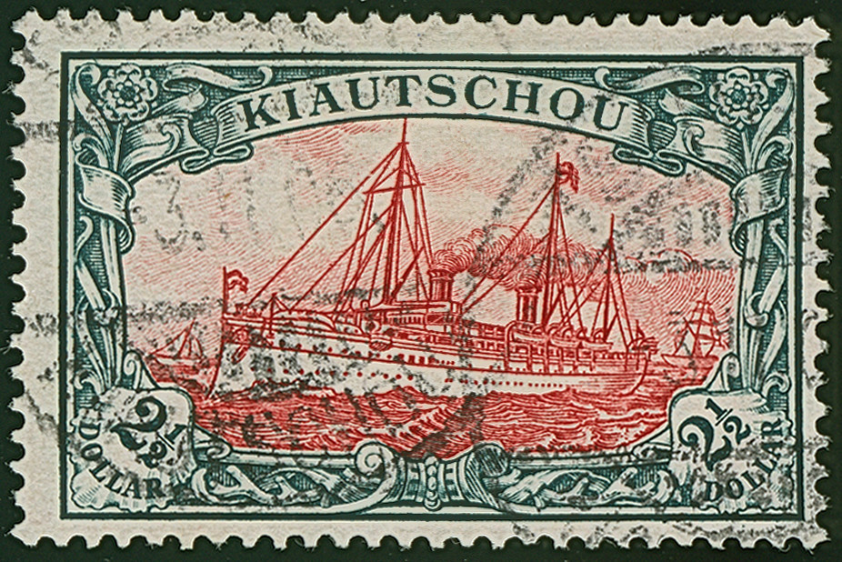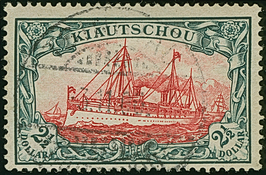 1905, Kaiseryacht 2½ $. grünschwarz/dunkelkarmin, 26:17 Zähnungslöcher, farbfrisch und gut gezähnt, sauber mit EKr. “TSINGTAU 31.2 08” entwertet, tadellos, ein schönes Stück dieser seltenen Marke, sign. Kilian sowie Fotoattest Jäschke-L. BPP (2017)