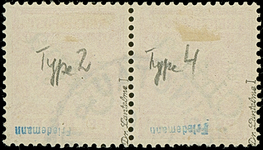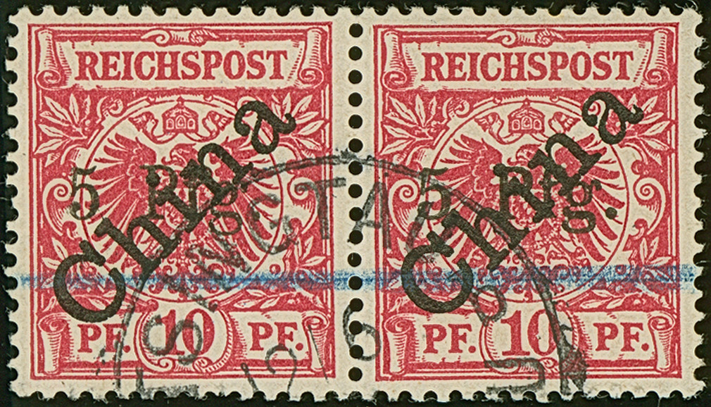 1900, 5 Pfg. auf Diagonalaufdruck 10 Pfg. im waagerechten Paar, linke Marke mit Aufdrucktype 4, rechte Marke mit Aufdrucktype 2, sauber gestempelt, senkrecht leicht vorgefaltet, in einwandfreier Erhaltung. Die Aufdrucktype 5 kommt nur einmal im Halbbogen vor, ein interessantes Typenpaar, sign. Dr. Lantelme