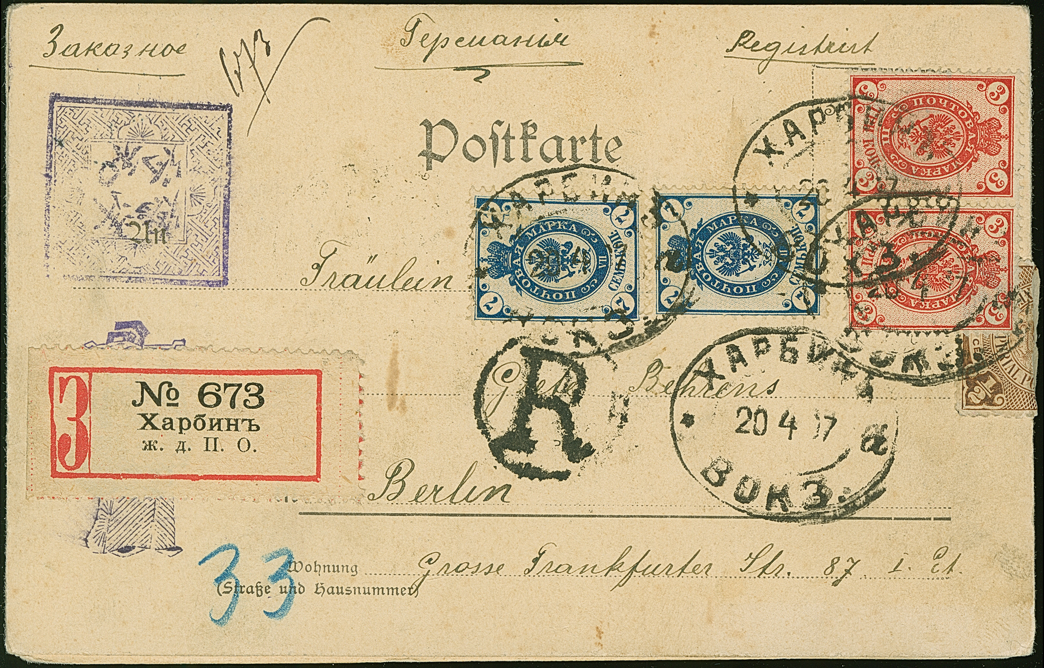 1917, Russland 3 Kop. lebhaftrosarot im waagerechten Paar und zwei Einzelmarken 7 Kop. dunkelblau je mit Ovalstempel “HARBIN 20.4.17” auf vierteiliger Panorama-Ansichtskarte von Tsingtau mit viel Text in Deutsch und neuer Datierung “Charbin 20.4.17” als R-Karte nach Berlin mit Ankunftsstempel. Die Karten sind zum Teil angetrennt, aber ansonsten in guter Gesamterhaltung