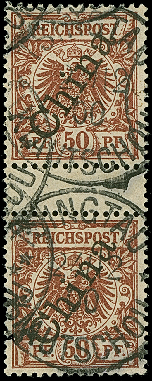 1900, Krone/Adler 50 Pfg. lebhaftrötlichbraun, Zwischenstegpaar, sauber mit Stempel “TSINGTAU KIAUTSCHOU ** 24 12 00”, untere Marke mit Eckzahnfehler, sonst tadellos, Fotoattest R. F. Steuer BPP (2009)