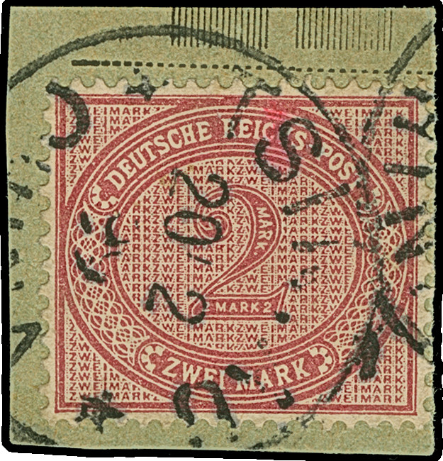 1898/1901, 2 M. dunkelrotkarmin, farbfrisch und gut gezähnt, sauber mit EKr. “TSINGTAU 20/2 99” auf Paketkartenausschnitt, tadellos, u.a. sign. Bothe BPP