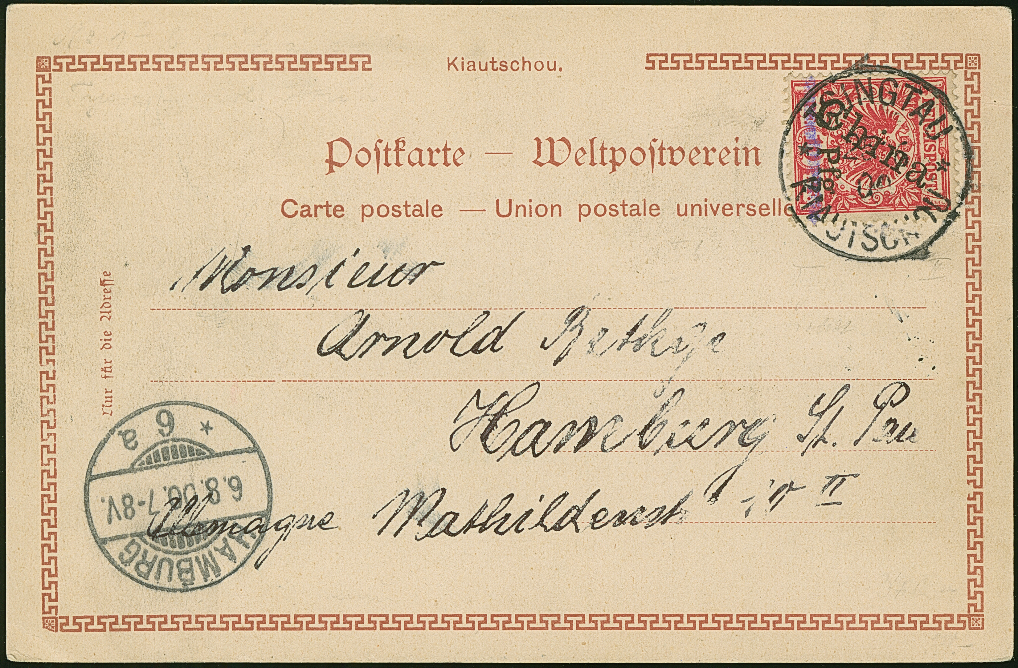 1900, 1. Tsingtau-Ausgabe, Steiler Aufdruck, 5 auf 10 Pfg. lebhaftlilarot, Aufdrucktype 2, violetter Strich, farbfrisch und gut gezähnt, sauber mit Stempel “TSINGTAU 25 6 00” auf Bildpostkarte nach Hamburg mit Ankunftsstempel, übliche, leichte Beförderungsspuren, tadellos, Fotoattest Jäschke-L. BPP (2020)
