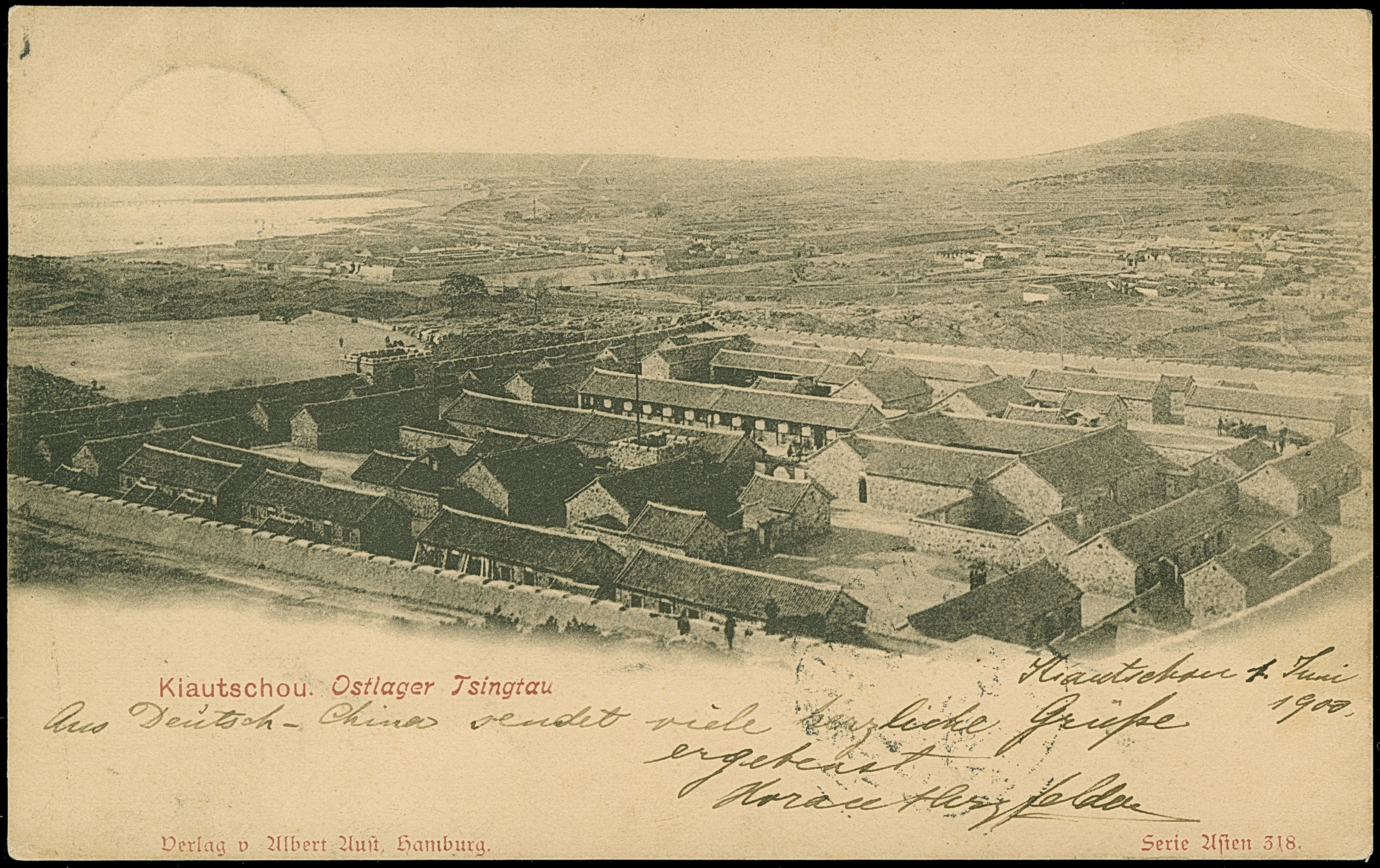1901, Kaiseryacht 5 Pfg. im waagerechten Paar mit Stempel “TSINGTAU KIAUTSCHOU ** 26.5.03” auf vierteiliger Panorama-Karte von Tsingtau mit viel Text zum Brieftarif freigemacht nach Deutschland mit zweifacher Nachsendung und entsprechenden Vermerken und Stempeln. Die Karte mit leichten Flecken, ansonsten in guter Gesamterhaltung