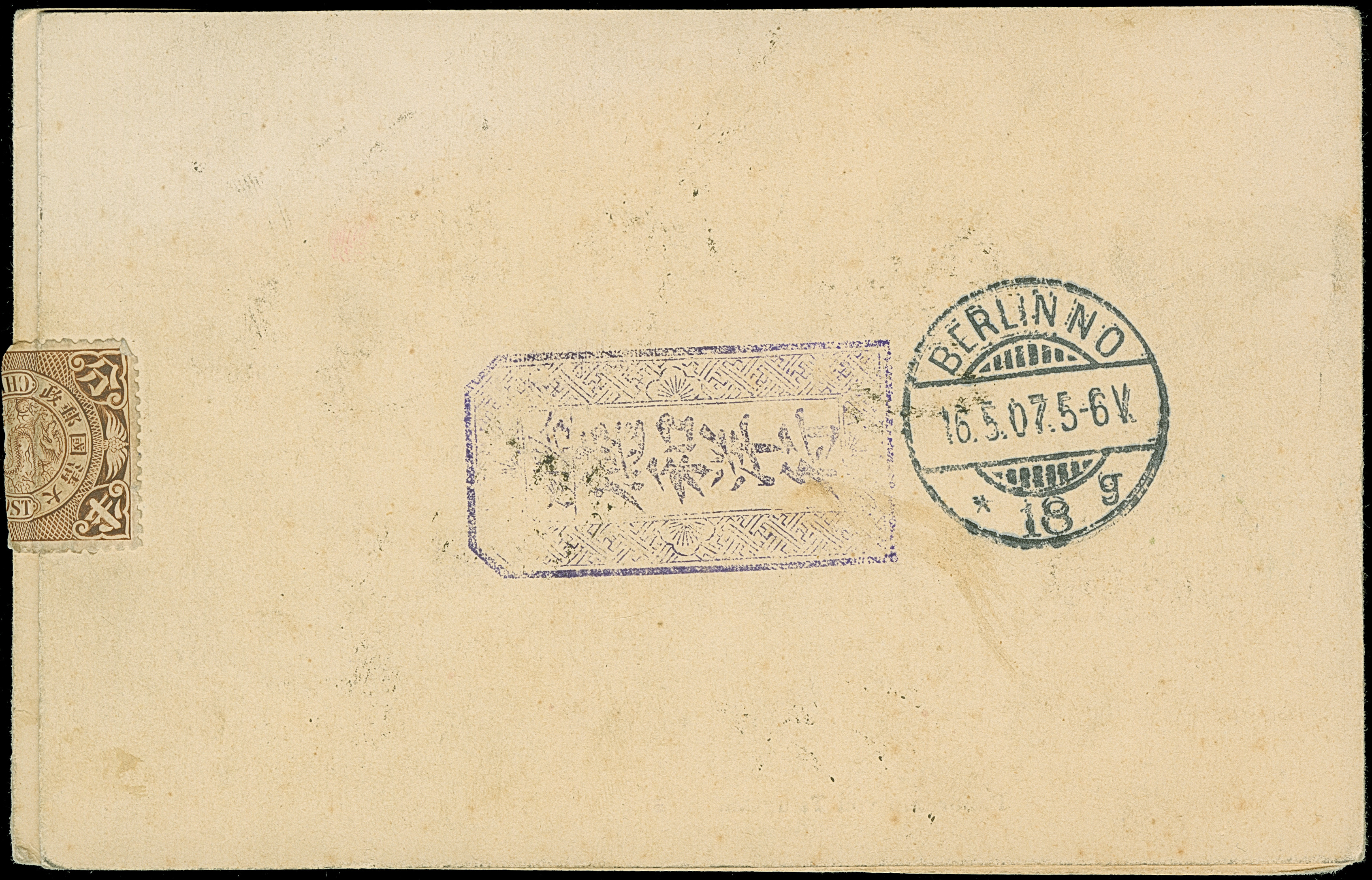 “DSP SCHANGHAI-TIENTSIN” ohne Kennbuchstaben und Datum auf Kaiseryacht 5 Pfg. auf Ansichtskarte mit Text und weiteren Abschlägen sowie Absenderstempel “Walther Schmidt Tsingtau” anch Altona. Die Karte oben mit einer leichten Verfärbung, ansonsten in guter Erhaltung. Eine sehr seltene Verwendung dieses Behelfs-Schiffspoststempels auf Karte