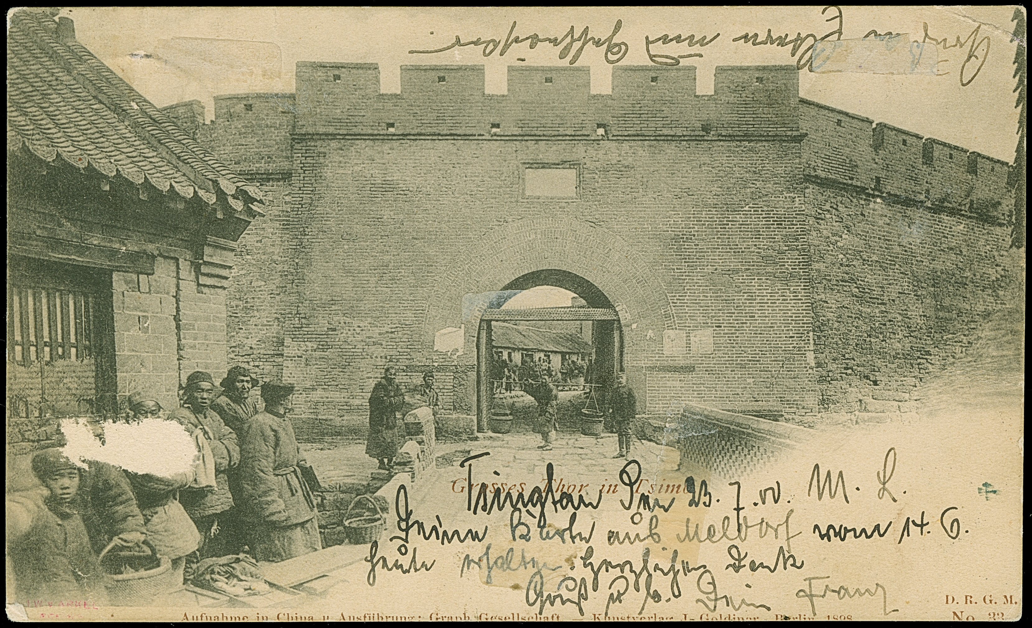 1900, 2. Tsingtau-Ausgabe 5 Pf. auf 10 Pfg. lebhaftlilarot, Aufdrucktype 1, farbfrisch und gut gezähnt, sauber mit klarem EKr. “TSINGTAU 23 7 00" auf winzig verkürzter Ansichtskarte “Grosses Thor in Tsingtau” nach Meldorf mit Ankunftsstempel, die Karte leichte Schürf- bzw. Beförderungsspuren, ein schönes und seltenes Ganzstück, sign. Willmann sowie Fotoattest Jäschke-L. BPP (2014)