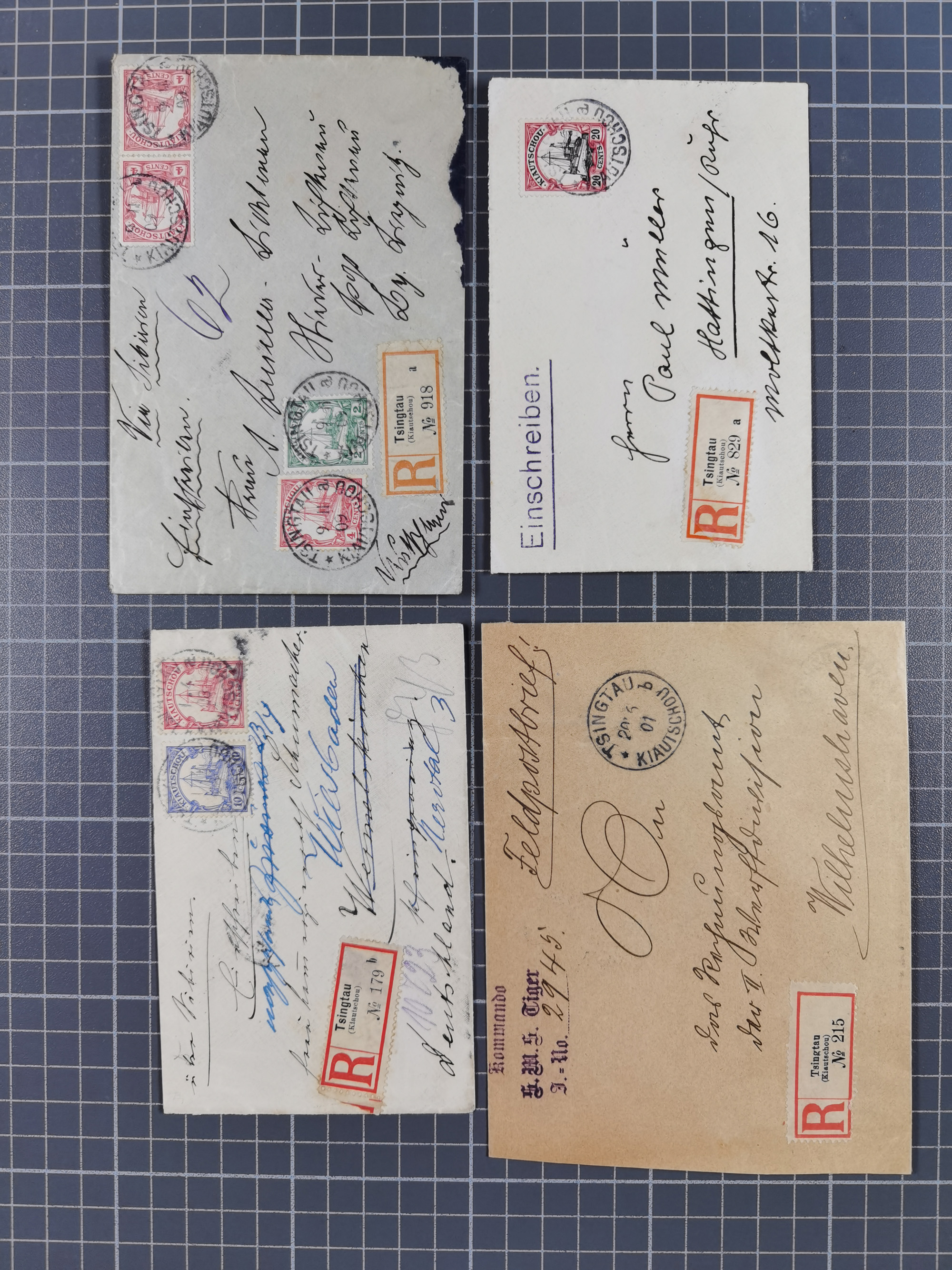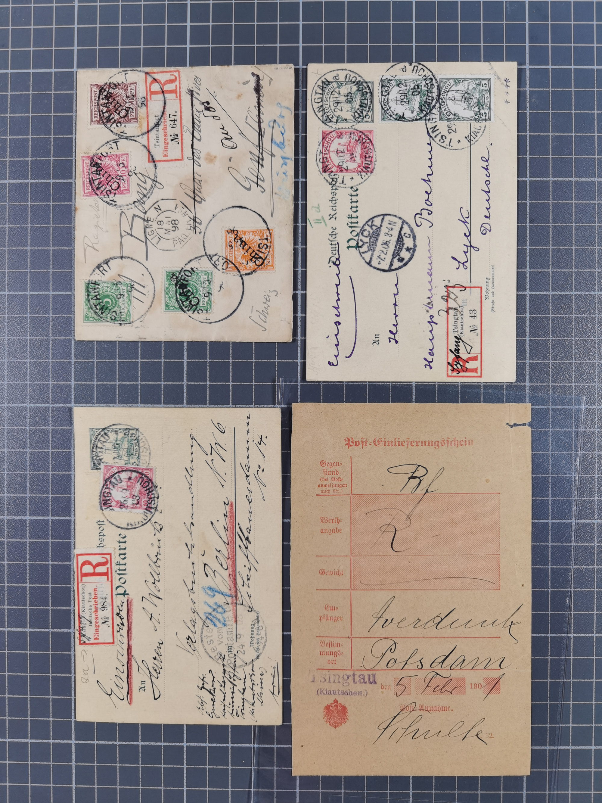 1898/1913, Partie mit 10 R-Briefen/Karten und einem Posteinlieferungsschein mit blauem L2 “Tsingtau (Kiautschou)”. Dabei bunt frankierter R-Brief 1898 mit Stempel “TSINTANFORT” via München nach Genf (sign. Mansfeld und Bothe BPP) und zwei R-GSK (1x ohne Text, 1x unterfrankiert) jeweils mit handschriftlichem Vermerk “Syfang” auf R-Zettel von Tsingtau, meist in guter Erhaltung