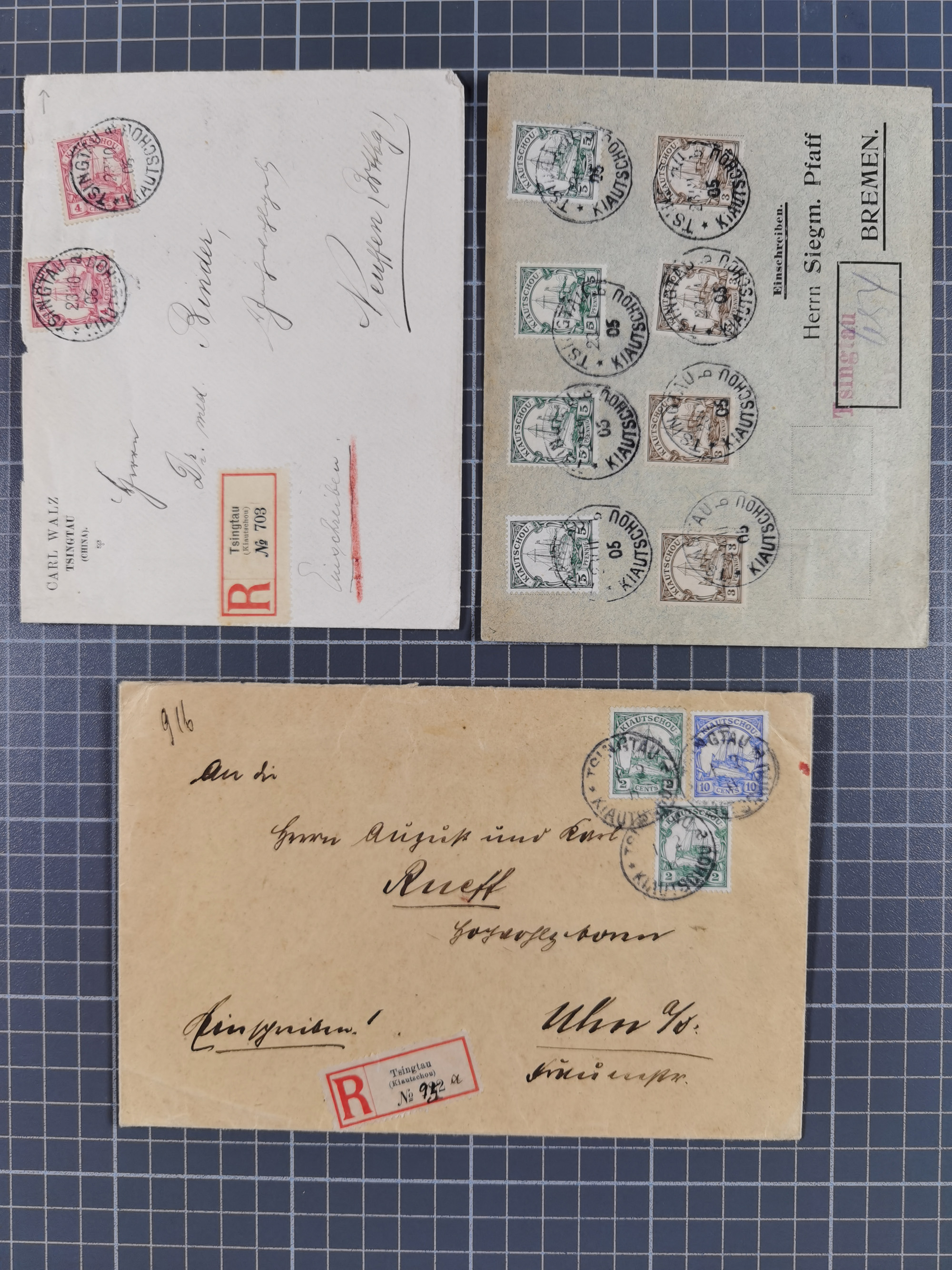 1889/1910 (ca.), Sammlung mit über 75 Briefen und Karten, inkl. Kiautschou, mit Vorläufern, Feldpost- und Schiffspost, interessanten Mehrfach- und Mischfrankaturen, R-Brief und weiteren Besonderheiten, dabei u.a Mi.-Nr. V42c 3er-Streifen mit “KAISERLICH DEUTSCHE POSTAGENTUR SHANGHAI 15 2 89” auf Brief nach Berlin (FA Steuer BPP), 5 Pfg. Ganzsachekarte mit “TSINGATAU-KIAUTSCHOU BAHNPOST” und nebegesetztem 2Kr. “TSCHIANGLING DEUTSCHE POST” und “K.D.FELD POSTSTATION N°1”, etc., zum Teil leicht unterschiedlich, meist aber in schöner Gesamterhaltung, ein empfehlenswertes Objekt