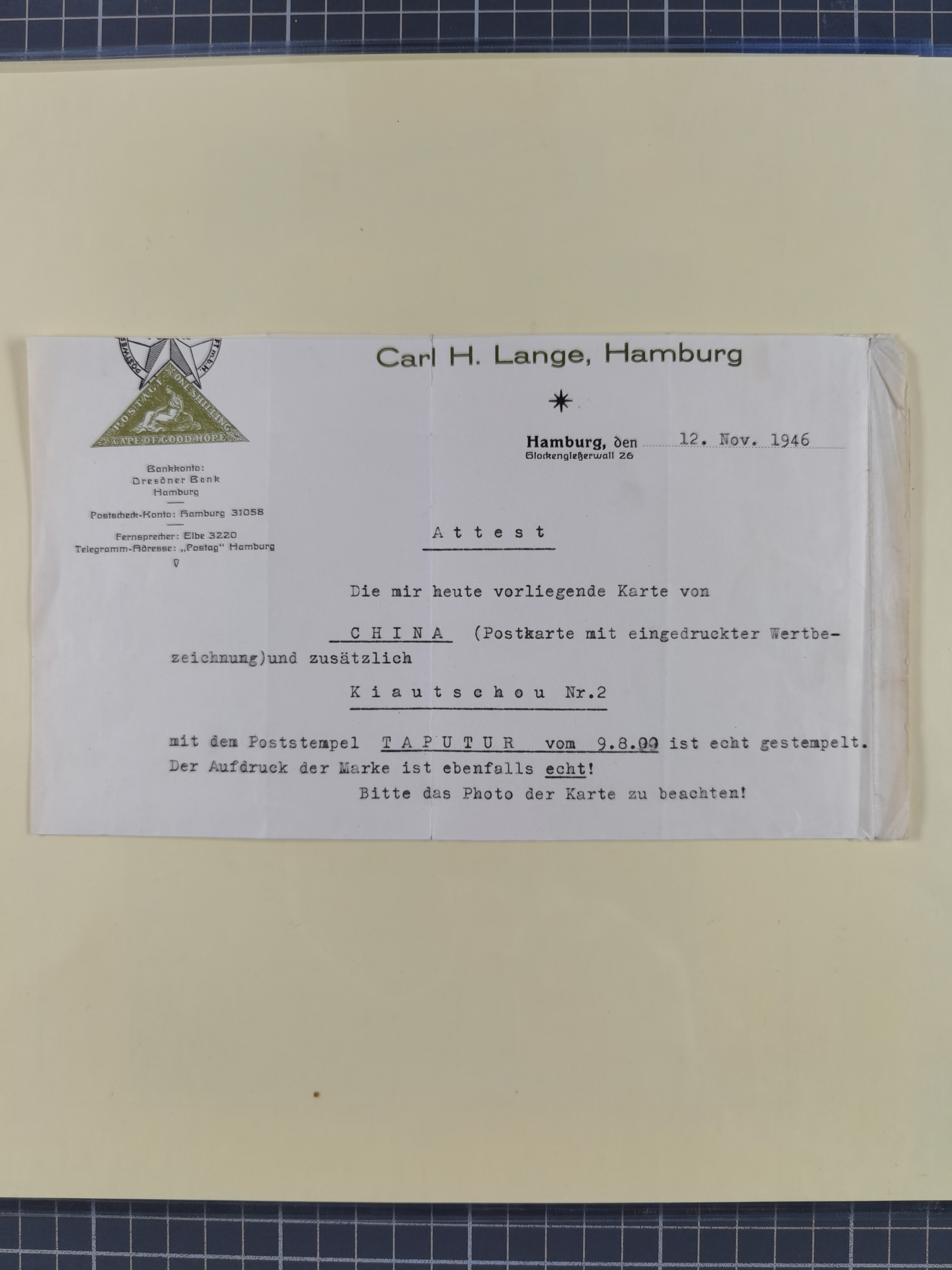 1905, Kaiseryacht 40 C., Unterrandstück mit HAN “H2657”, sauber mit EKr. “TSINGTAU 9/2 08” auf kleinem Briefstück, tadellos, eine mit HAN sehr seltene Marke, ProFi hat nur zwei weitere Stücke registriert, sign. Dr. Steuer VÖB