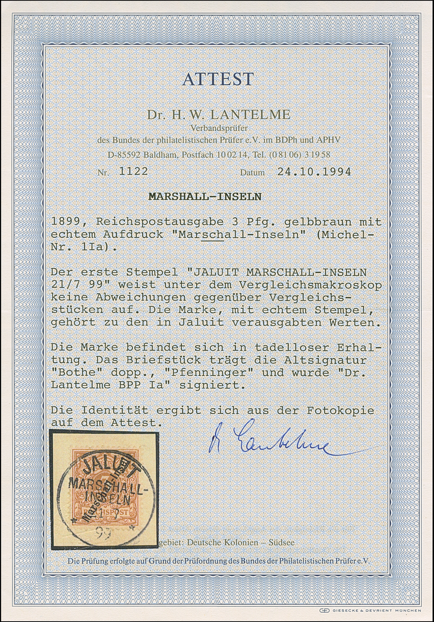 1897/1900, Diagonalaufdruck 3 Pfg. hellockerbraun mit klarem Stempel “JALUIT MARSCHALL-INSELN 21.7.99” auf Briefstück. Die farbfrische Marke ist in einwandfreier Erhaltung, signiert Pfenninger, Bothe und Dr. Lantelme mit Fotoattest (1994)