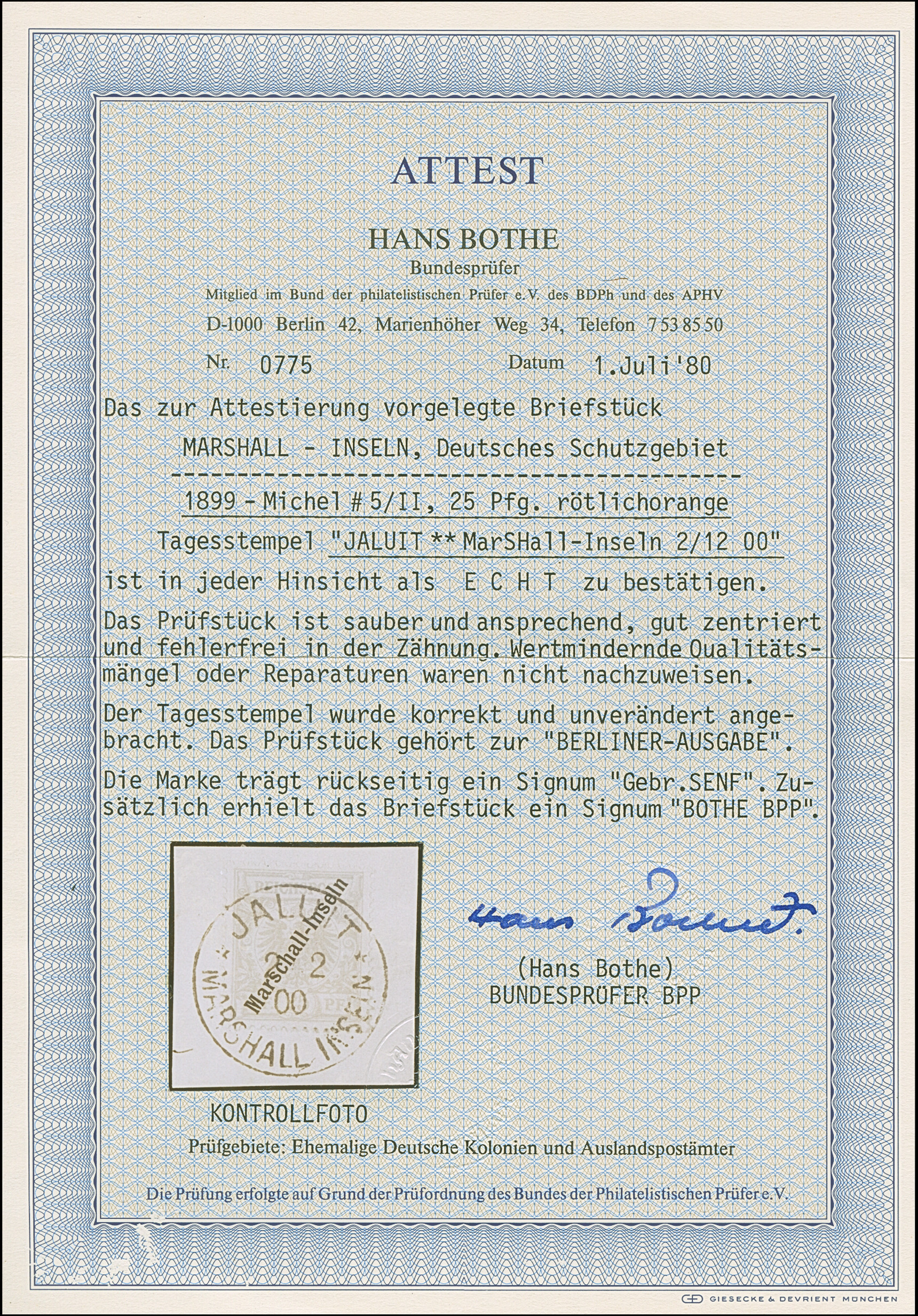 1899, Berliner Ausgabe 25 Pfg. gelblichorange mit klarem Stempel “MARSHALL-INSELN 2.2.00” auf Briefstück in tadelloser Erhaltung, signiert Bothe BPP mit Fotoattest (1980)