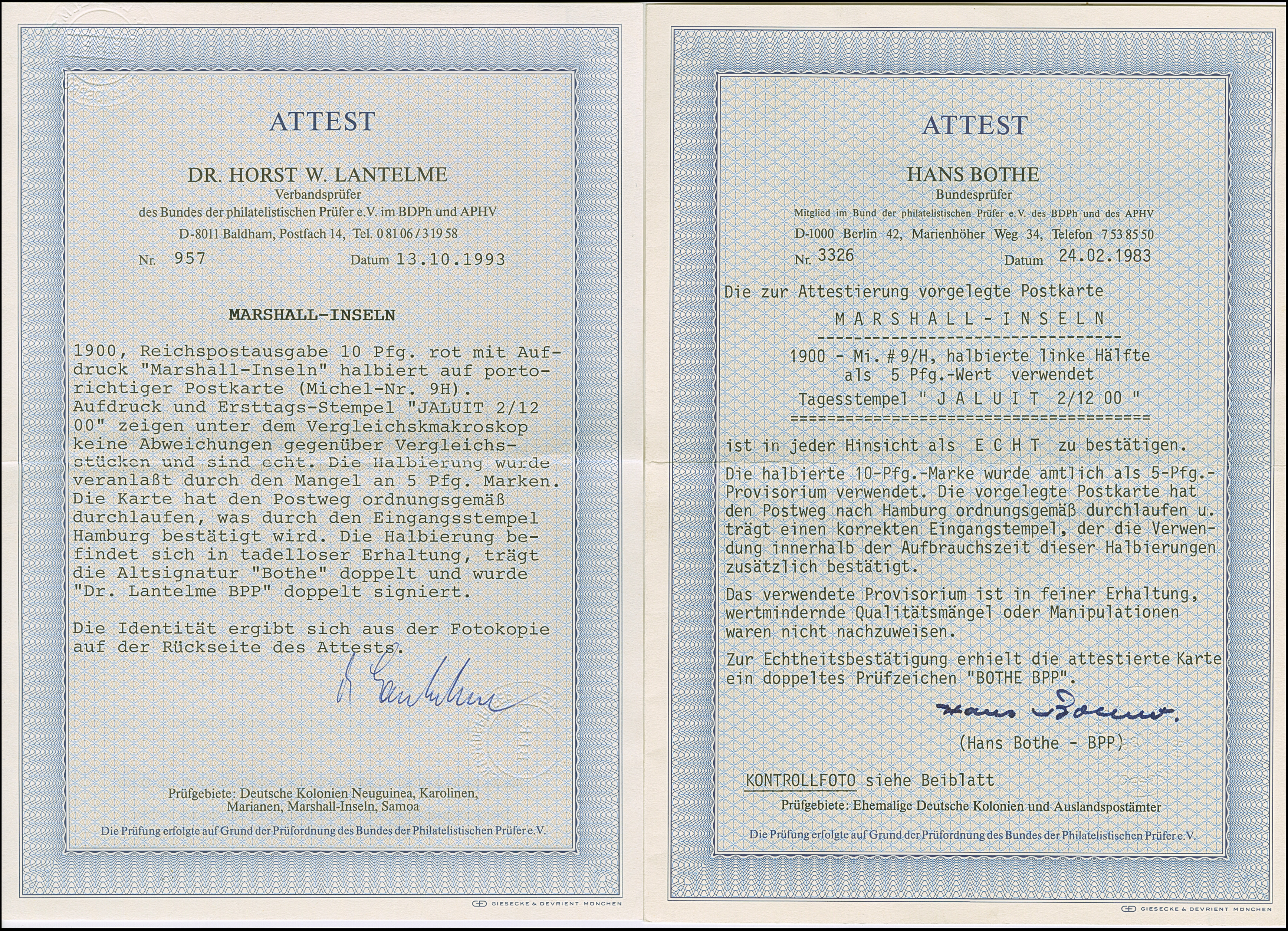 1900, 10 Pfg. senkrecht halbiert, linke Hälfte mit Stempel “JALUIT MARSHALL-INSELN 2.2.00” auf Ansichtskarte mit Grußtext nach Hamburg mit Ankunftsstempel. Die Kartenecken leicht eckrund, die farbfrische Halbierung ist gut gezähnt und in einwandfreier Erhaltung, doppelt signiert Bothe BPP und Dr. Lantelme BPP mit Fotoattest (1993)