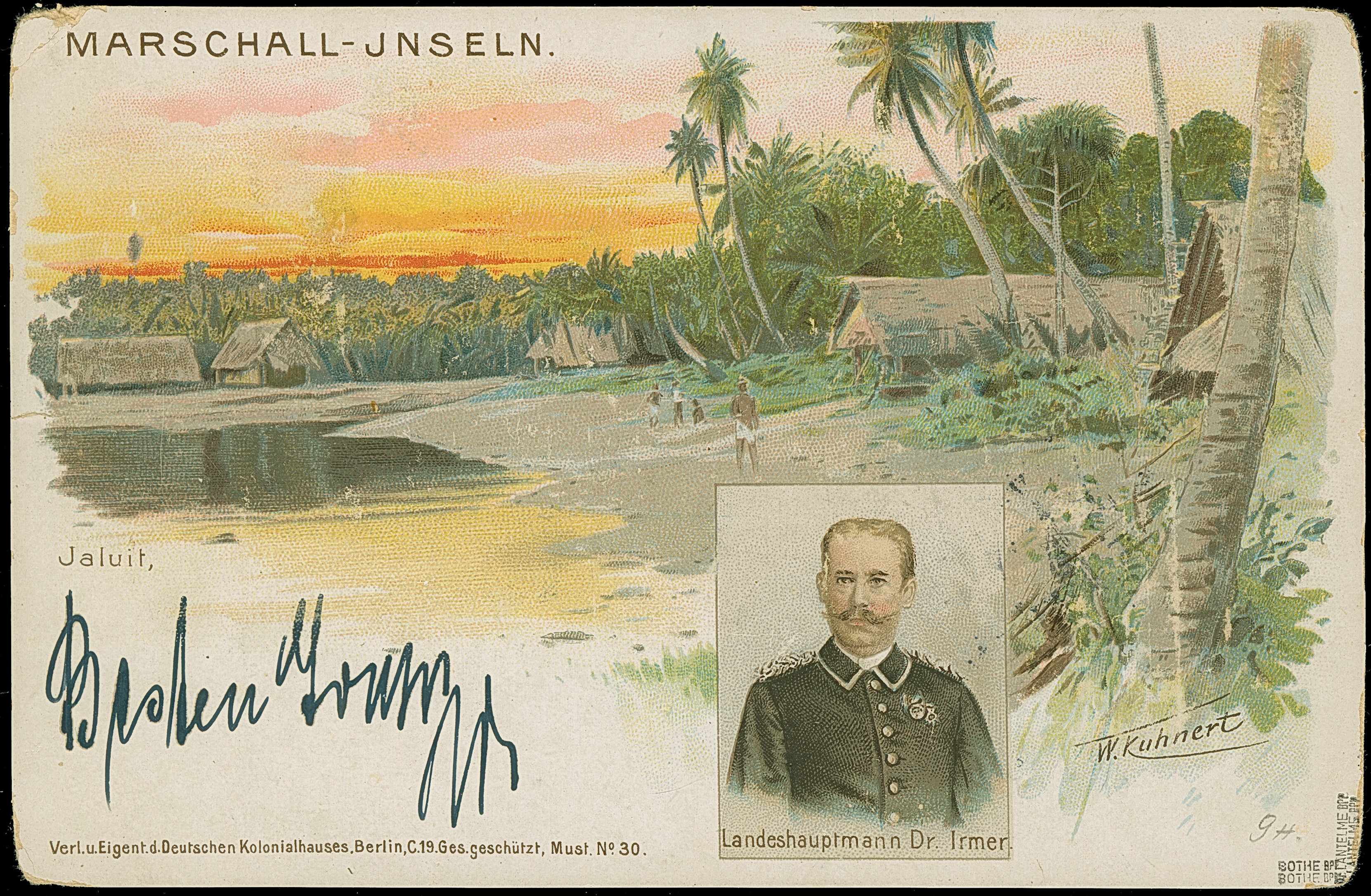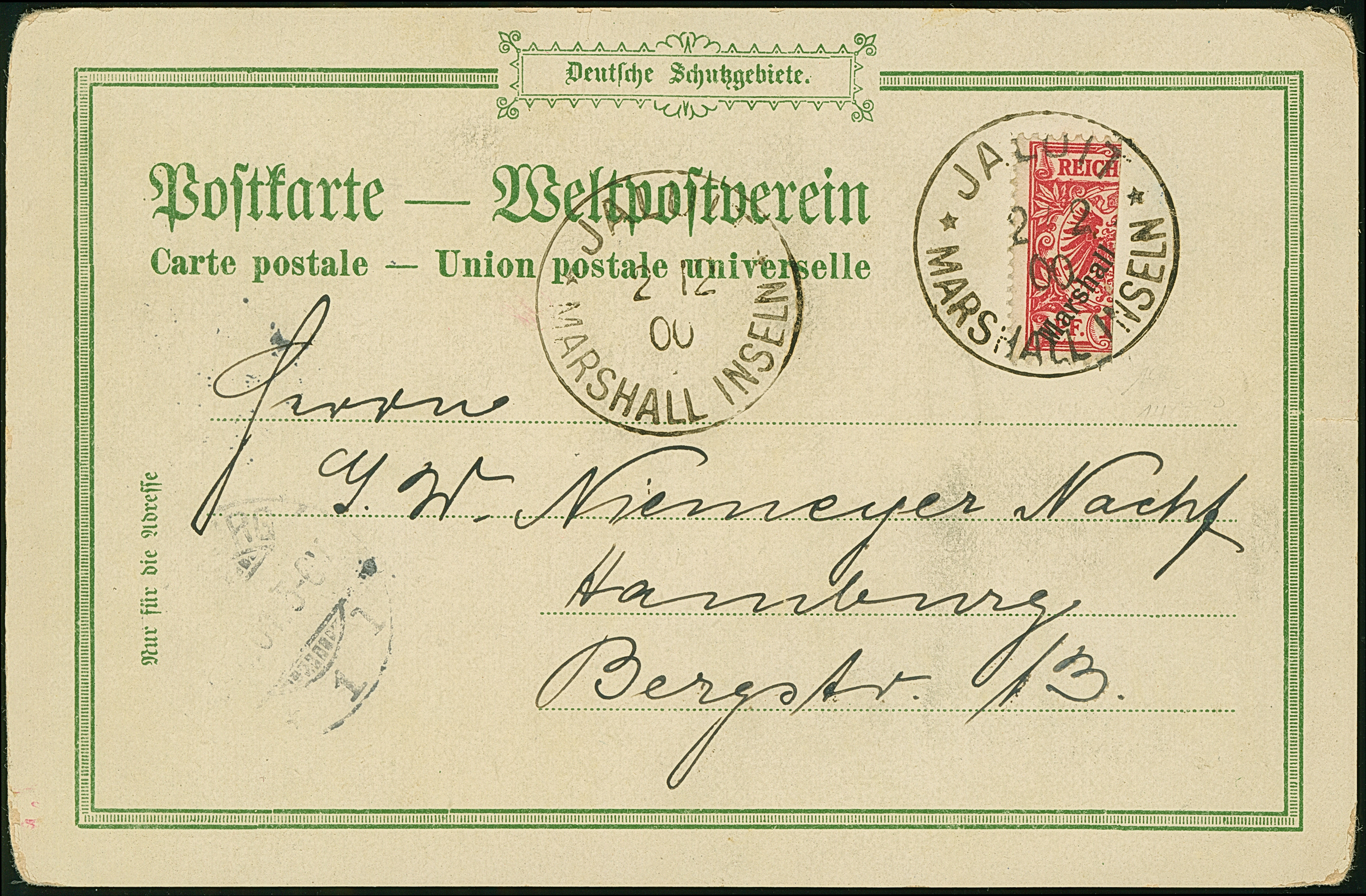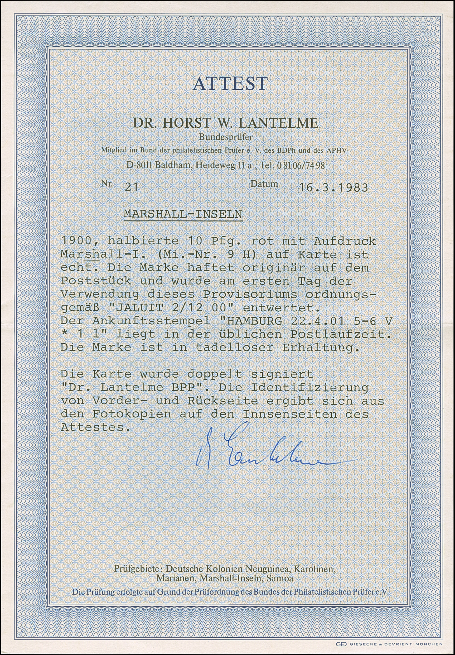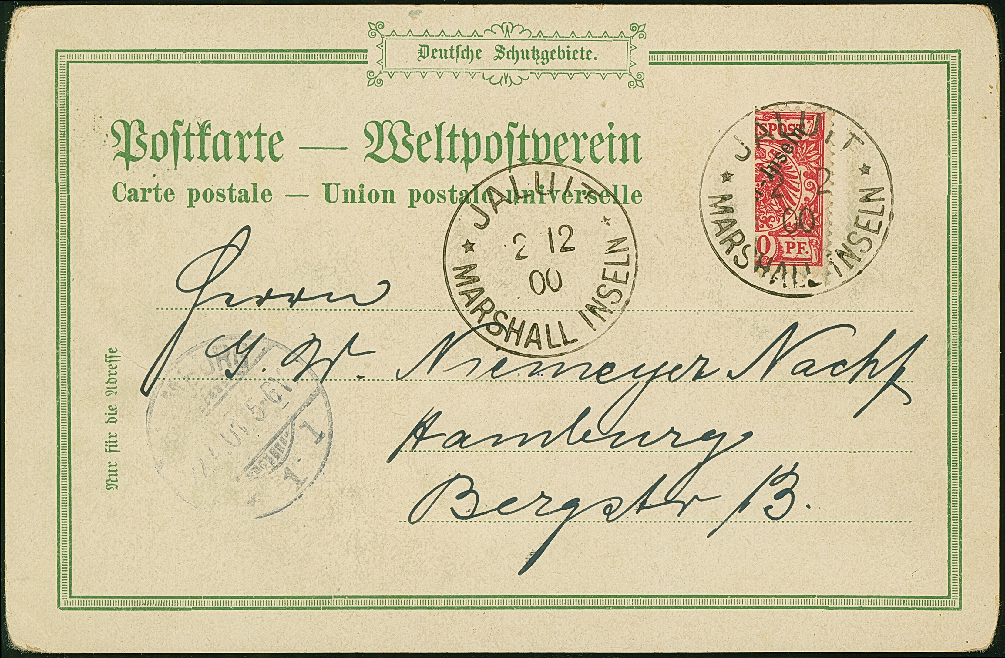1900, 10 Pfg. senkrecht halbiert, rechte Hälfte mit Stempel “JALUIT MARSHALL-INSELN 2.2.00” auf Ansichtskarte mit Grußtext nach Hamburg mit Ankunftsstempel. Die Kartenecken leicht eckrund, die farbfrische Halbierung ist gut gezähnt und in einwandfreier Erhaltung, doppelt Dr. Lantelme BPP mit Fotoattest (1993)