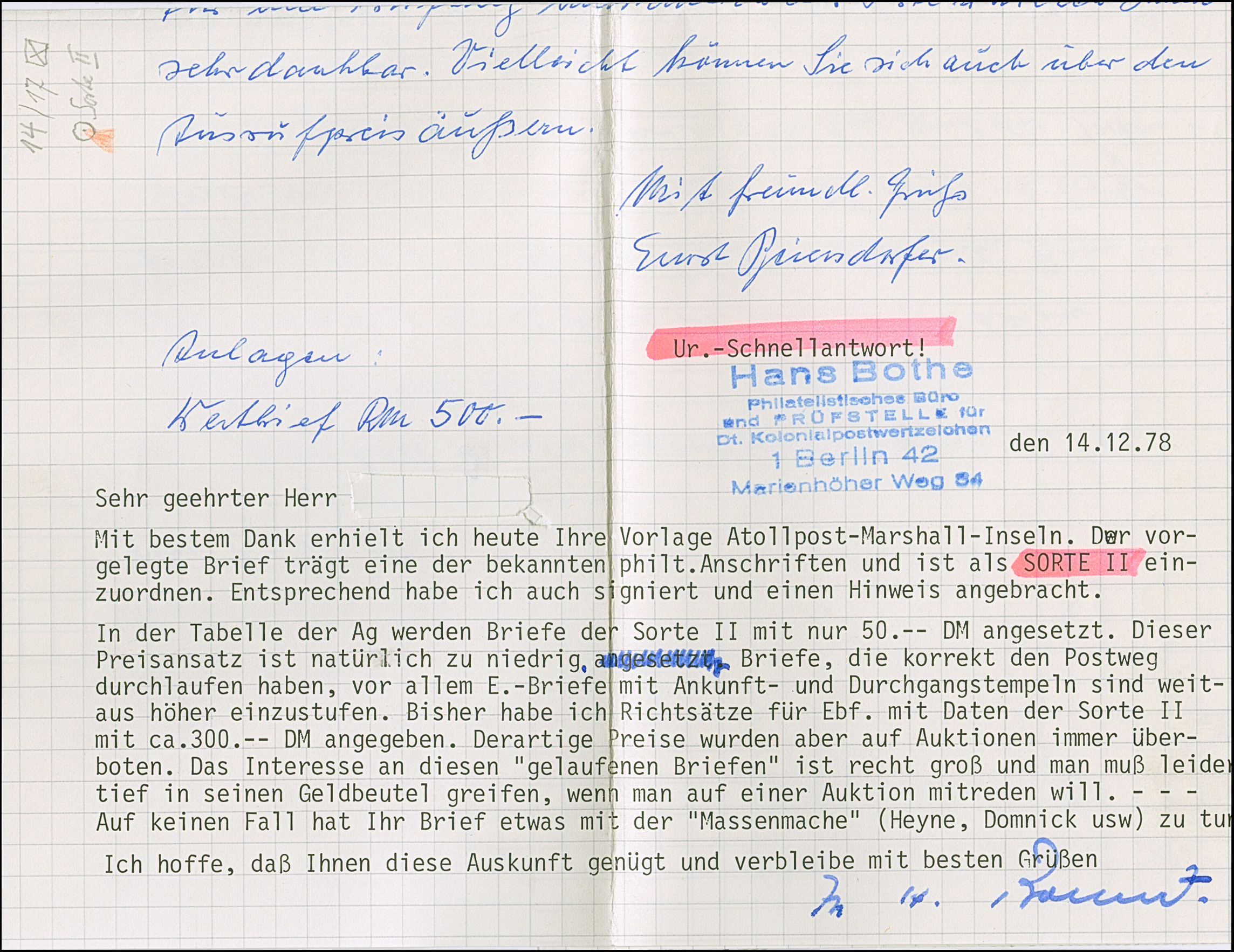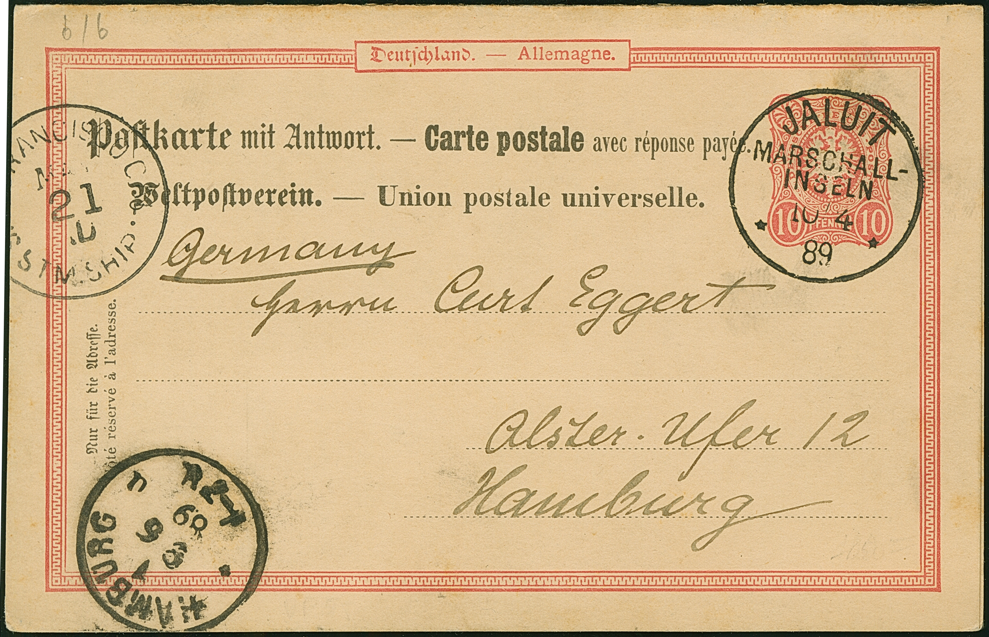 1889, Ganzsachen-Doppelkarte 10 Pfg. mit Stempel “JALUIT MARSCHALL-INSELN 10.4.89” mit Grußtext via “SAN FRANCISCO MAY 21.” nach Hamburg mit vorderseitigem Ankunftsstempel, in einwandfreier Erhaltung. Laut Steuerhandbuch das früheste bekannte Ganzstück von den Marschall-Inseln, signiert Bothe BPP