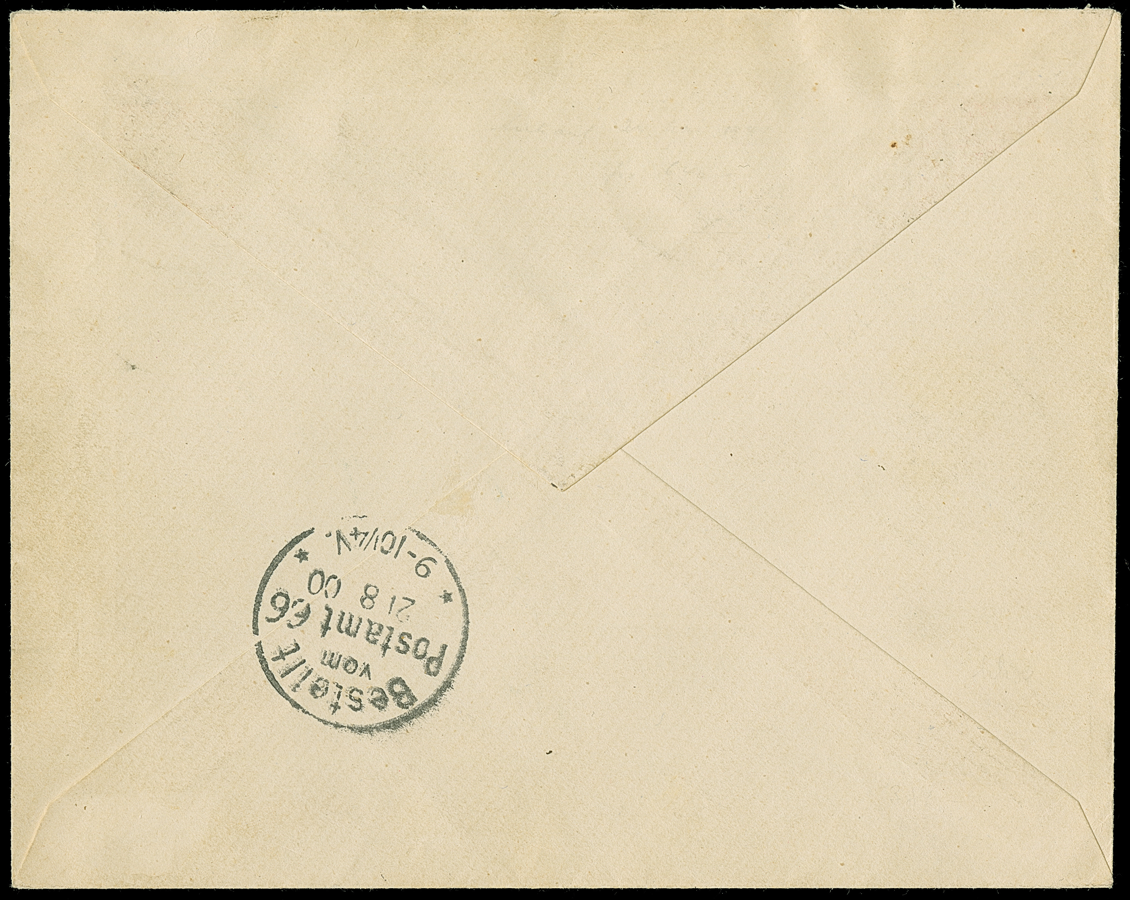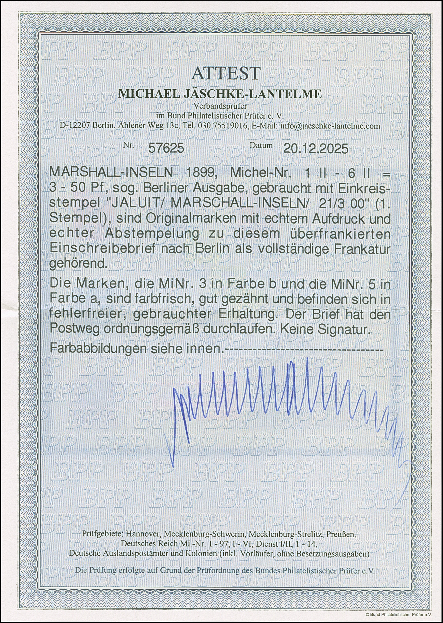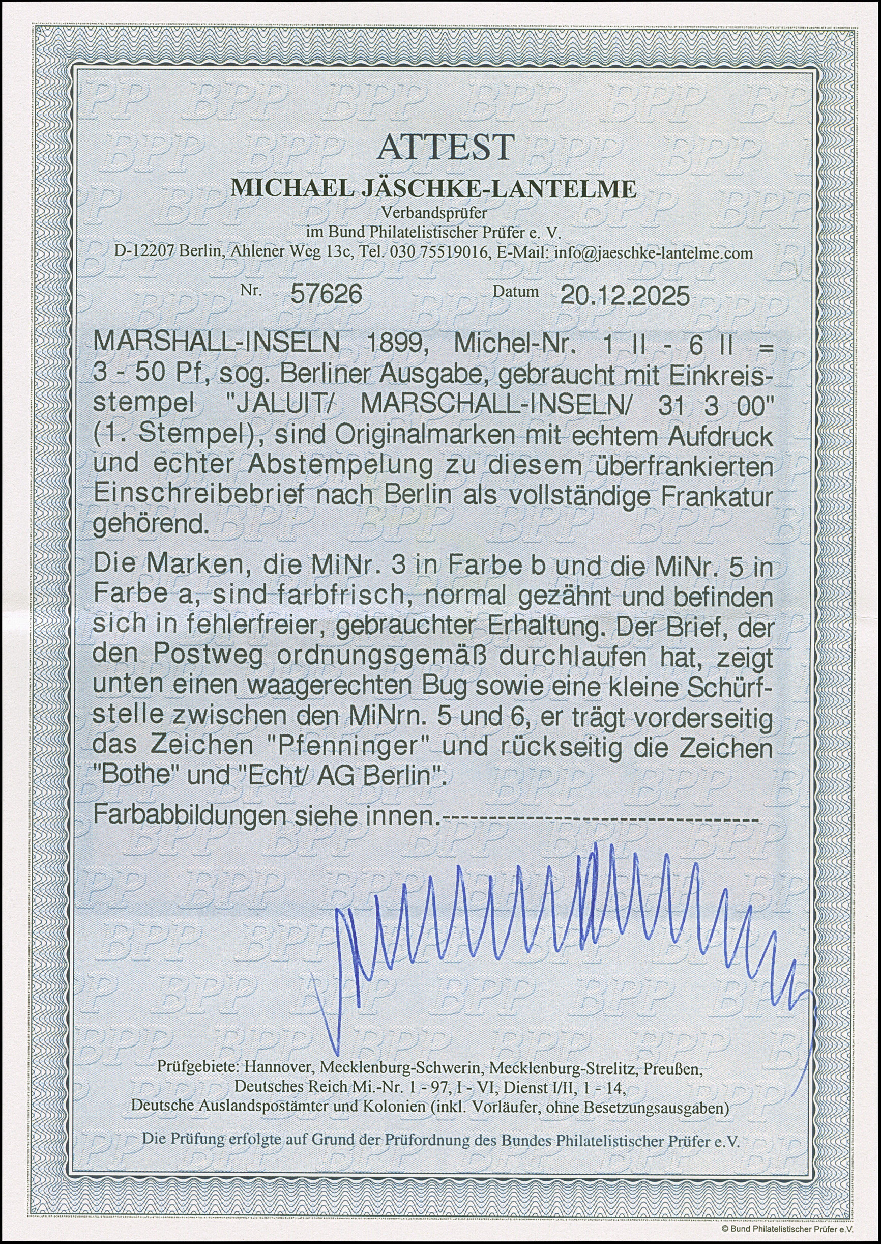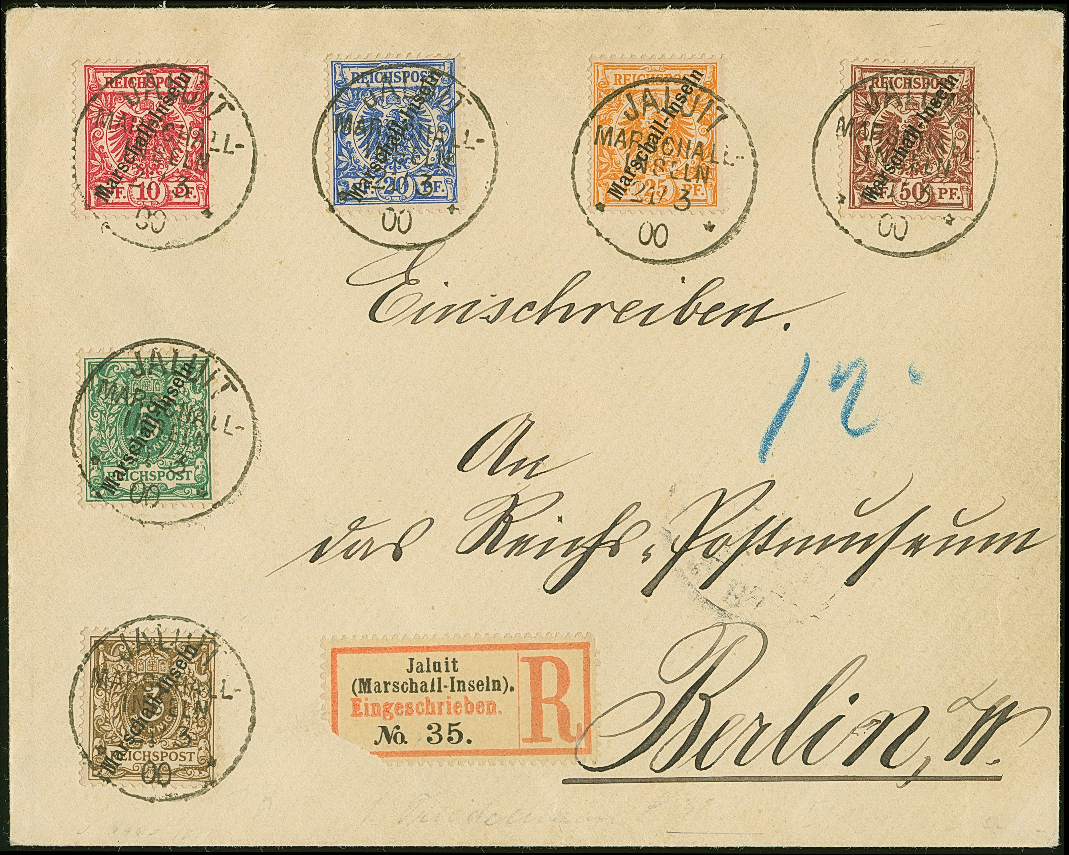 1899, Berliner Ausgabe 3-50 Pfg. komplett, dabei 10 Pfg. lilarot und 25 Pfg. gelblichorange, je mit klarem Stempel “MARSCHALL-INSELN 31.3.00” auf überfrankiertem R-Brief nach Berlin mit Ankunftsstempel. Der Umschlag mit Beförderungsspuren und unten mit waagerechter Faltung , die Marken sind in einwandfreier Erhaltung, selten, signiert Pfenninger und Bothe BPP sowie Fotoattest Jäschke-L. BPP (2025)