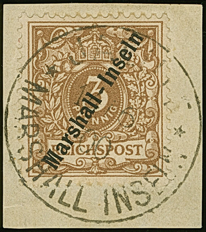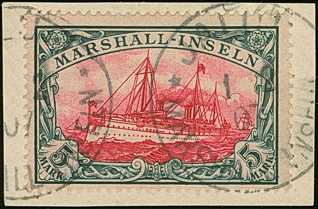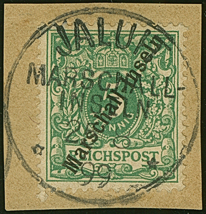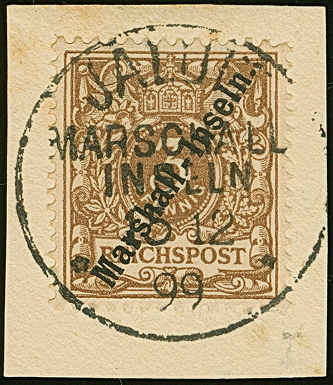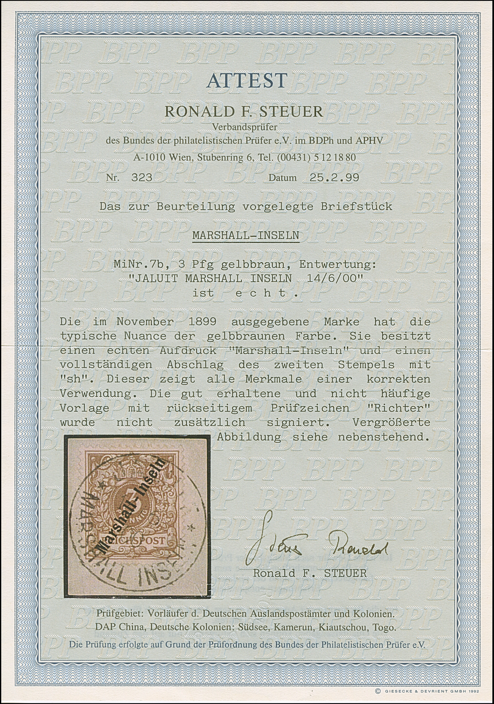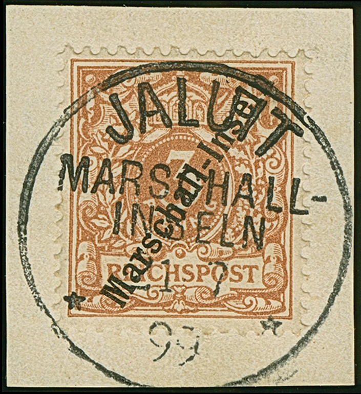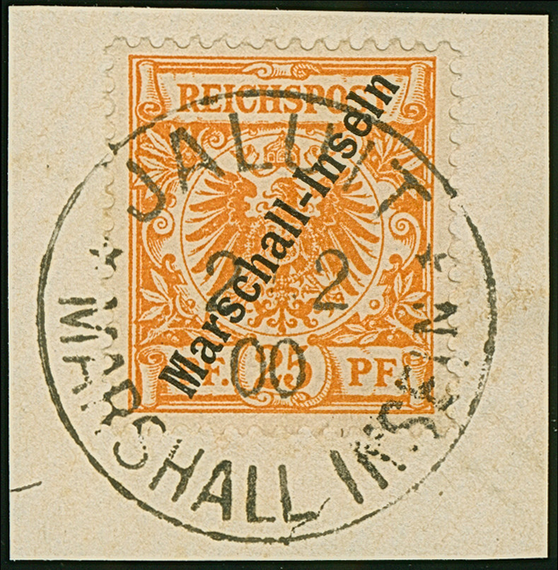 1899, 3 Pfg. lebhaftorangebraun mit Stempel “JALUIT MARSHALL-INSELN14.6.00” auf Briefstück, in einwandfreier Erhaltung. Ein schönes Exemplar dieser seltenen Farbe mit der besseren Stempeltype, sign. Richter und Fotoattest R. Steuer BPP (1999)