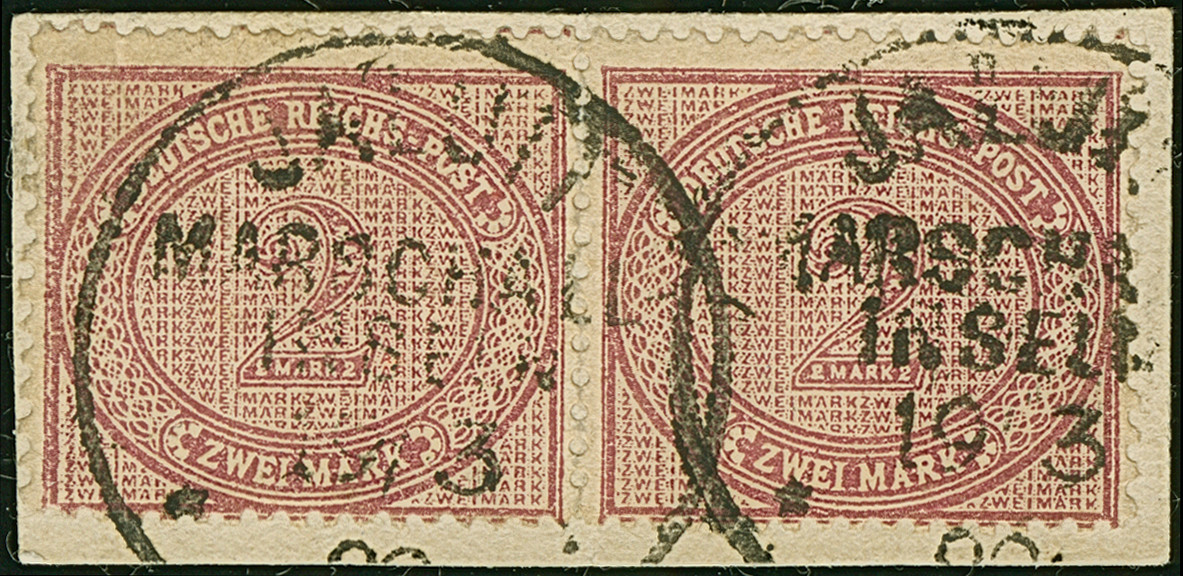 1890, 2 M. dunkelrotkarmin im waagerechten Paar je mit Stempel “JALUIT MARSCHALL-INSELN 19.3.” auf Briefstück. Das farbfrische Markenpaar ist durch eine senkrechte Faltung in der Zähnung stärker angetrennt und die linke Marke mit kleiner Aufklebefalte, ansonsten in einwandfreier Erhaltung,  Fotoattest Dr. F. Steuer BPP (1994)
