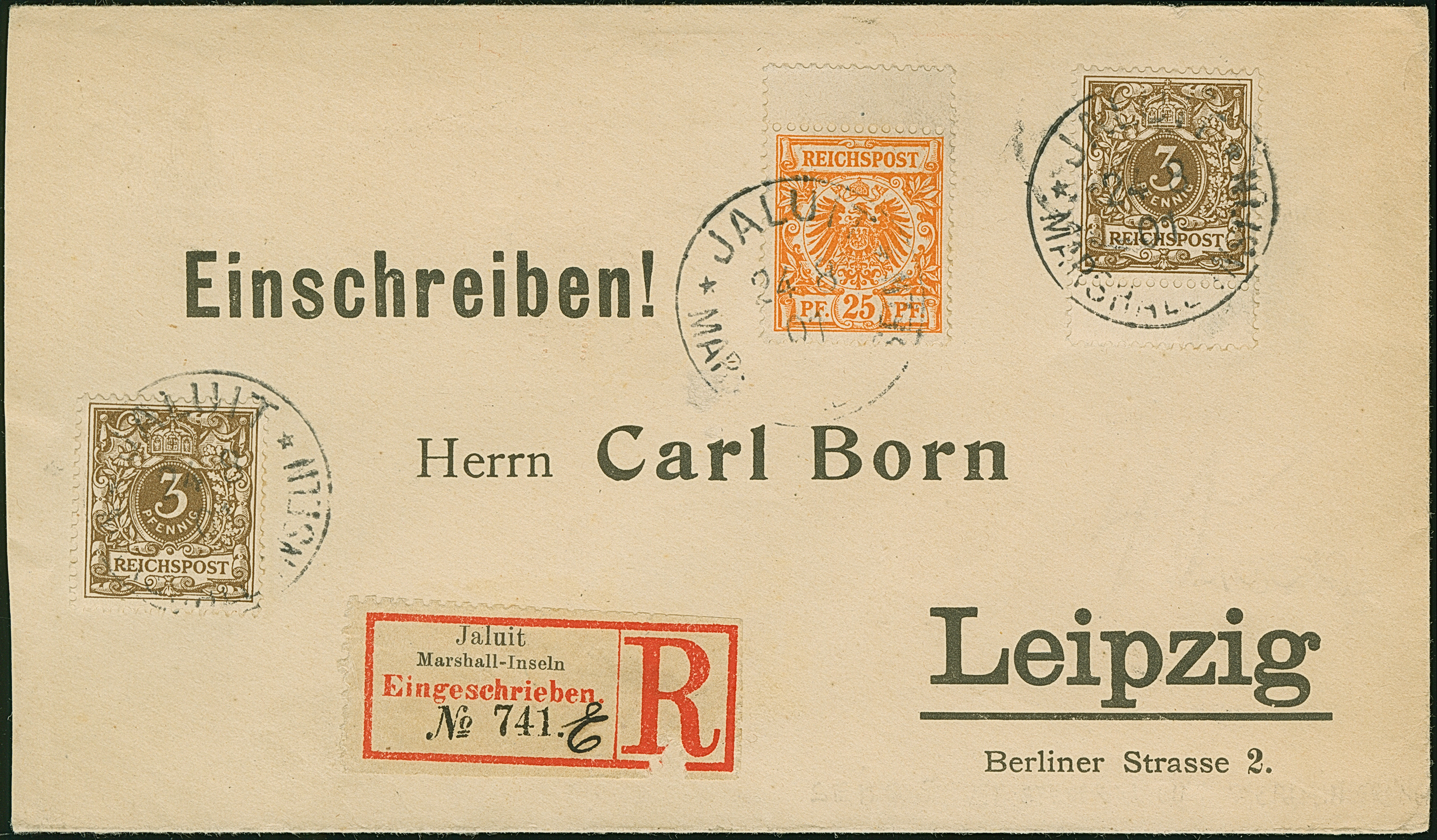 1897, Krone/Adler 25 Pfg. gelblichorange und zwei Einzelwerte 3 Pfg. dunkelockerbraun je mit Stempel “JALUIT MARSHALL-INSELN 24.8.01” auf um einen Pfennig überfrankiertem R-Vordruckbrief nach Leipzig mit Ankunftsstempel, in einwandfreier Erhaltung. Ein dekorativer R-Brief als später Mitläufer-Brief