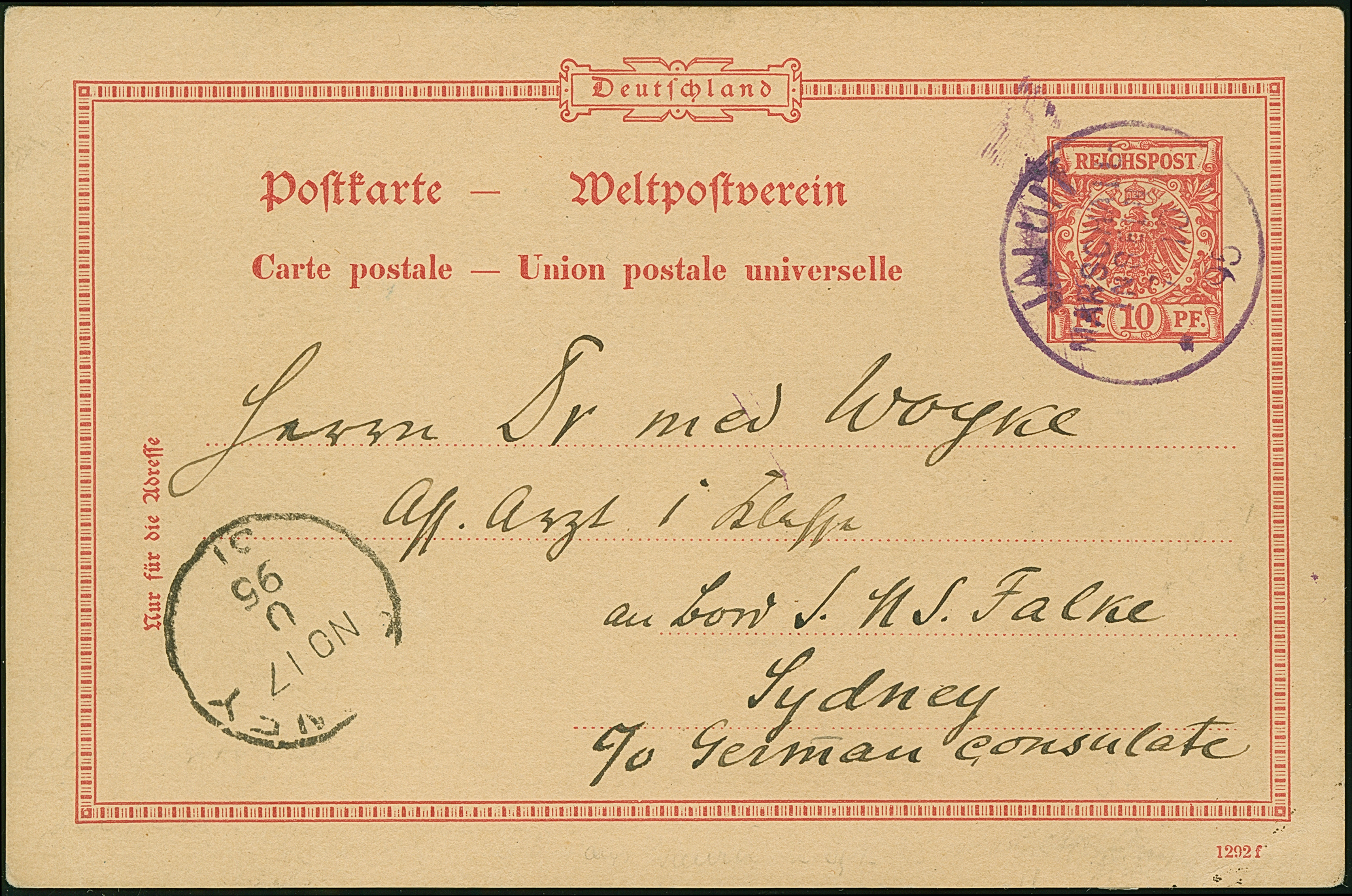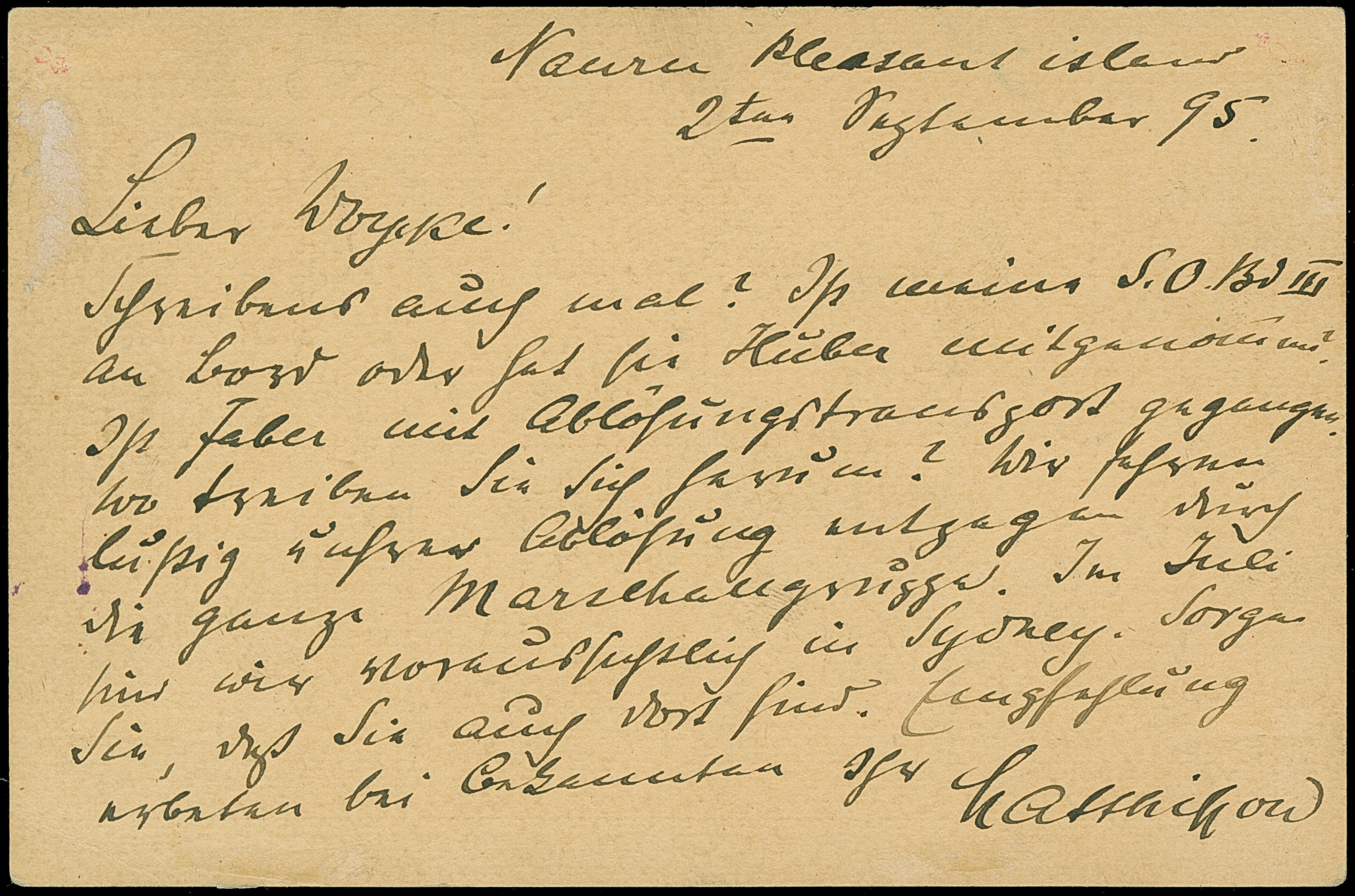 “JALUIT MARSCHALL-INSELN 7.10.95” in Rotviolett recht klar auf Ganzsachenkarte Krone/Adler 10 Pfg. mit viel Text und Datierung “Nauru Pleasant Island 2ten September 95” an einen Doktor auf der SMS Falke in Sydney mit Ankunftsstempel, in einwandfreier Erhaltung. Ein sehr seltene und frühe Verwendung aus Nauru und in Verbindung mit der Stempelfarbe vielleicht einmalige Karte