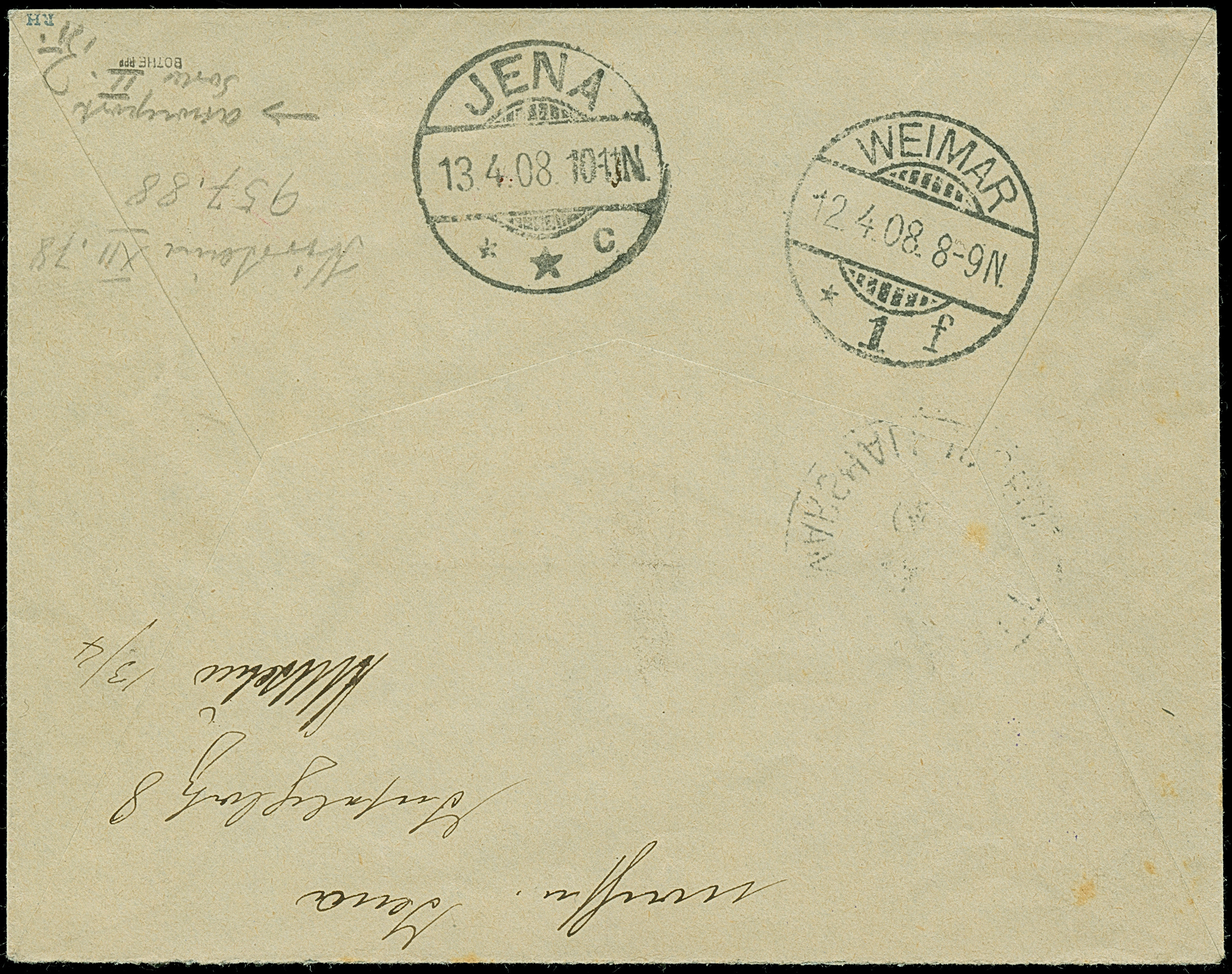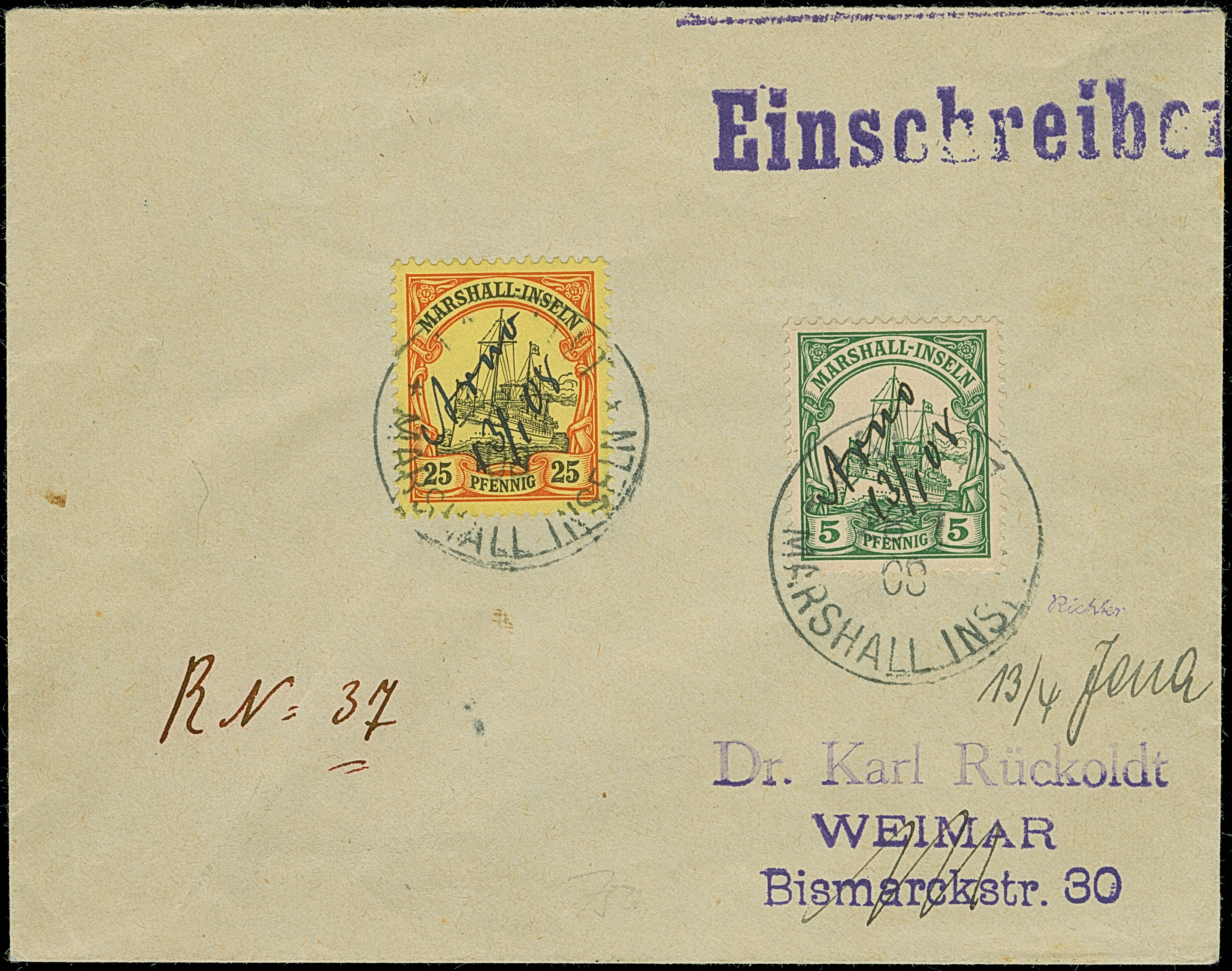 “Arno 13/1.08” handschriftliche Entwertung mit übergehendem Stempel “JALUIT MARSHALL-INSELN 28.2.00” jeweils auf Kaiseryacht 5 und 25 Pfg. als tarifgerechte Frankatur auf R-Brief mit R-Zettel-Vermerk nach Weimar mit Nachsendung nach Jena mit Ankunftsstempel, in einwandfreier Erhaltung, signiert Bothe BPP