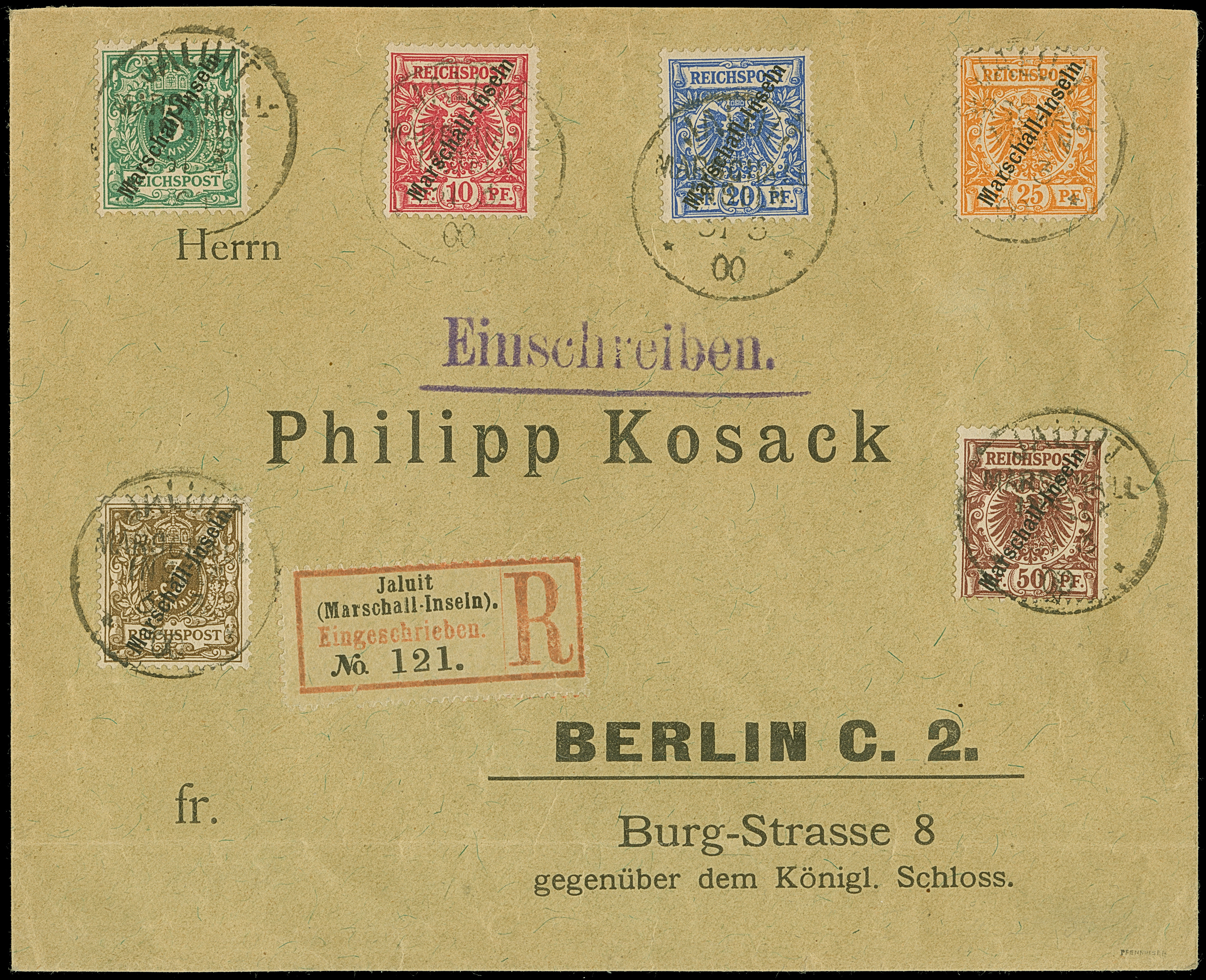 1899, Berliner Ausgabe 3-50 Pfg. komplett, dabei 10 Pfg. lilarot und 25 Pfg. gelblichorange, je mit klarem Stempel “MARSCHALL-INSELN 21.3.00” auf überfrankiertem R-Brief nach Berlin mit Ankunftsstempel, in einwandfreier Erhaltung. Komplette Sätze mit der besseren Entwertung sind nicht häufig, Fotoattest Jäschke-L. BPP (2025)