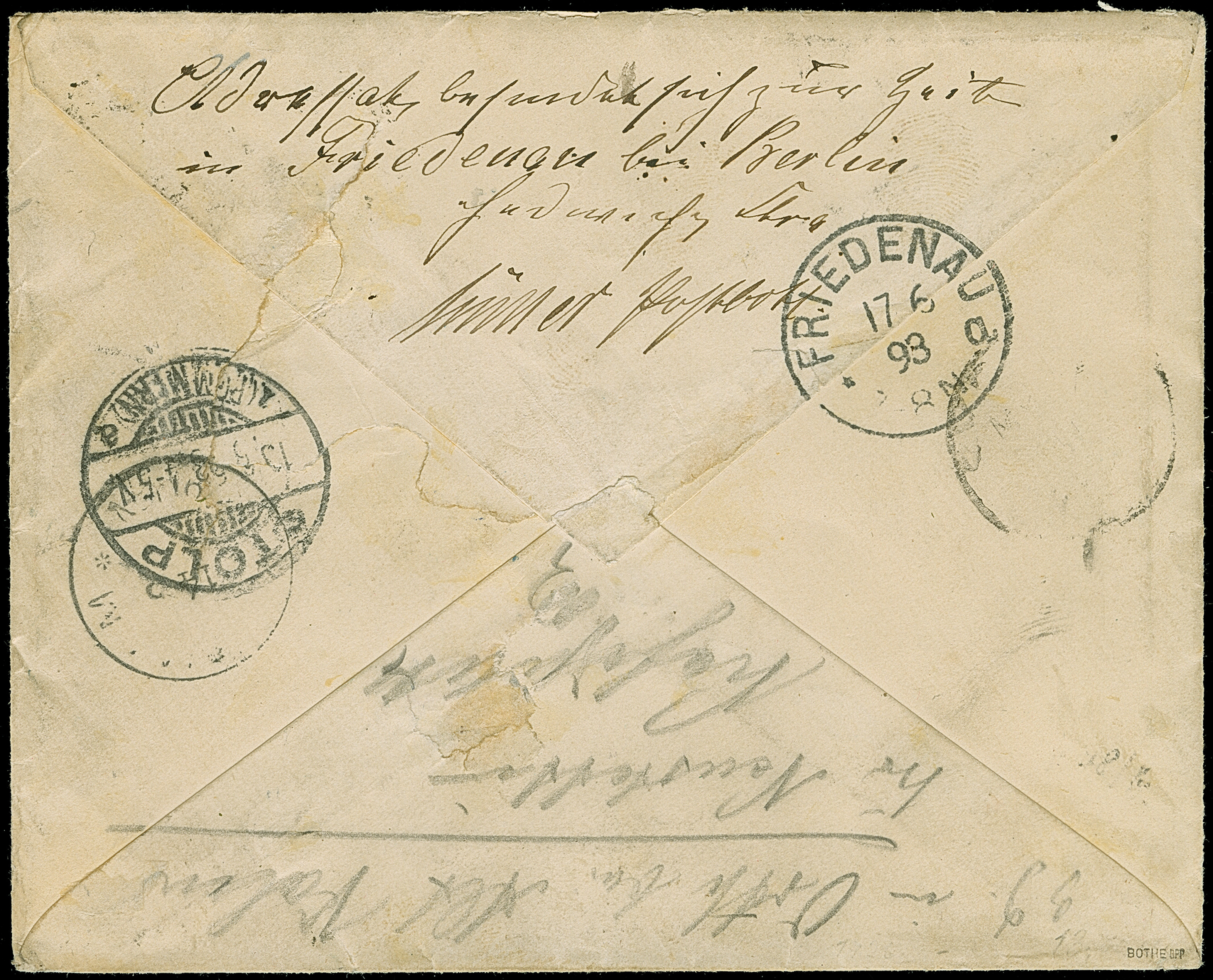 1890, Krone/Adler 20 Pfg. violettultrmarin, zwei Einzelmarken mit Stempel “JAULUIT MARSCHALL-INSELN 3.4.93” auf Brief der 2. Gewichtsstufe nach Stolpl mit Nachsendung nach u.a. Friedenau mit Ankunftsstempel. Der Umschlag mit kleinem Öffnungsfehler oben, ansonsten in guter Erhaltung, sign. Bothe BPP