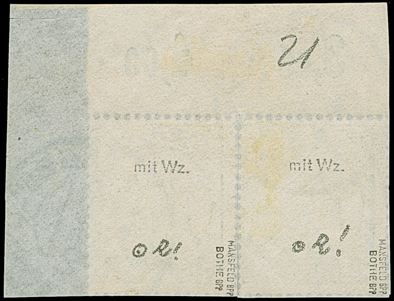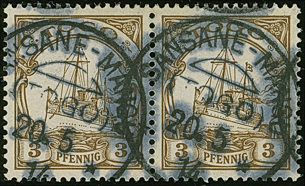 “SANSANE-MANGU (TOGO) 20.5.14”, zweimal klar (etwas ölig) auf losem, waagerechten Paar Kaiseryacht 3 Pfg. ohne Wasserzeichen in einwandfreier Erhaltung, sign. Dr. Lantelme