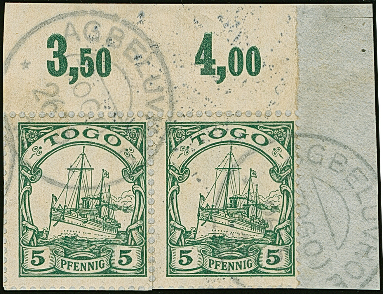 “AGBELUVHOE (TOGO) 26.5…” zweimal recht klar auf waagerechtem Oberrand-Paar Kaiseryacht 5 Pfg. mit Wasserzeichen auf Briefstück. Das Markenpaar ist senkrecht bis zum Oberrand mit Schere getrennt, ansonsten in guter Erhaltung, sign. Mansfeld BPP und Bothe BPP