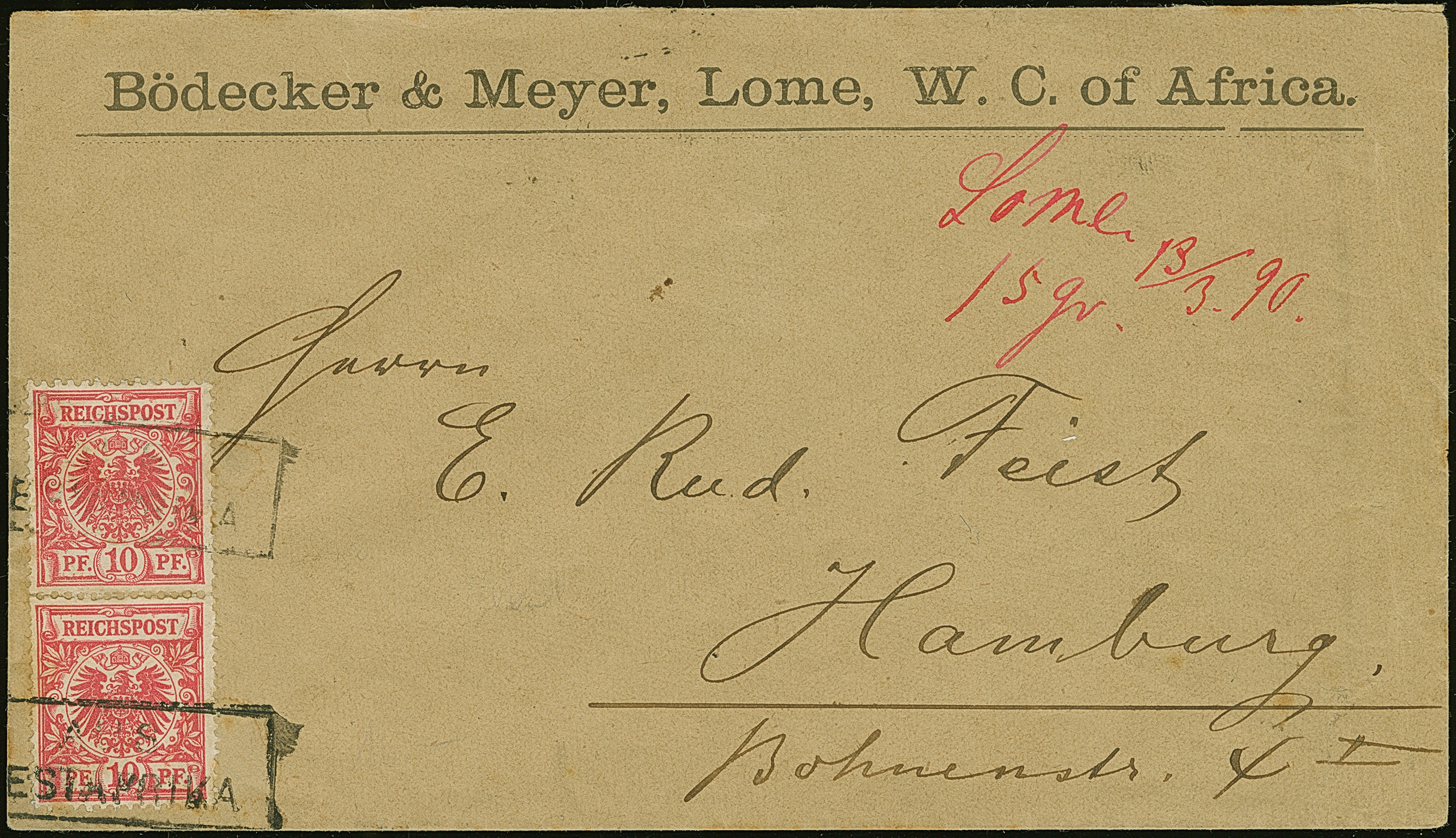 1889, Krone/Adler 10 Pfg. rosarot (leuchtend karmin quarzend) im senkrechten Paar mit Rahmenstempel “AUS WESTAFRIKA” auf Vordruckbrief “Bödecker & Meyer, Lome, W.C. of Africa” mit handschriftlichem Aufgabevermerk “Lome 13.3.90” in Rot nach Hamburg in Ankunftsstempel. Der Umschlag mit Beförderungs- und Altersspuren, ansonsten in einwandfreier Erhaltung. Interessanter Brief aus Lome, die Postagentur in Lome wurde am 1.3.1890 eröffnet, Fotoattest Jäschke-L. BPP (2025)