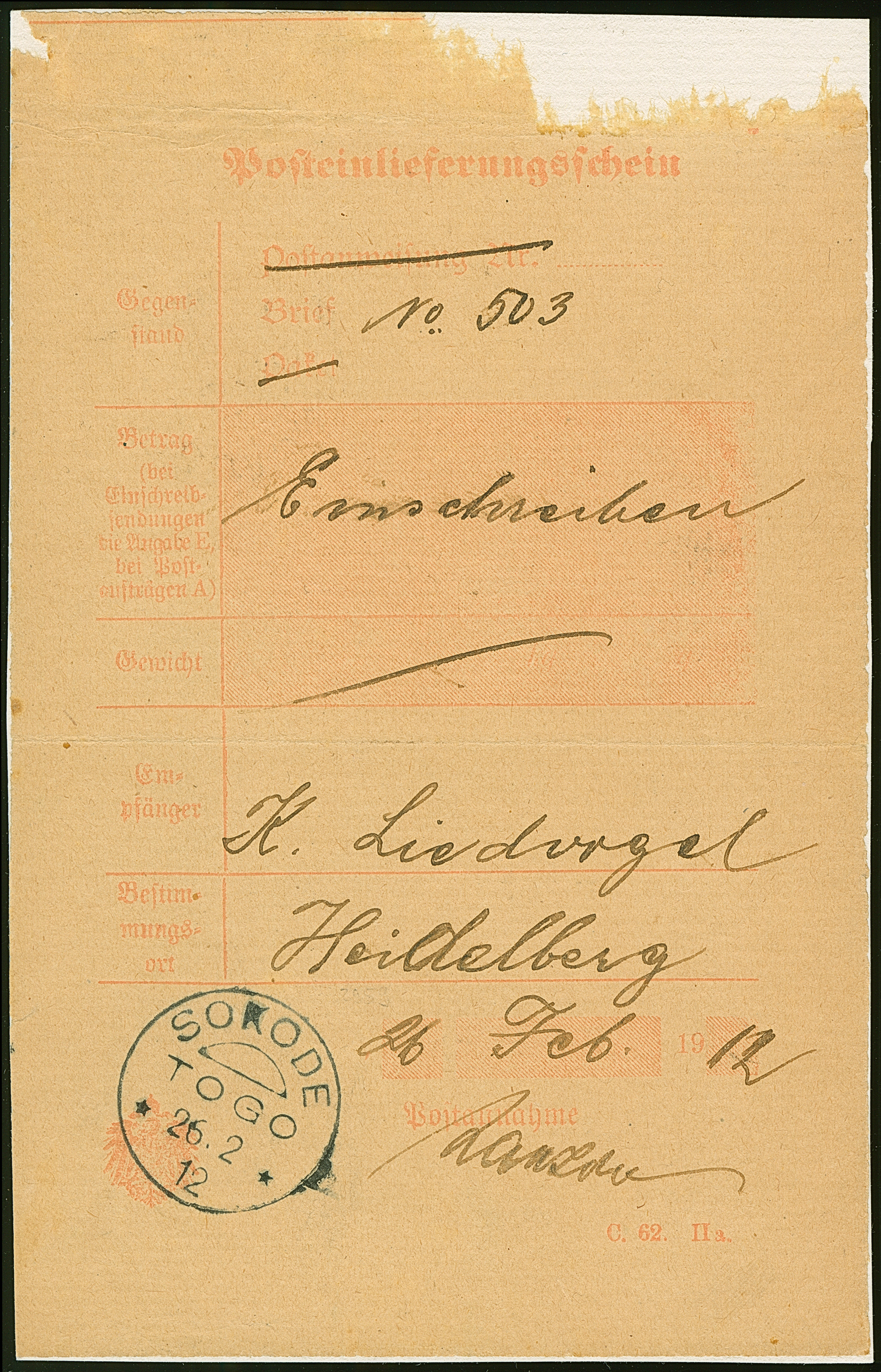 1912, “SOKODE TOGO 26.2.12” sehr klar auf Posteinlieferungsschein für einen R-Brief nach Heidelberg. Das Formular ist oben fehlerhaft und wurde auf einer Unterlage geklebt, ansonsten in guter Erhaltung