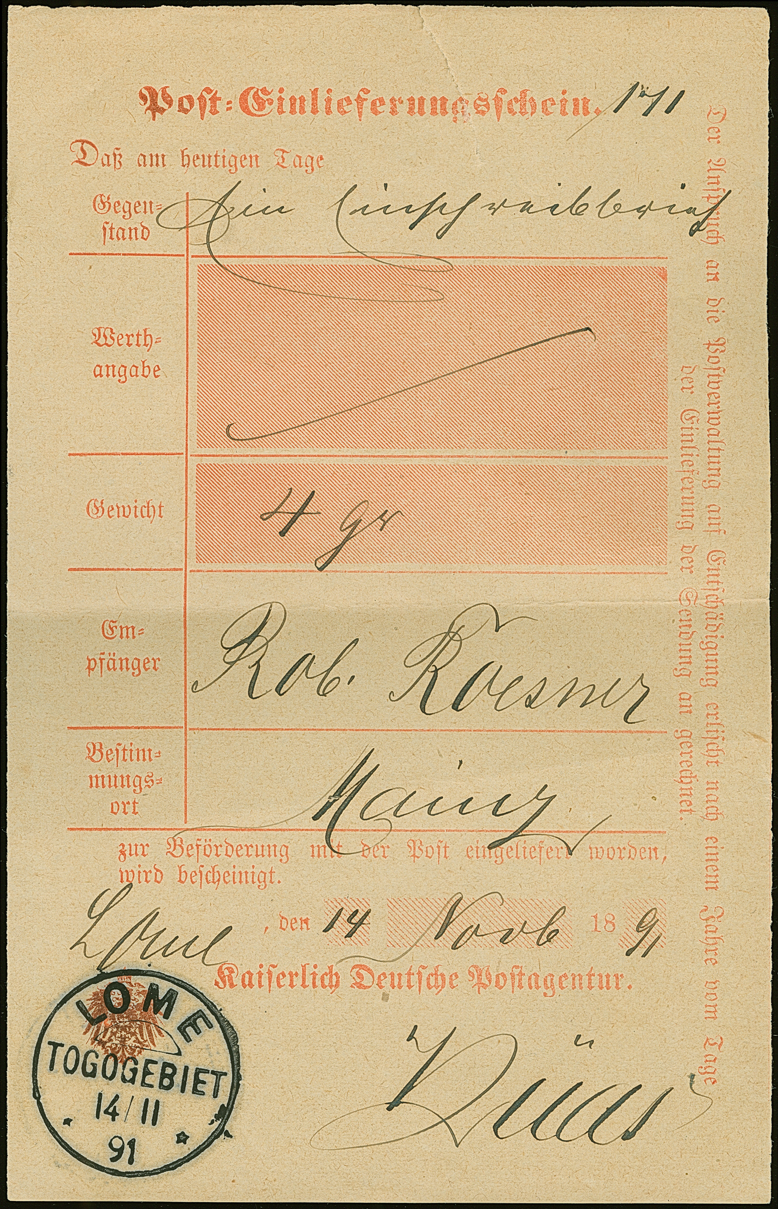1891/92, zwei Posteinlieferungsscheine je mit Stempel “LOME TOGOGEBIET” vom "14.11.91" bzw. “5.4.92”. Dazu Posteinlieferungsschein 1892 mit violettem L2 “ROSENTHAL REUSS” für einen R-Brief nach Victoria, Kamerun. Die Formulare haben übliche Falt- und Randspuren bzw. einmal oben mit Einriss
