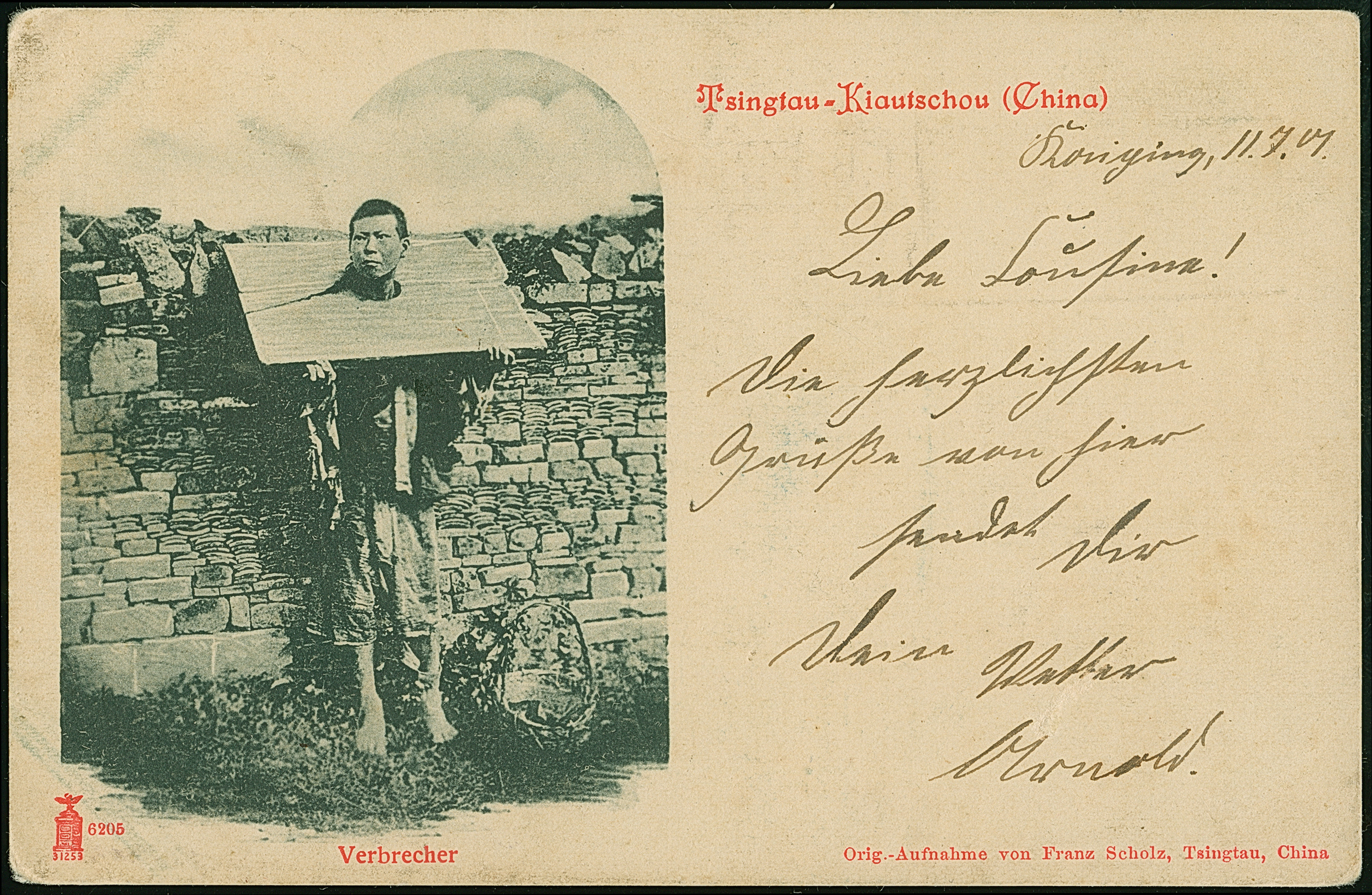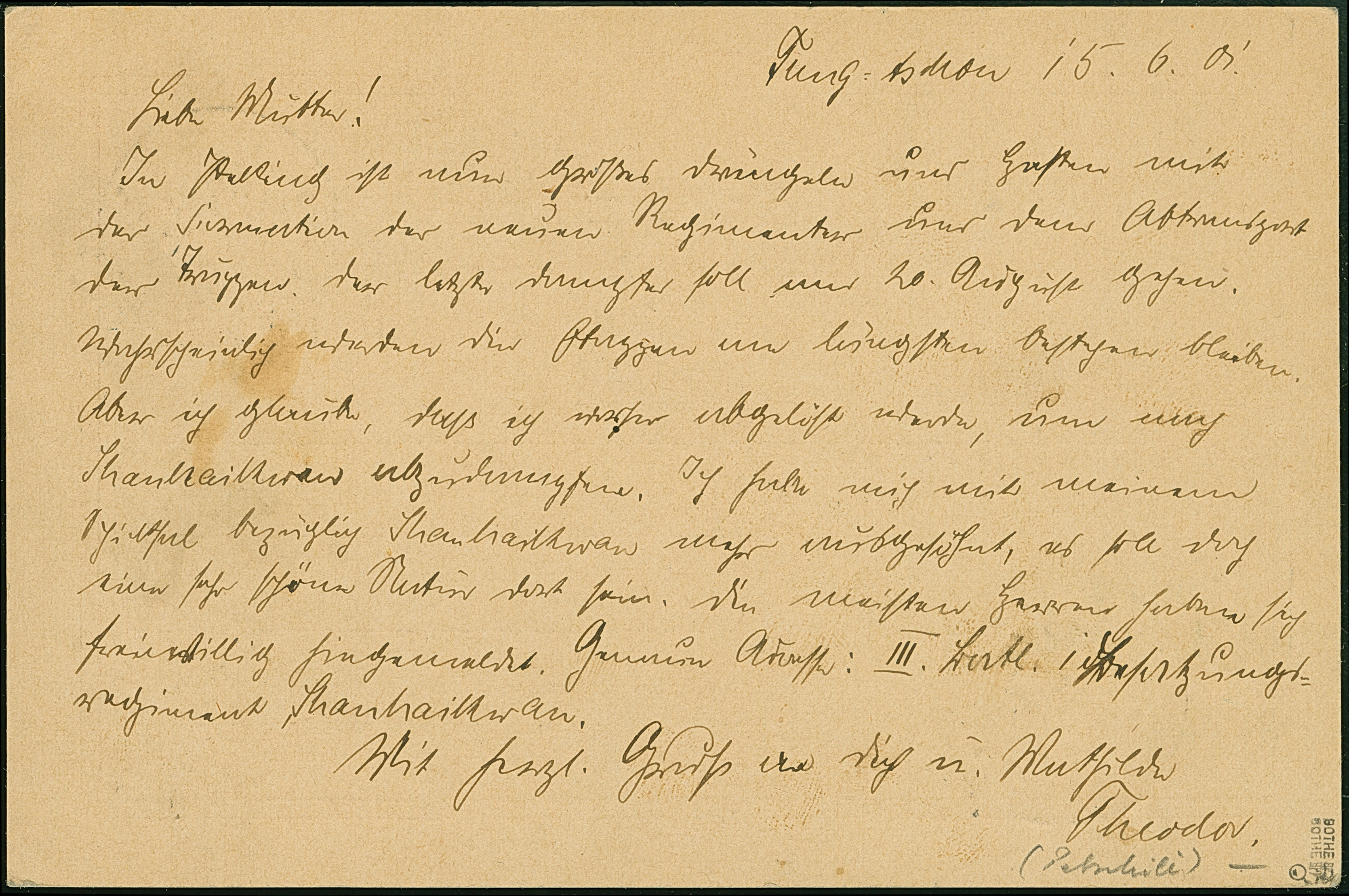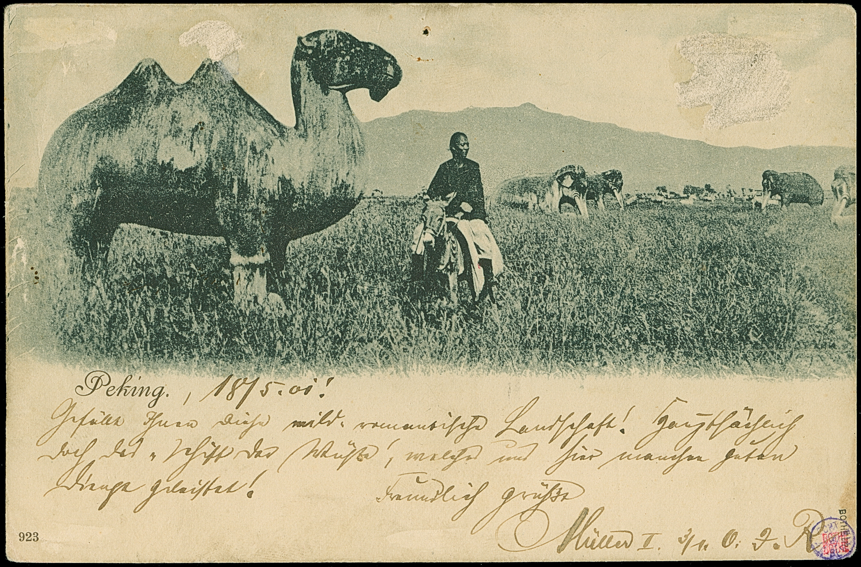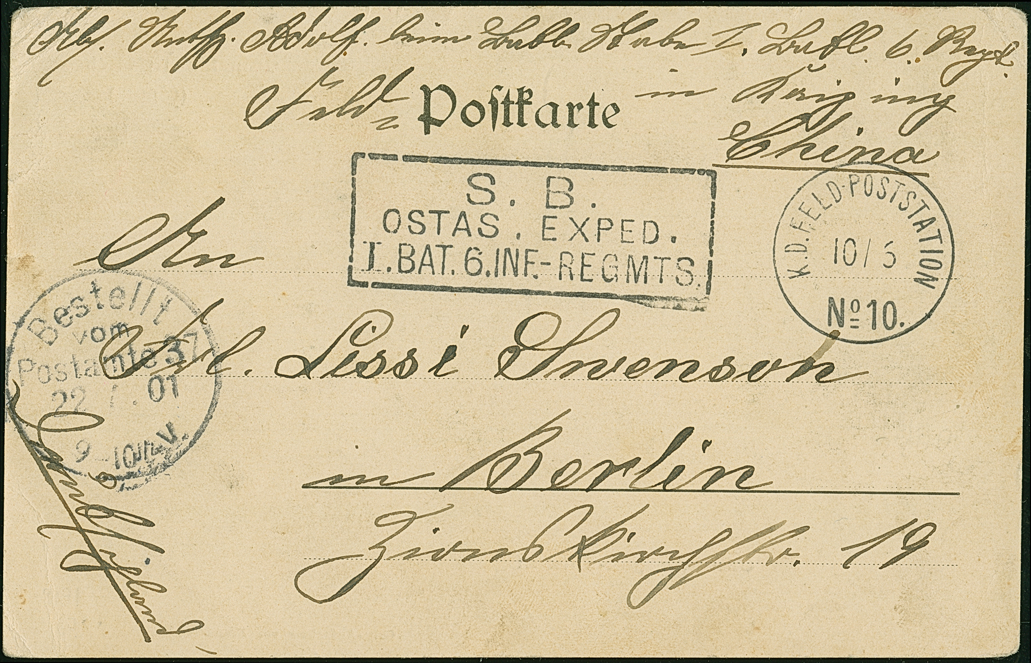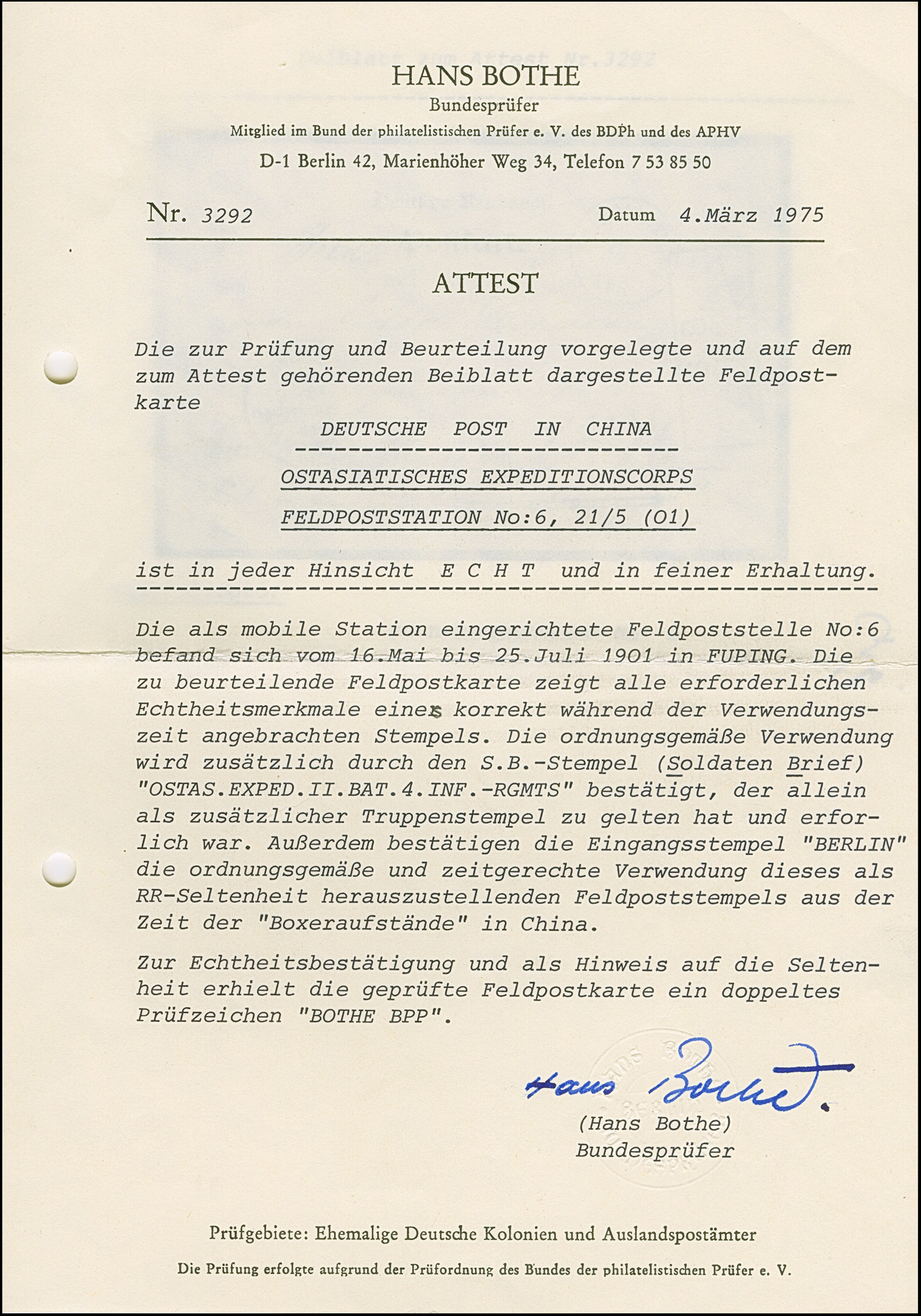 1901, Stempel “K.D.FELD.POSTSTATION No. 6 21.5.” klar auf Ansichtskarte “Aus Wesel” mit viel Text mit Vermerk “…jetzt aus China…” sowie Briefsttempel nach Berlin mit Ankunftstempel. Die Karte mit kleinen Beförderungsspuren im Rand, sonst in guter Erhaltung, doppelt signiert Bothe BPP mit Fotoattest (1975)