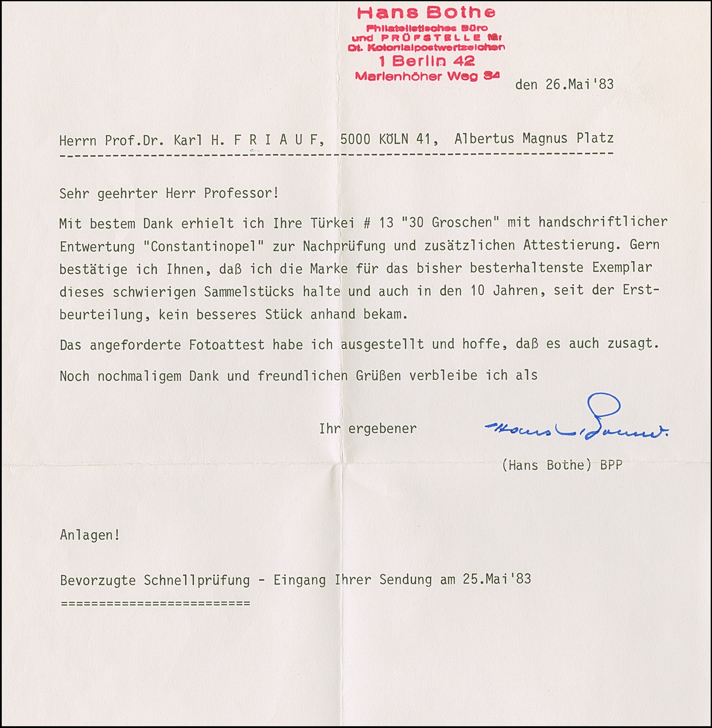 1872, Innendienst 30 Gr. (grau)ultramarin mit kopfstehender handschriftlicher Entwertung “Constan-tinopel 12/9.73”. Die farbfrische und gut gezähnte Marke ist in einwandfreier Erhaltung. In dieser Qualität sind bisher nur ganz wenige Exemplare bekannt, signiert Bothe BPP mit zwei Fotoattesten (1974 + 1983)