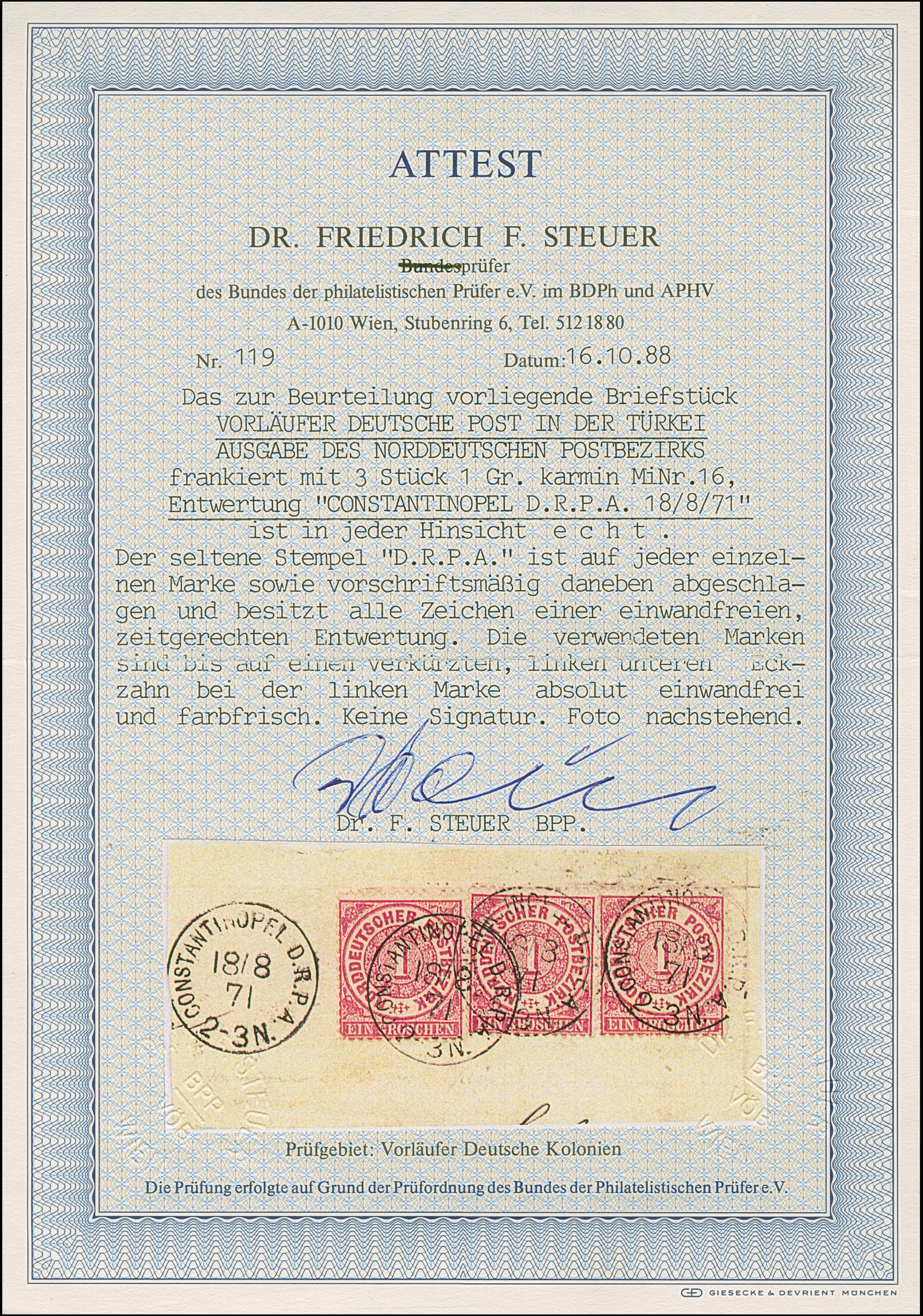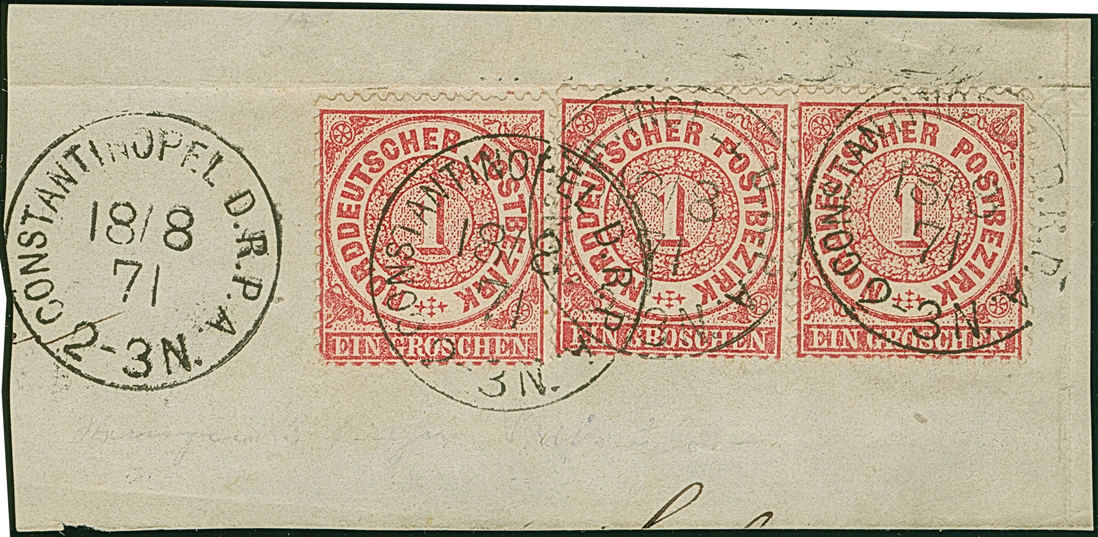 1870, NDP 1 Gr. gezähnt. drei Einzelmarke je mit klarem EKr. “CONSTANTINOPEL D.R.P.A. 18.8.71” auf Briefstück mit weiterem Stempelabschlag. Die linke Marke mit verkürztem Eckzahn links unten, ansonsten in einwandfreier Erhaltung, das Briefstück mit Randbügen. Belegstücke mit diesem nur wenige Wochen gebrauchten Stempel sind große Seltenheiten der Vorläufer-Ausgaben von der Türkei, ProFi hat kein weiteres Briefstück mit drei Marken registriert, Fotoattest Dr. F. Steuer BPP (1988)