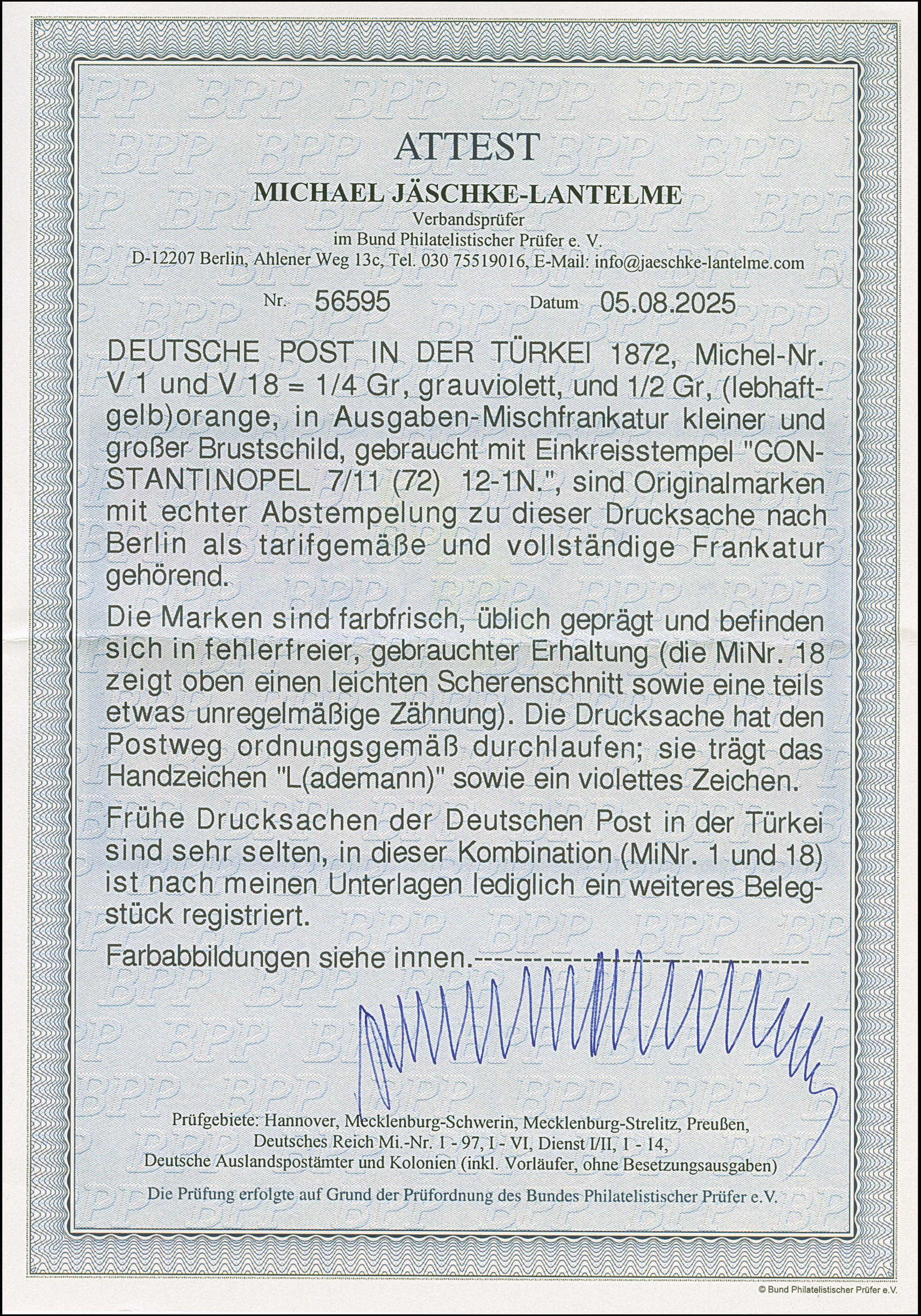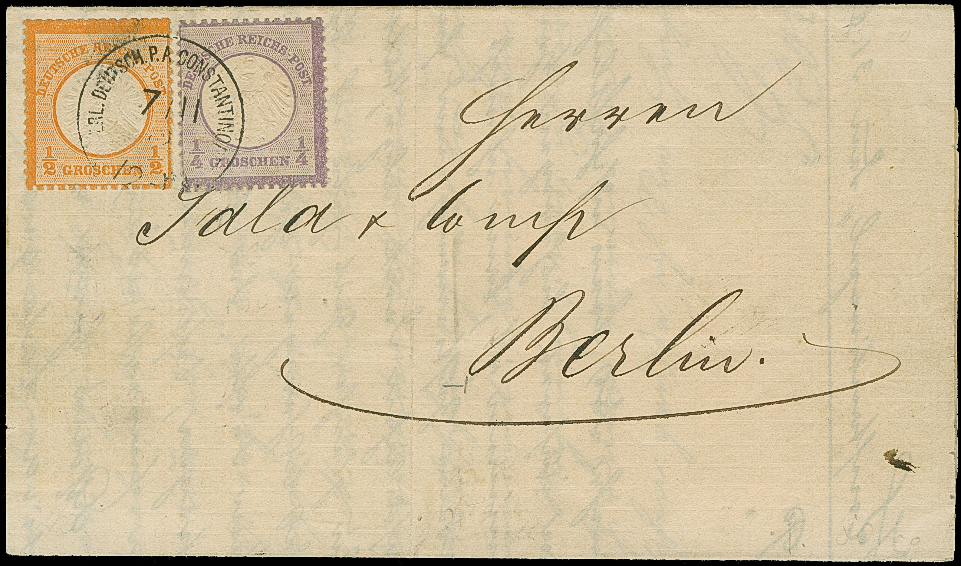 1872, kleiner Schild ¼ Gr. grauviolett in Mischfrankatur mit großer Schild ½ Gr. orange mit Stempel “KAISERL.DEUTSCH. P.A. CONSTANTINOPEL 7.11.72” als tarifgerechte Frankatur auf kompletter Faltdrucksache nach Berlin mit Ankunftstempel. Die farbfrischen Marken sind üblich geprägt, die ½ Gr.-Marke hat oben eine leichte Scherentrennung bzw. ist rechts etwas unregelmäßig gezähn, beide Marken sind wie die Faltdrucksache in einwandfreier Erhaltung. In dieser Kombination eine außergewöhnlich seltene und attraktive Frankatur, bisher sind nur zwei weitere Drucksachen in dieser Kombination registriert, Fotoattest Jäschke-L. BPP (2025)