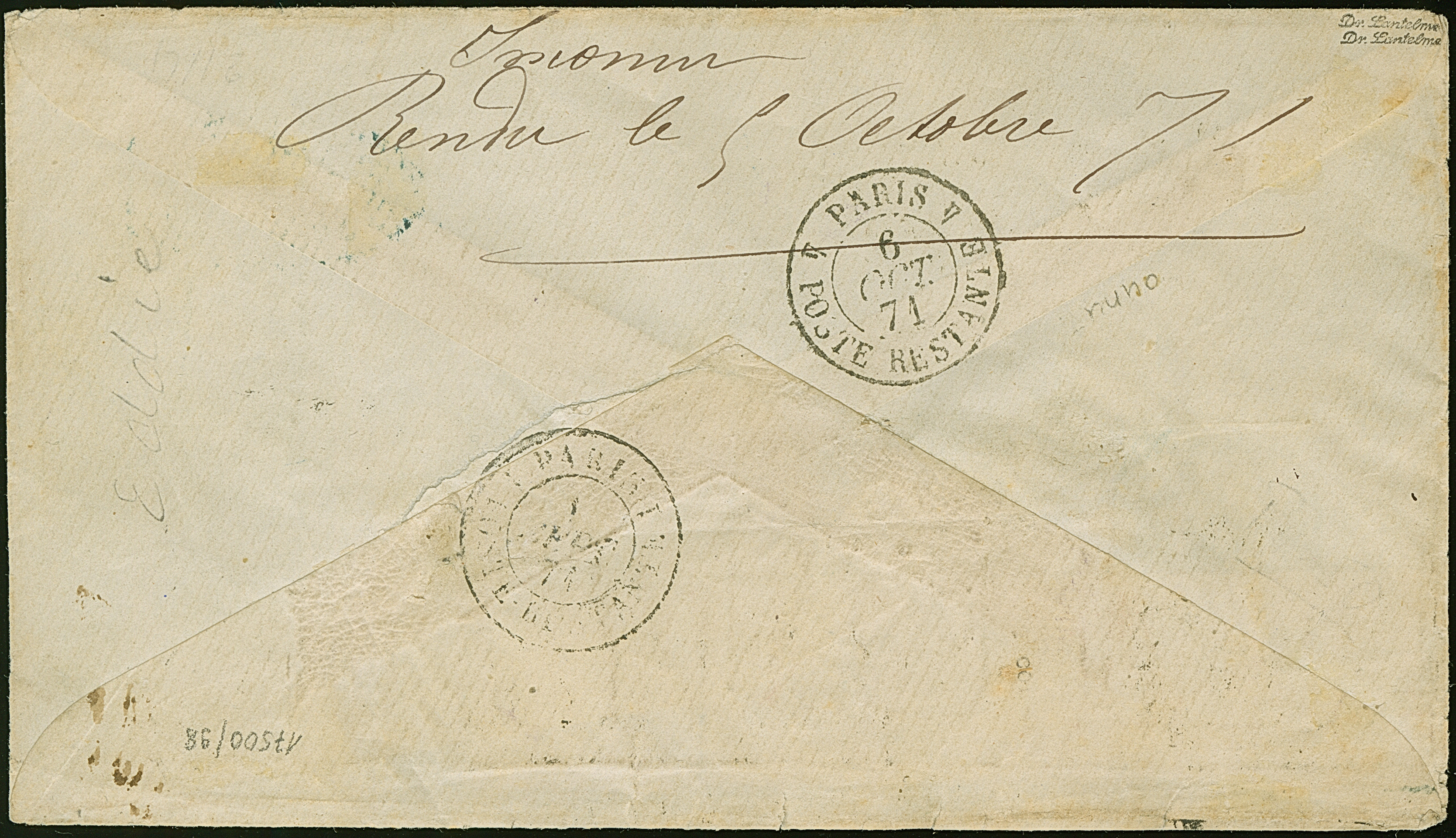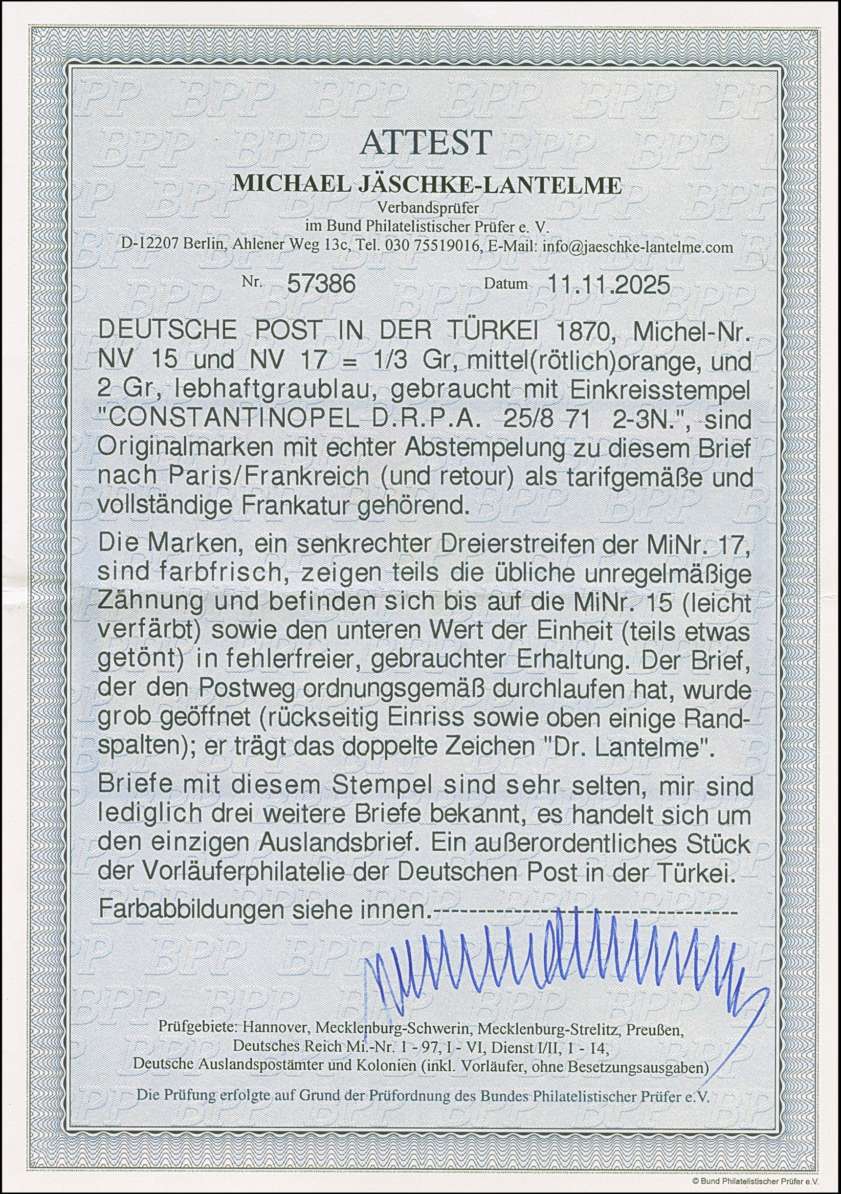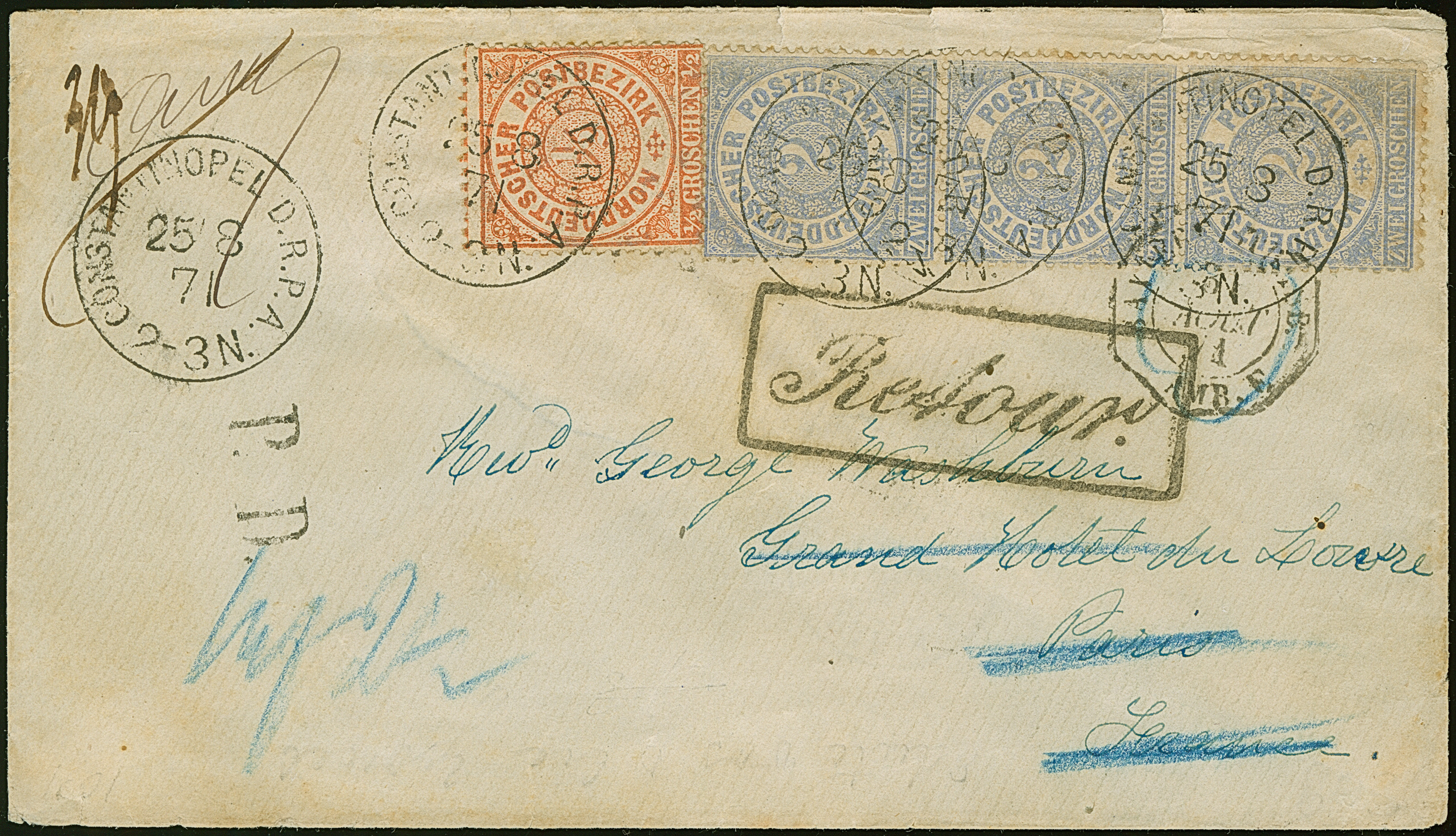 NDP ½ Gr. orange und senkrechter Dreierstreifen 2 Gr. hellgraublau je mit klarem EKr. “CONSTANTINOPEL D.R.P.A. 25.3.71” als tarifgerechte Frankatur mit schwarzem L1 “P.D.” und Weiterfranko-Vermerk “2½” (Groschen) nach Paris mit Ankunftsstempel und zurück mit vorderseitigem Hinweisstempel “Retour.” Die farbfrischen Marken des Dreierstreifen haben zum Teile eine übliche unregelmäßige Zähnung bzw. der untere Wert ist teils etwas getönt und die ½ Gr.-Marke ist leicht verfärbt, ansonsten in einwandfreier Erhaltung. Der erste Reichspoststempel war nur wenige Wochen im Einsatz und ist der seltenste Stempel auf den Vorläufer-Ausgaben und in Verbindung mit dem 6½‑Groschen-Porto nach Frankreich einmalig. Einer der bedeutendsten Briefe aller Vorläufer-Ausgaben und Reichspost-Unikat, doppelt signiert Dr. Lantelme und Fotoattest Jäschke-L. BPP (2025)