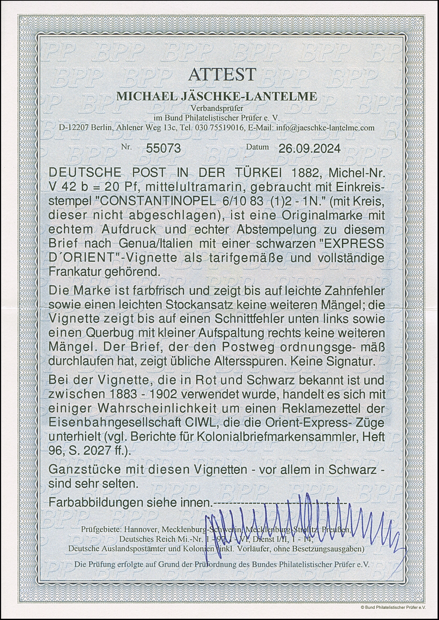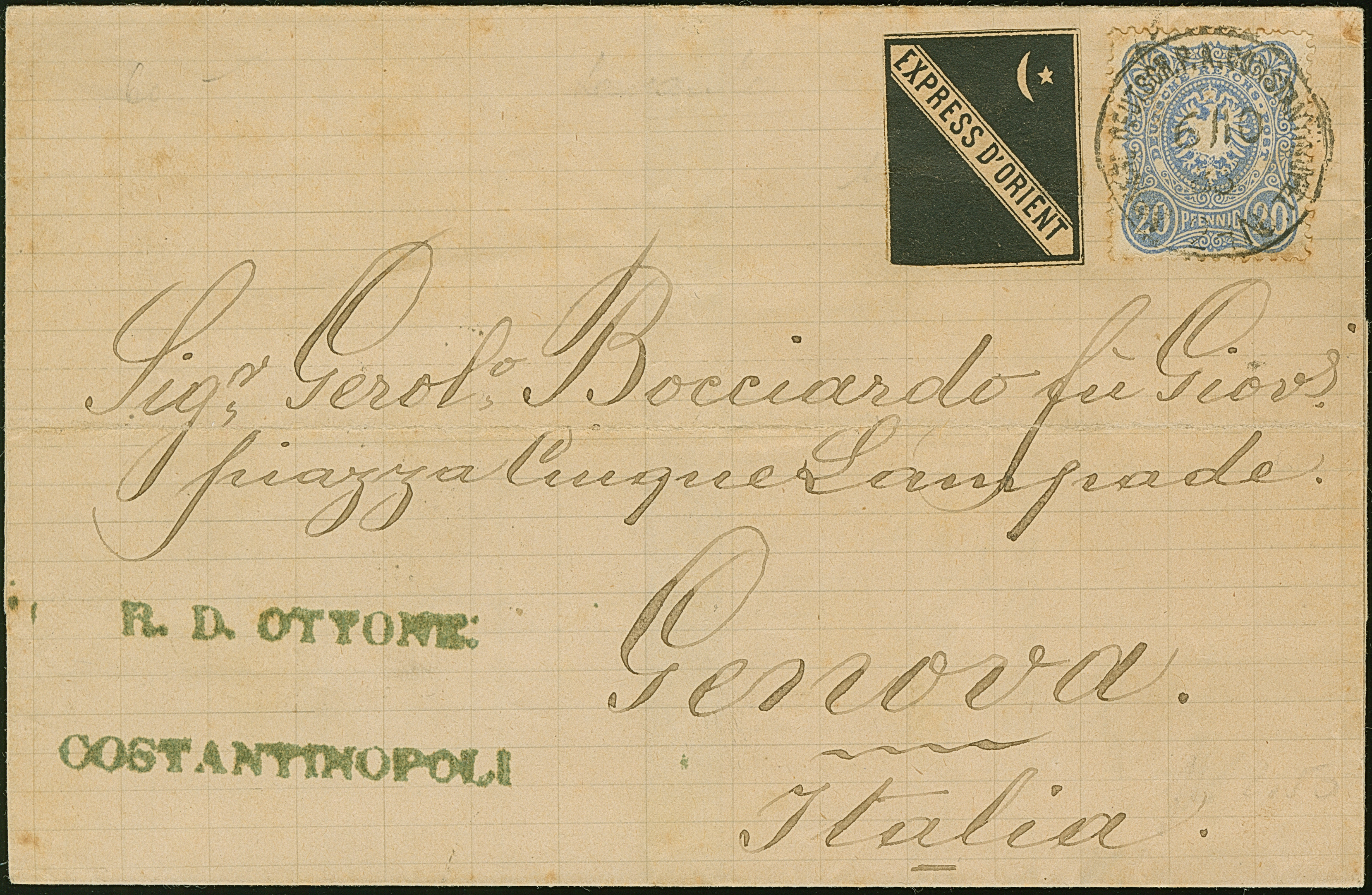 1882, 20 Pfg. mit Stempel “CONSTANTINOPEL 6/10 83 (1)2 - 1N.” als tarifgerechte Frankatur auf Brief mit schwarzer Orient-Express-Vignette nach Genua, Italien mit Ankunftsstempel. Die Marke ist farbfrisch, die Zähnung etwas fleckig und mit leichten Zahnfehlern, die Vignette unten links etwas tangiert, sonst vollrandig, sowie rechts mit Querbug und leichter Aufspaltung, der Umschlag mit üblichen Beförderungsspuren. Trotz der Einschränkungen ein sehr dekorativer Brief mit dem seltenen Reklamezettel in schwarzer Farbe, Fotoattest Jäschke-L. BPP (2024)