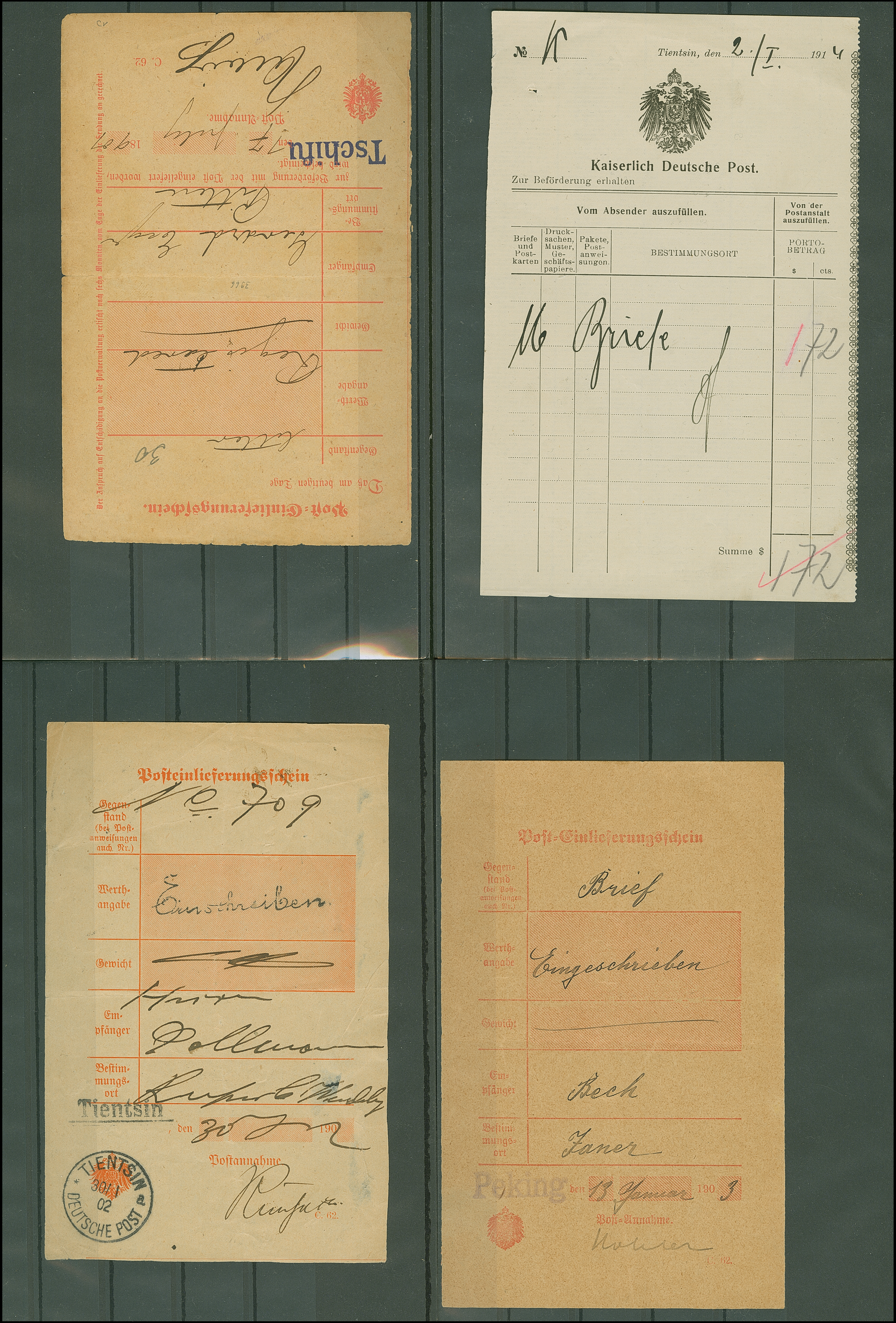 1901/3, drei Post-Einlieferungsscheine mit violettem L1 “Peking” (1903), schwarzem L1 “Tientsin” und EKr. “TIENTSIN DP *a 30.1.02” und violetter L1 “Tschifu” (1901). Dazu Vordruckschein für 16 Briefe mit Portobetrag 1,72 $ ohne Poststempel, datiert “Tientsin, den (2./I.191(4)”. Meist in guter Erhaltung