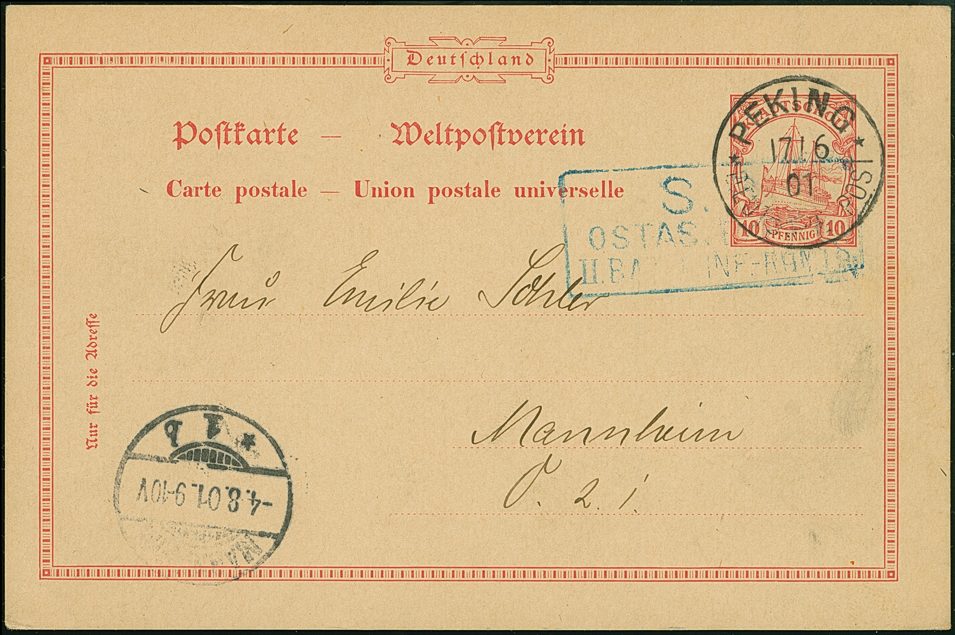 1901, Karte Kiautschou Kaiseryacht 10 Pfg. mit Stempel “PEKING DP 17.6.01” und sehr viel Text sowie Feldpost-Briefstempel nach Mannheim mit Ankunftsstempel, in einwandfreier Erhaltung. Feldpostsendungen waren portofrei, zum Teil wurden für eine vermeintlich schnellere Beförderung auch Ganzsachenkarten benutzt, doppelt signiert Bothe BPP