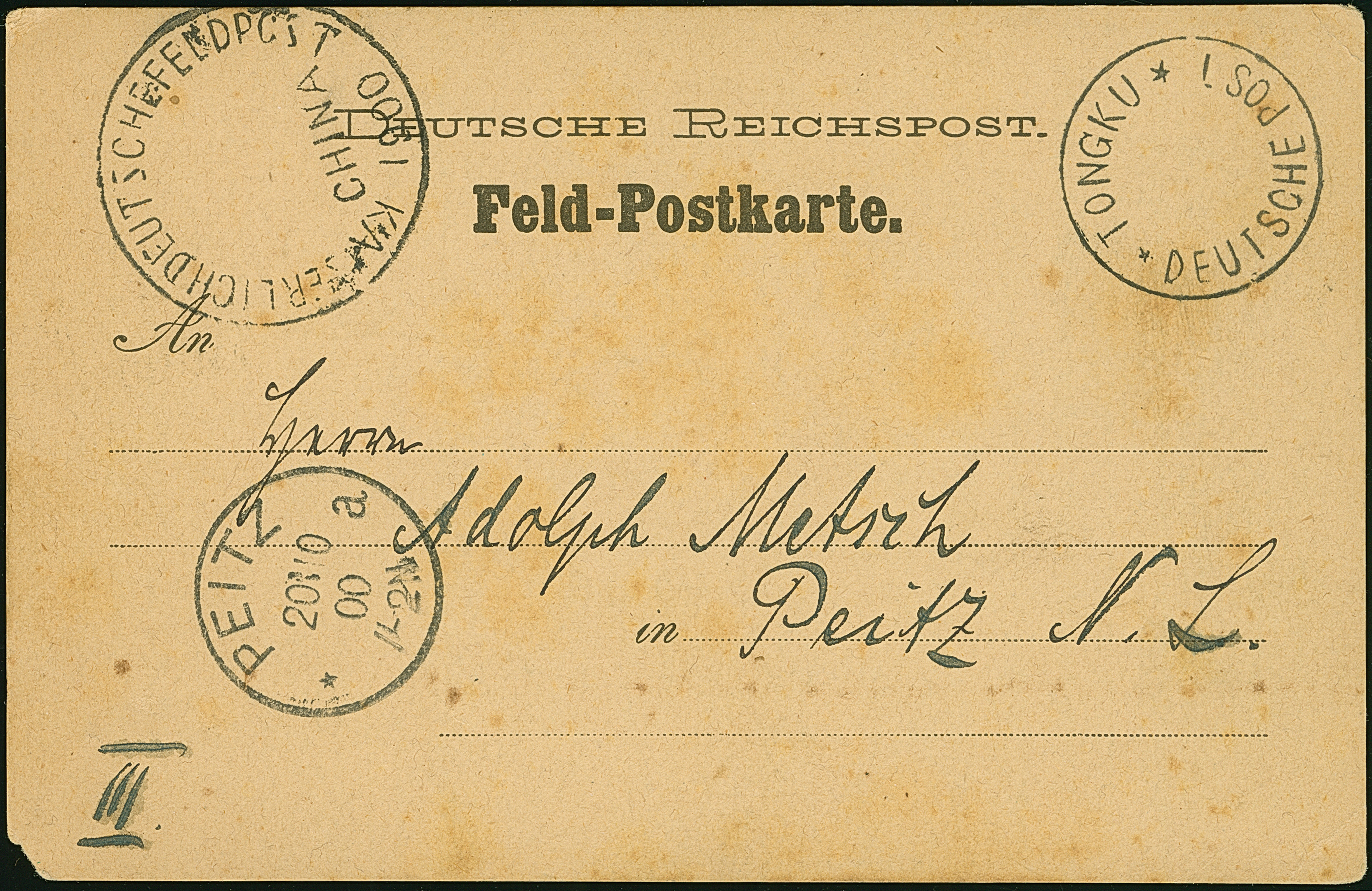 1900, “TONGKU DP **” klar ohne Datum auf Feldpost-Karte mit viel Text und sogenannten Wagenrad-Stempel nach Peitz mit vorderseitigem Ankunftsstempel vom 20.10.00. Die Karte links unten mit kleiner Fehlstelle und etwas fleckig, trotz der Einschränkungen eine seltene Verwendung aus dem Bedarf