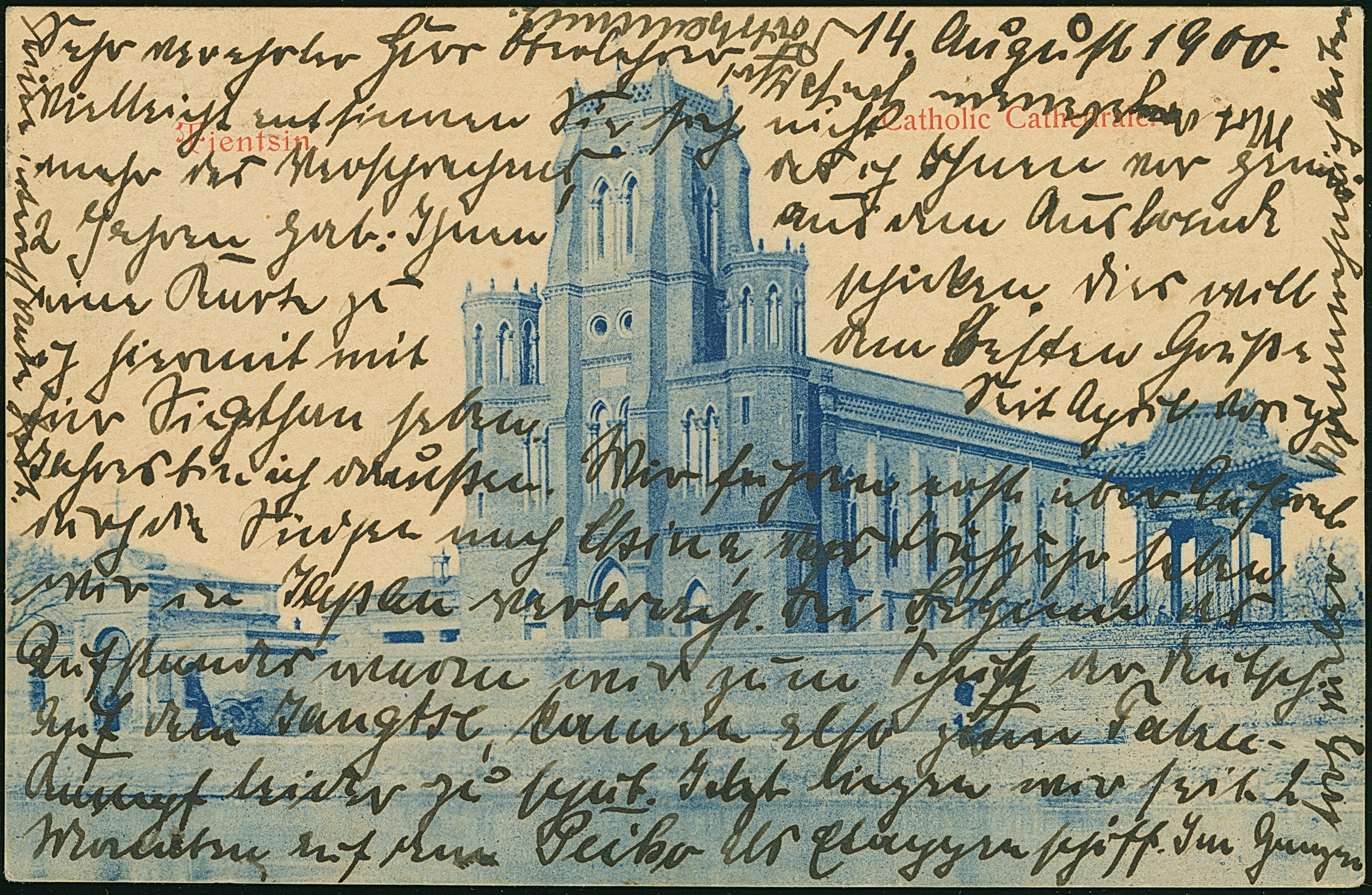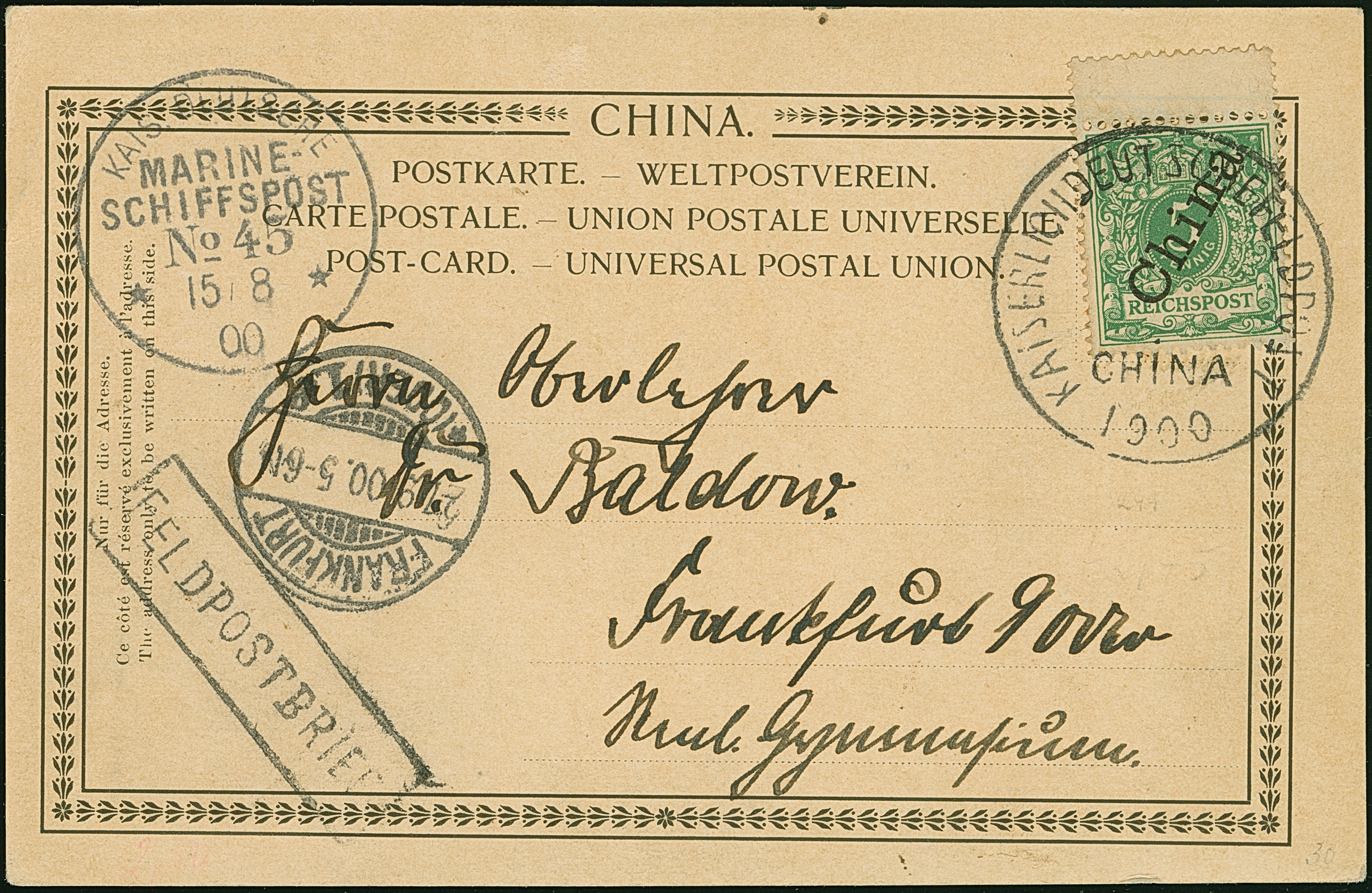 1900, sogenannter Wagenradstempel “KAISERLICH DEUTSCHE FELDPOST CHINA 1900” (Type 2) auf Steilaufdruck 5 Pfg. auf Ansichtskarte mit viel Text und Stempel “MSP No. 45 15.8.00” sowie Rahmenstempel “FELDPOSTBRIEF” nach Frankfurt mit vorderseitigem Ankunftsstempel vom 27.9.00. Die Karte ist rückseitig vom 14.8.1900 datiert und in einwandfreier Erhaltung. Feldpostkarten waren portofrei, die Karte war vermutlich vorfrankiert
