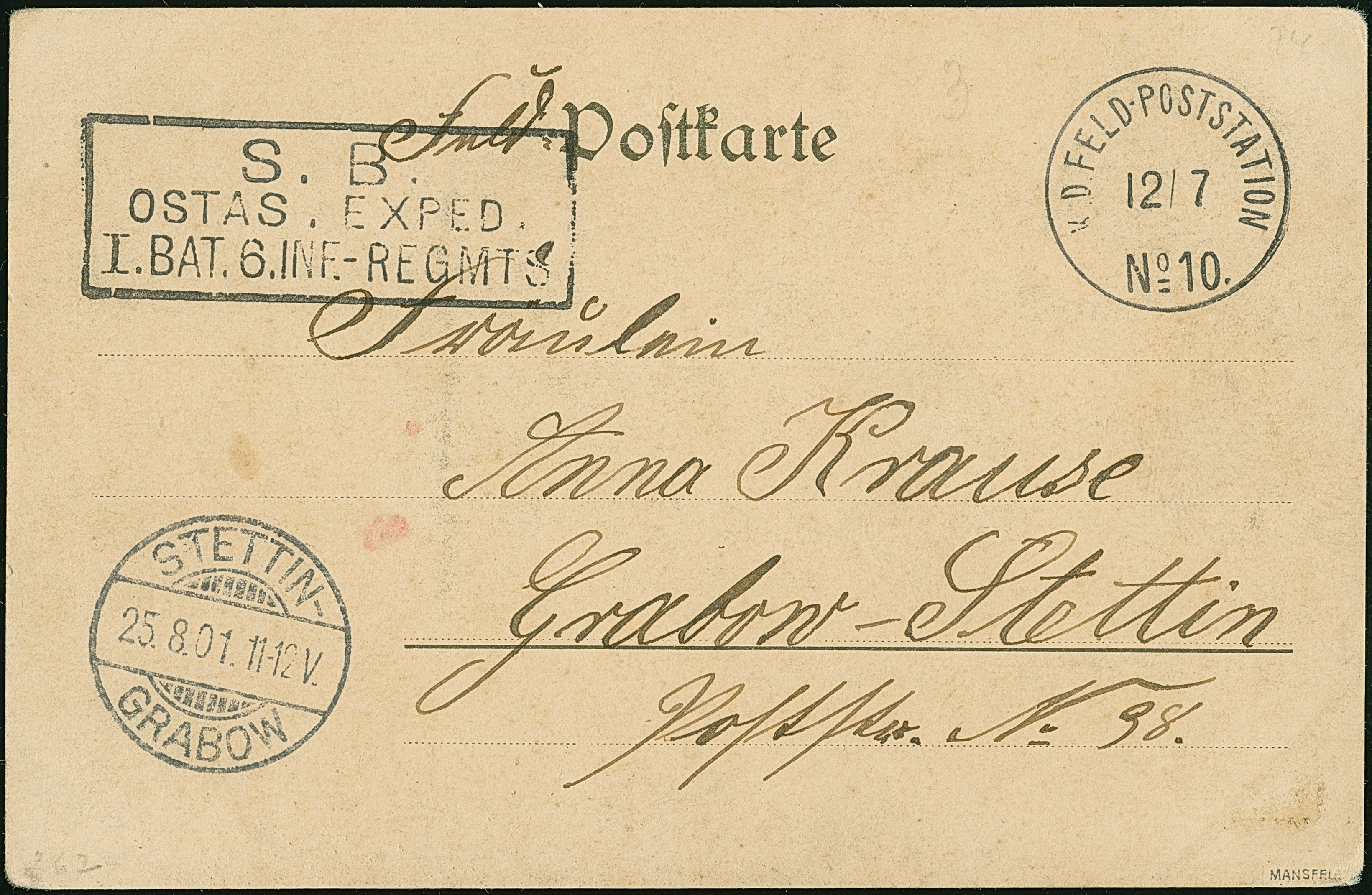 1901, “K.D.FELD.POSTSTATION No. 10 12.7” klar auf Feldpost-Ansichtskarte mit Text nach Stettin-Grabow mit vorderseitigem Ankunftstempel, kleine Randspuren, signiert Mansfeld