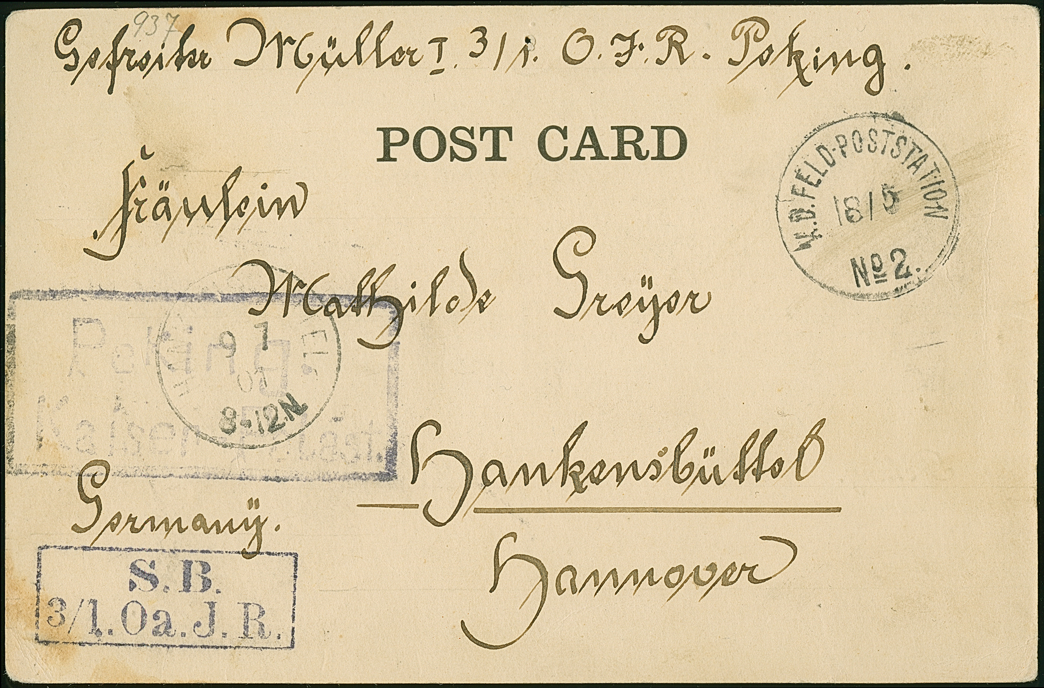 1901, “K.D.FELD.POSTSTATION No. 2 15.6.” klar und Rahmenstempel “Peking Kaiserpalast” etwas schwach auf Feldpost-Ansichtskarte mit Text nach Hankensbüttel mit vorderseitigem Ankunftstempel, kleine Randspuren