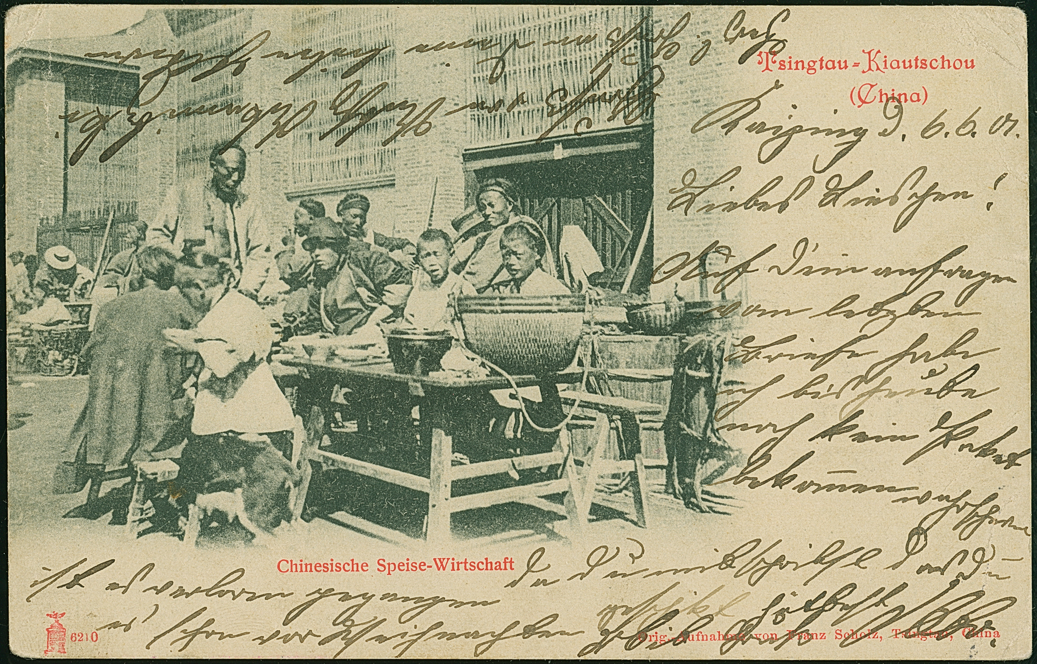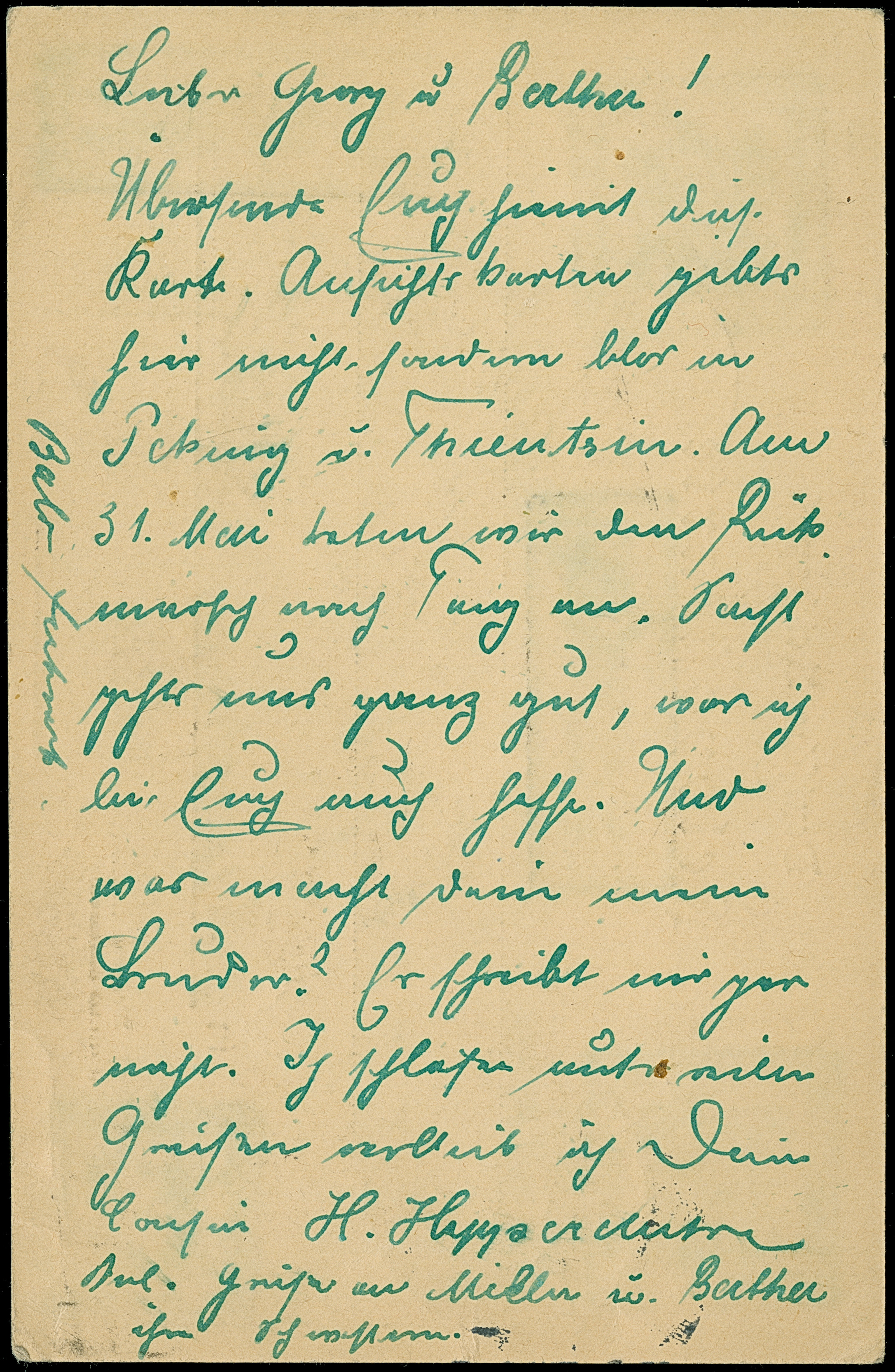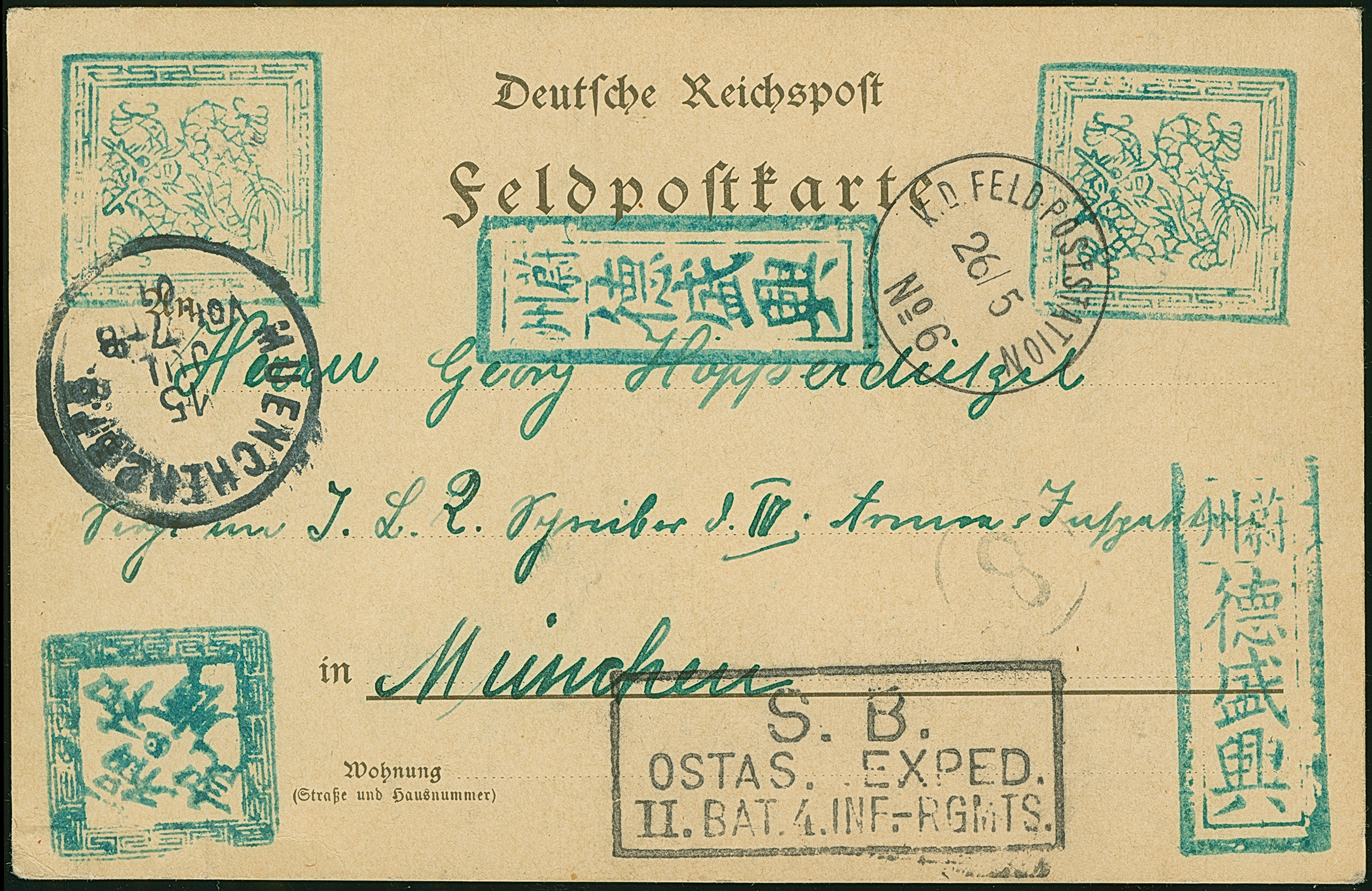 1901, “K.D.FELD.POSTSTATION No. 6 26.5..” klar auf Feldpost-Ansichtskarte mit viel Text und grünen chinesichen Nebenstempeln nach München mit vorderseitigem Ankunftstempel, kleine Randspuren