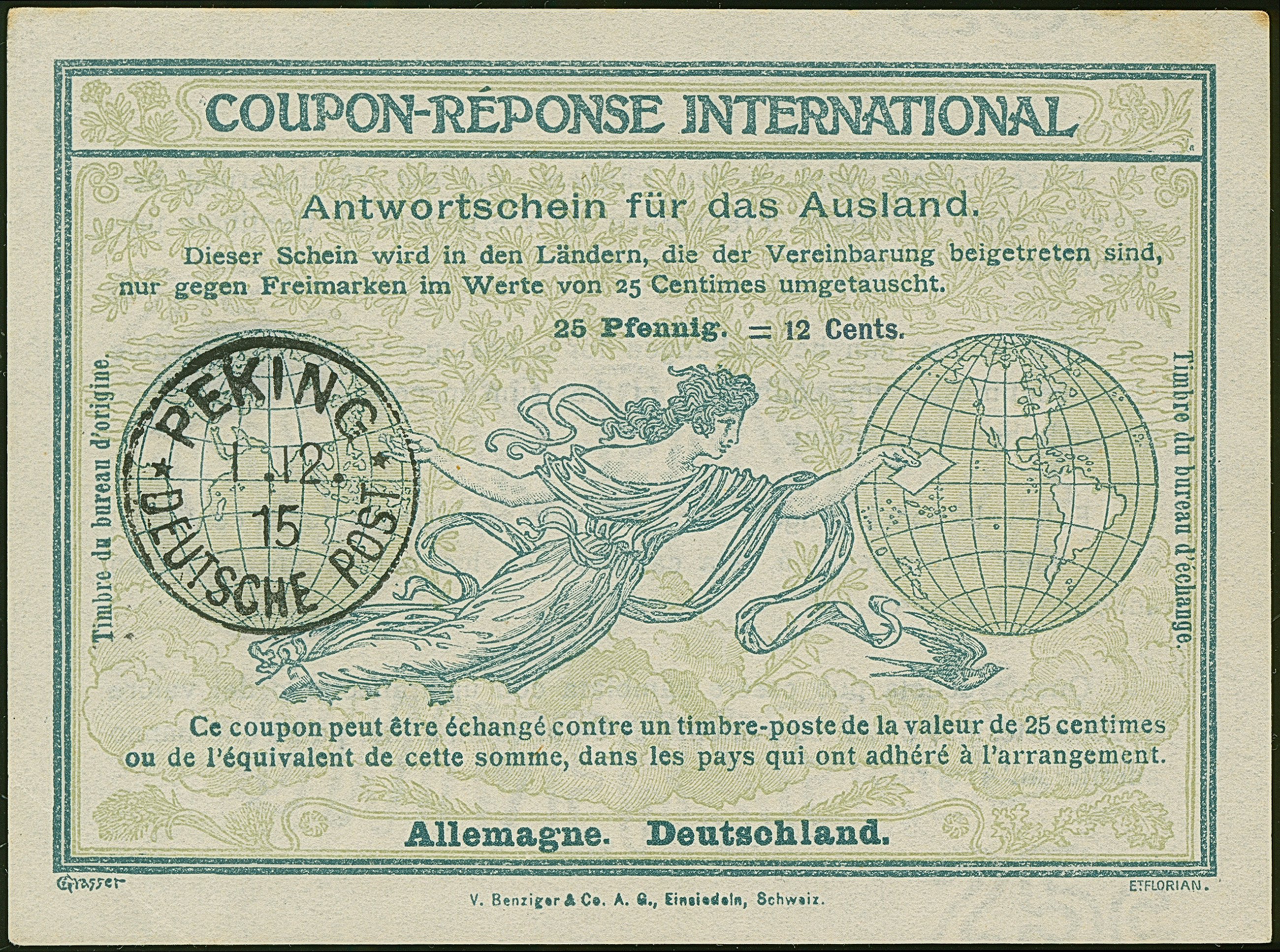 Kriegspost: 1915, Internationaler Antwortschein 25 Pfg. mit Stempel “PEKING DP 1.12.15” in guter Erhaltung