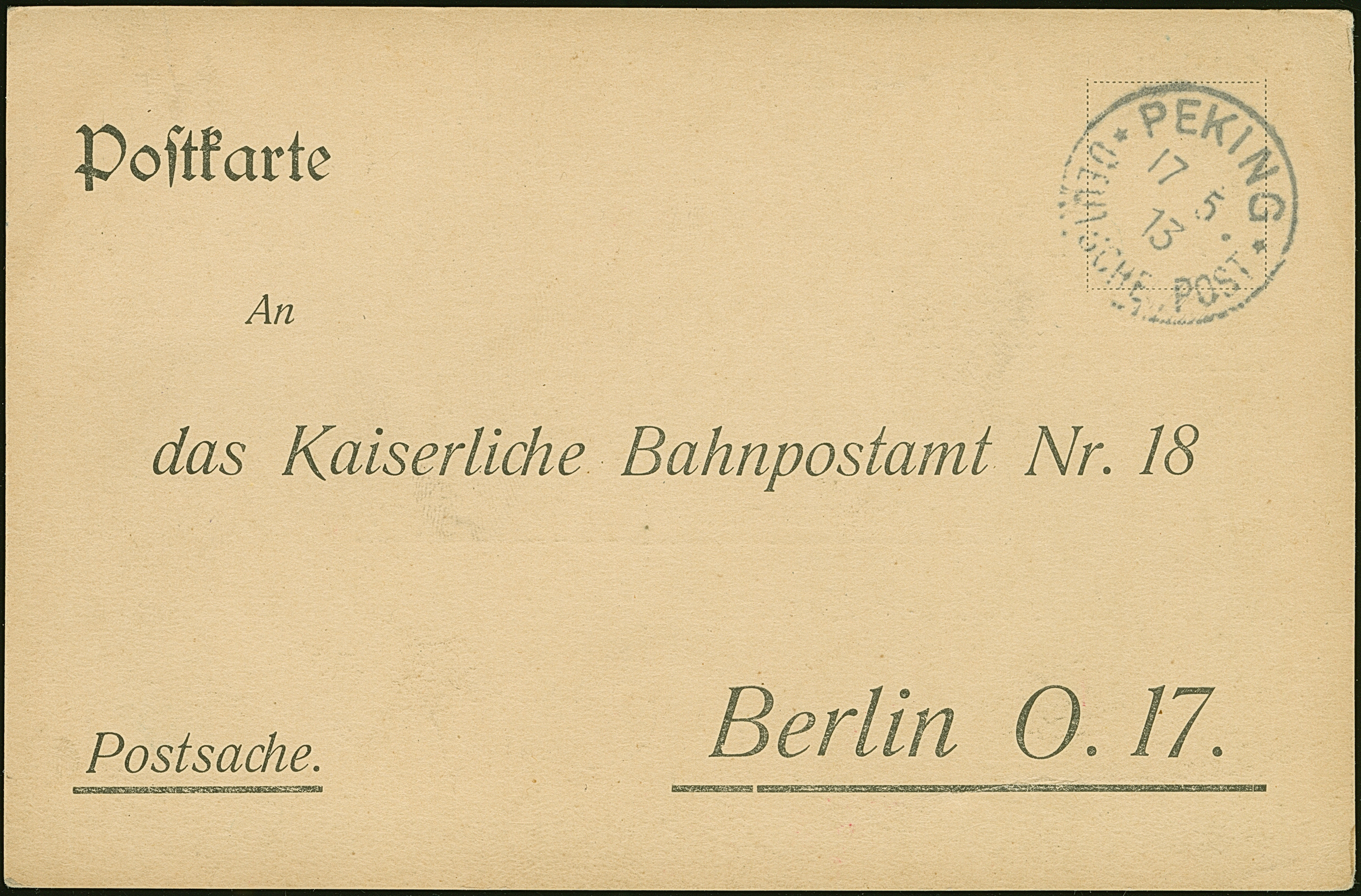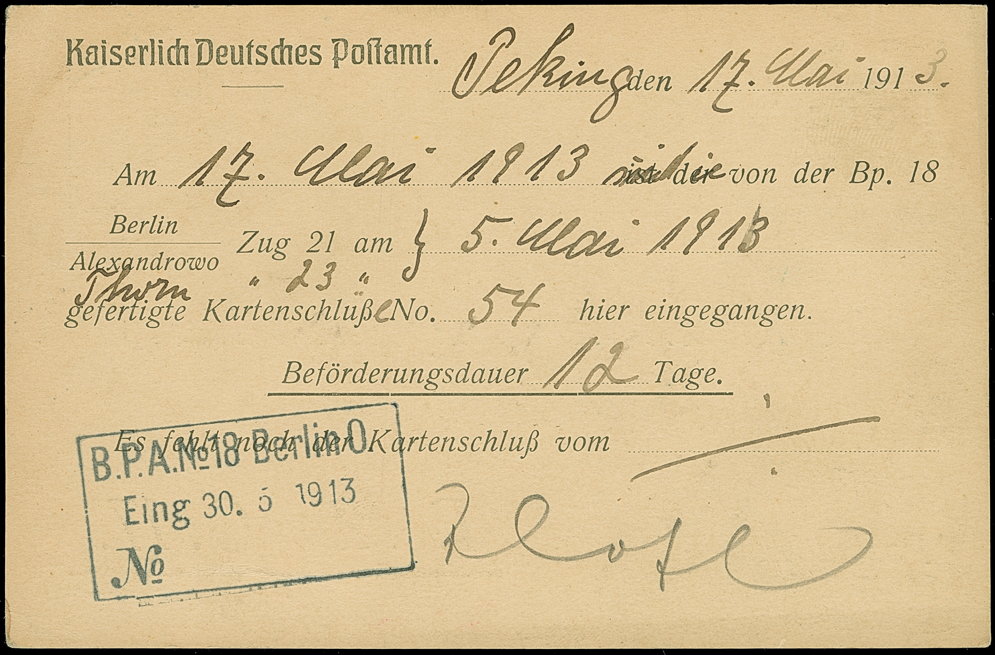 1913, Postsachen-Vordruckkarte zur Laufzeitkontrolle mit Stempel “PEKING DP 17.5.13” an das Kaiserliche Bahnpostamt Nr. 18 in Berlin mit Eingangsstempel vom 30.5.1913 auf der Rückseite, in guter Erhaltung