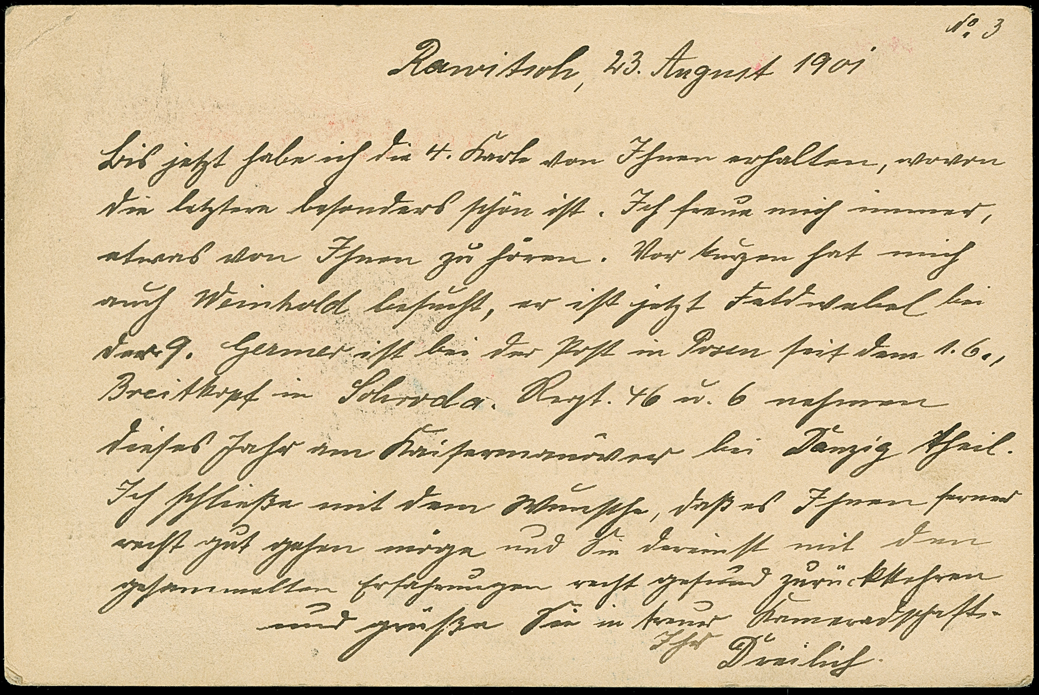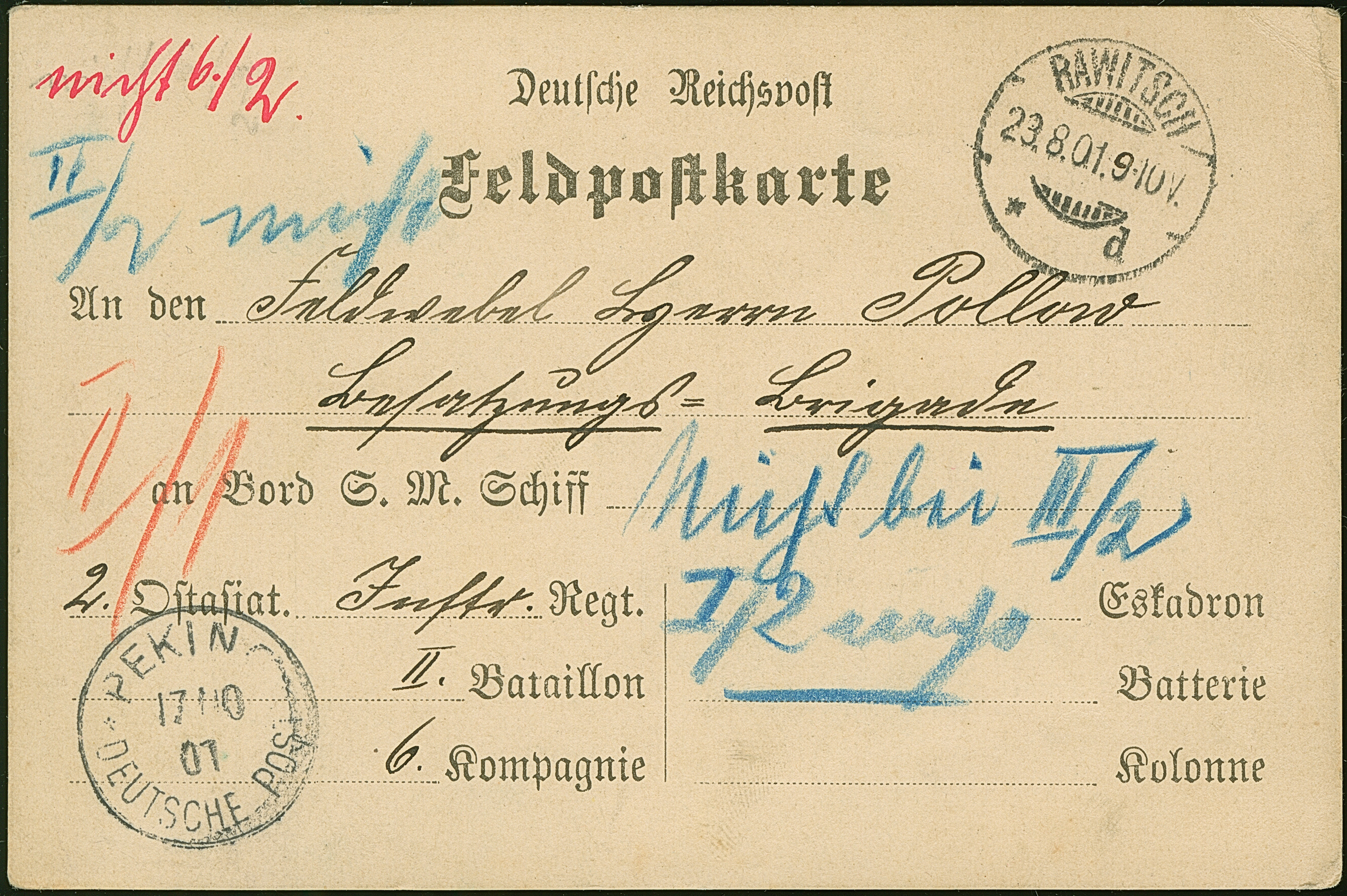 1901, Feldpostkarte-Vordruckkarte aus “RAWITSCH 28.8.01” an einen Feldwebel in China mit Ankunftsstempel “PEKING DP 17.10.01” und verschiedenen Vermerken über versuchte Zustellungen bei verschiedenen Einheiten, in guter Erhaltung