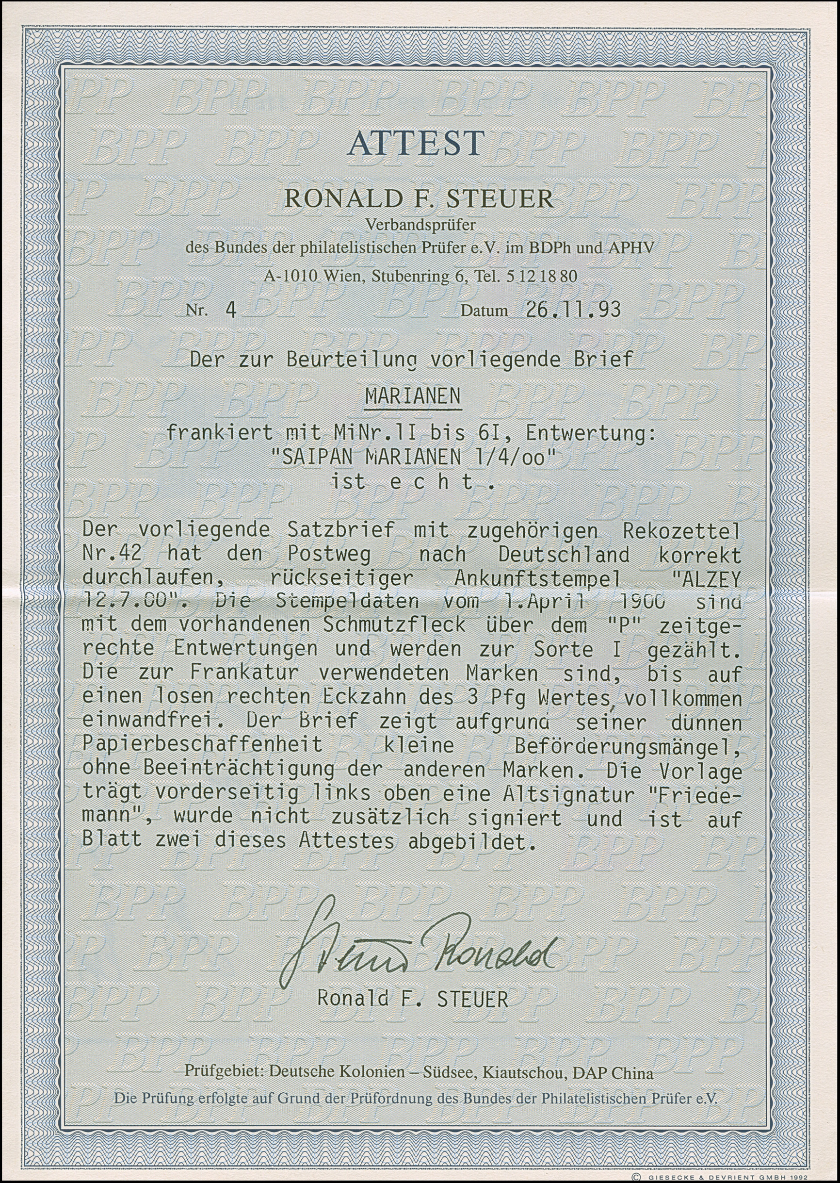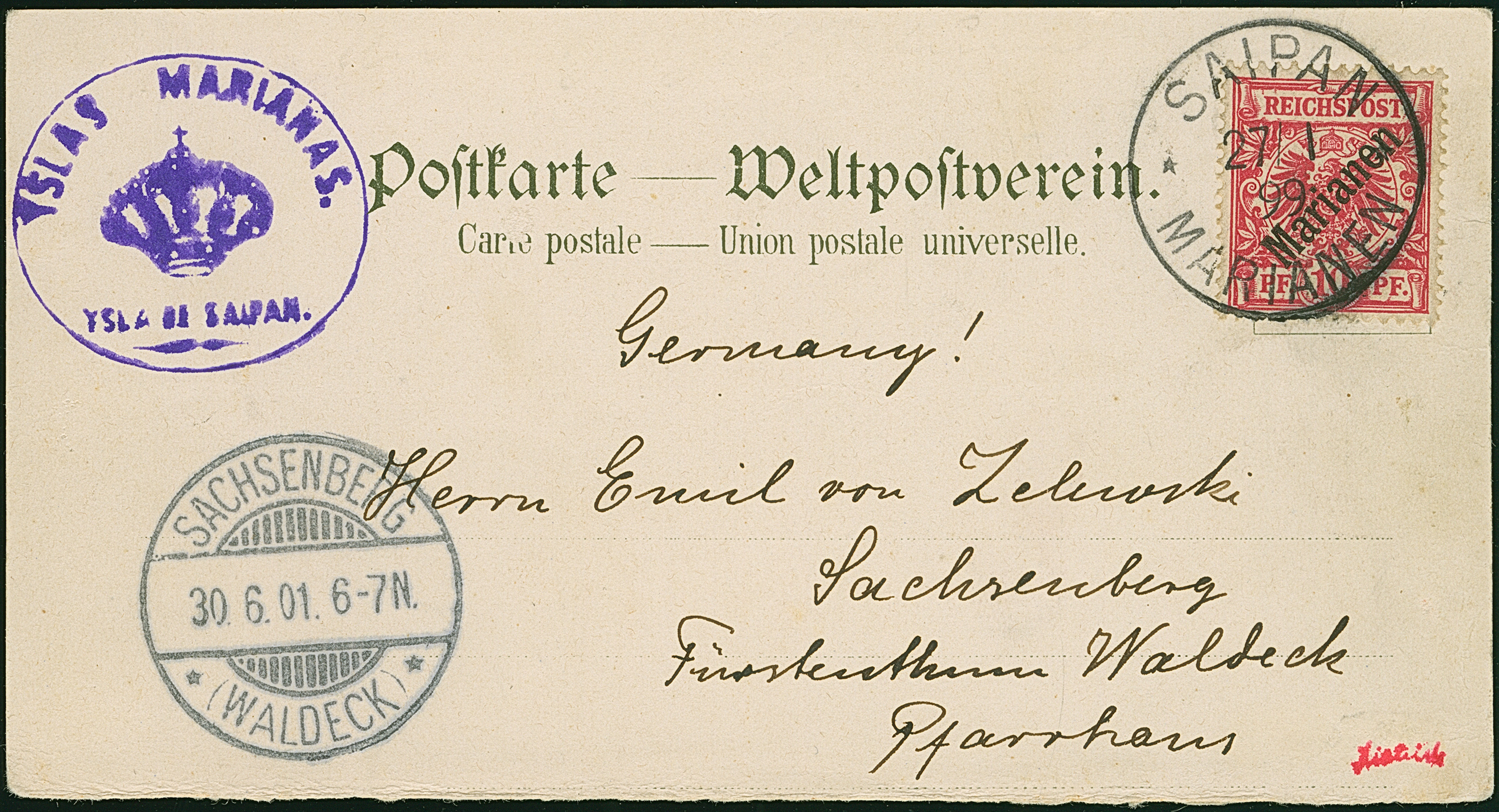 1899/1900, Diagonalaufdruck 10 Pfg. mit Stempel “SAIPAN MARIANEN 27.1.99” (= 27.1.1900) auf oberem Teil einer Speisekarte mit violettem Stempel “ISLAS MARIANS” nach Sachsenberg mit vorderseitigem Ankunftsstempel, in einwandfreier Erhaltung, sign. Dietrich und doppelt signiert R. Steuer BPP