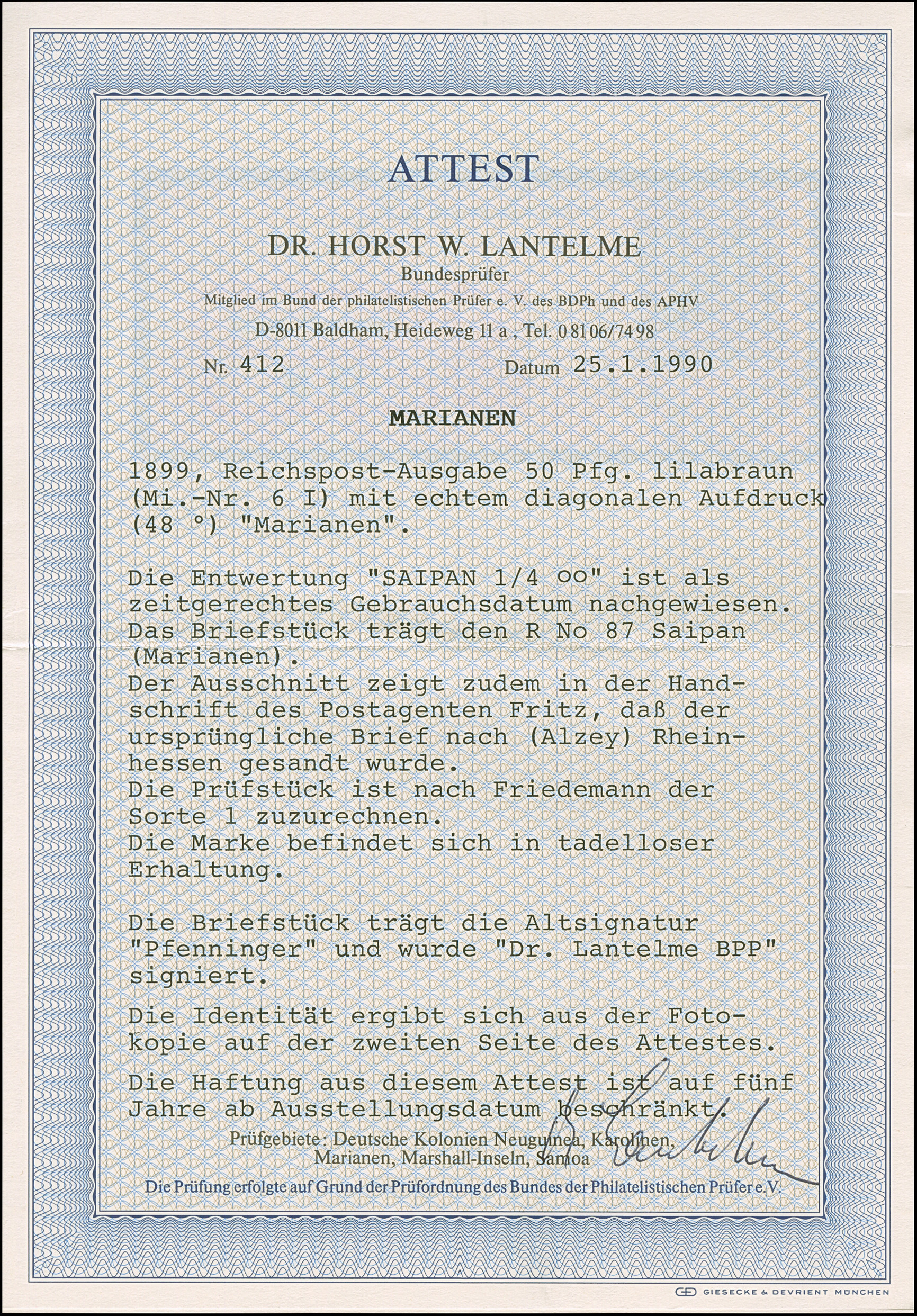 1899/1900, Steilaufdruck 50 Pfg. mit Stempel “SAIPAN MARIANEN 1.4.oo” auf Briefstück mit R-Zettel “Saipan”. Die farbfrische Marke ist gut gezähnt und in einwandfreier Erhaltung. Ein schönes Briefstück mit dieser nicht häufigen Marke, signiert Dr. Lantelme BPP mit Fotoattest (1990)