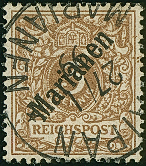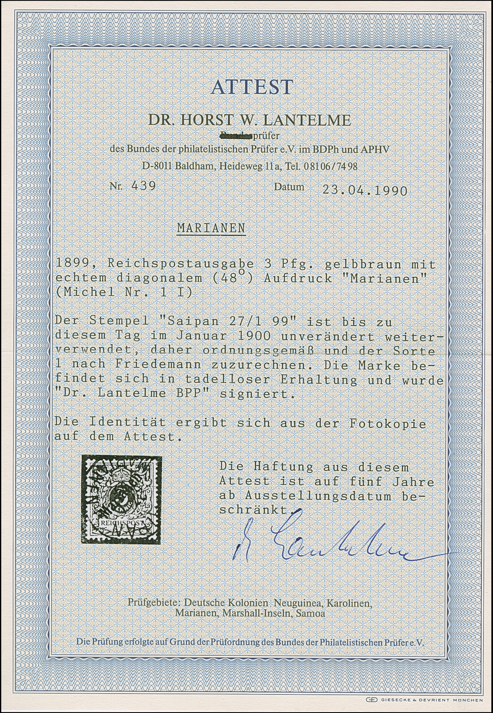1899/1900, Steilaufdruck 3 Pfg. mit Stempel “SAIPAN MARIANEN 27.1.00”, rückseitig mit Tintenspur. Die farbfrische Marke ist in einwandfreier Erhaltung, u.a. signiert Dr. Lantelme BPP mit Fotoattest (1990)